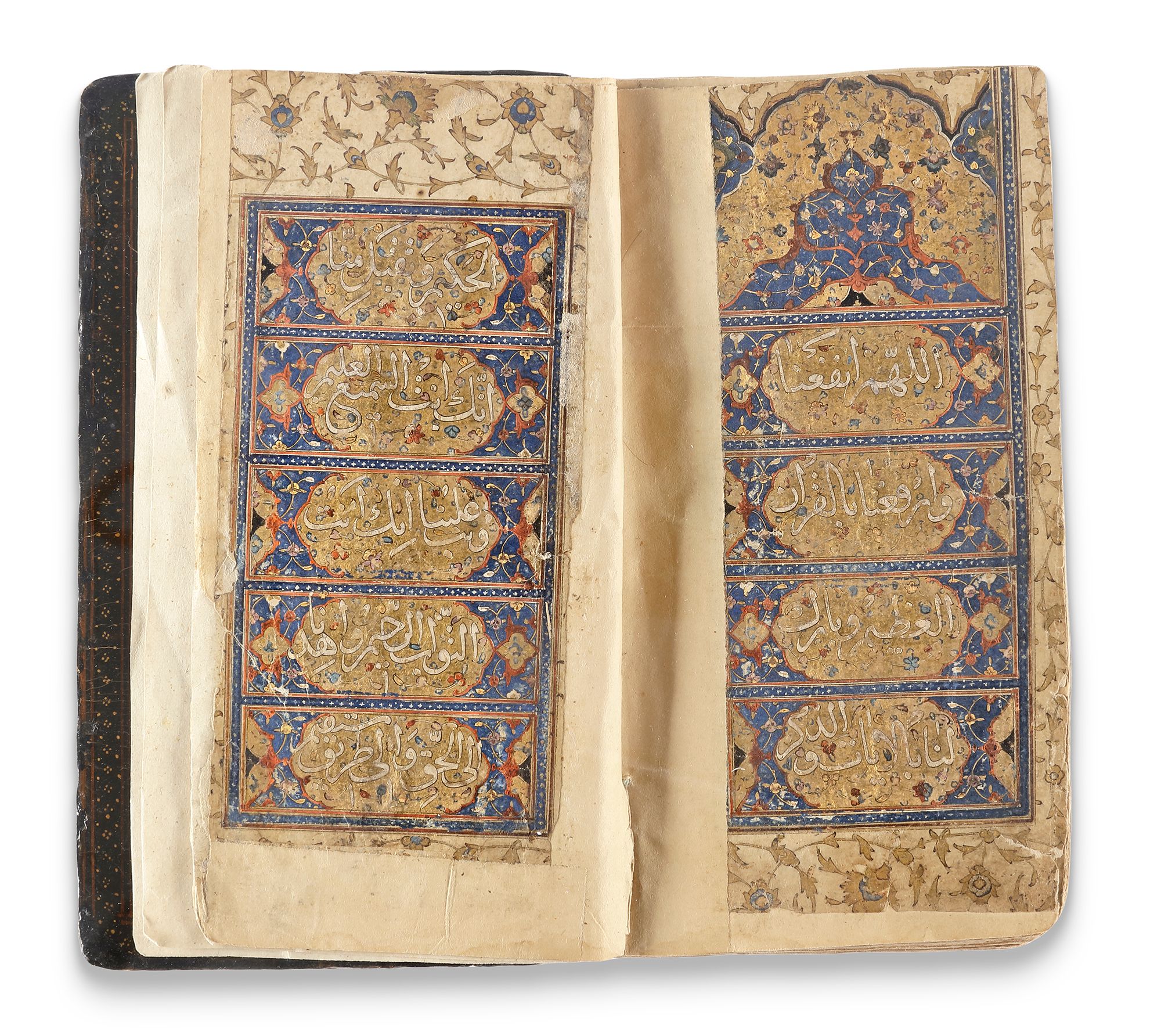 The final four pages contain the Du‘a al-Khatm (prayer for the completion of the Qur’anic recitation), followed by poems arranged in columns and written in nastaliq script on a gilt and polychrome floral illuminated ground.