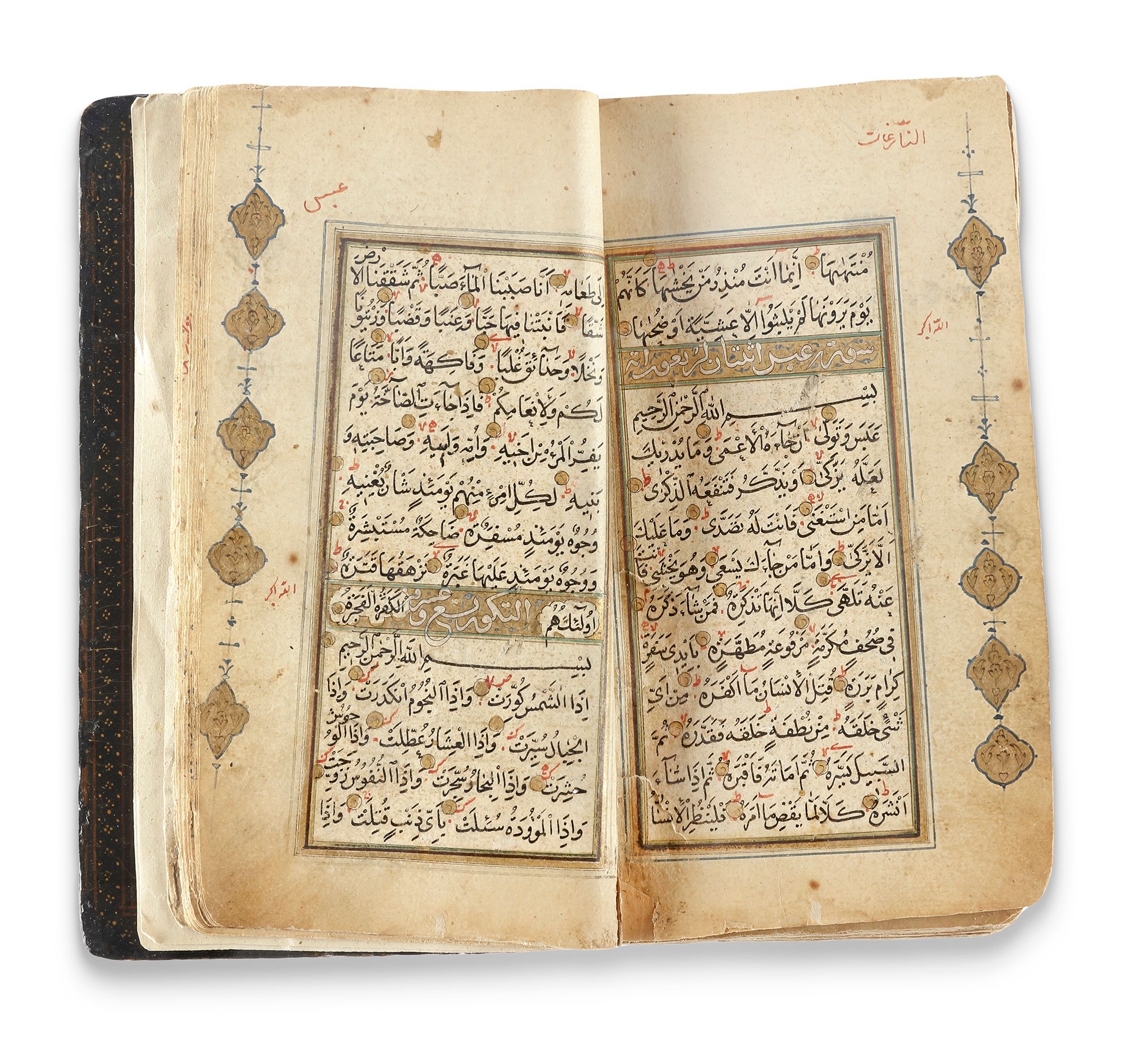 Surah headings are executed in white thuluth script outlined in black, set within cartouches against a polychrome floral illuminated ground. The opening bifolios (fols. 1b–2a) are fully illuminated, featuring six lines of black naskh script inscribed within cloud bands, reserved against a sprinkled gilt background.