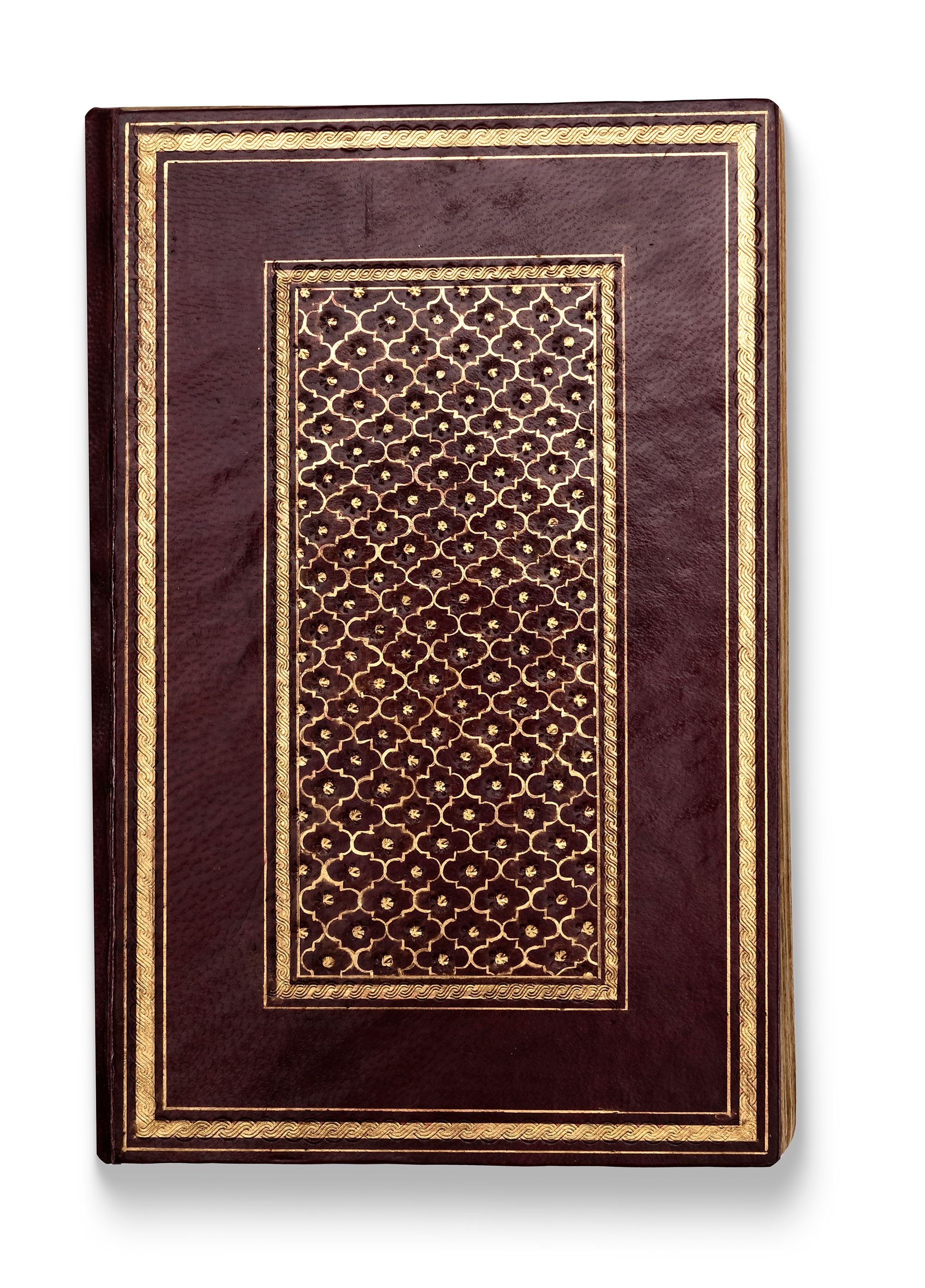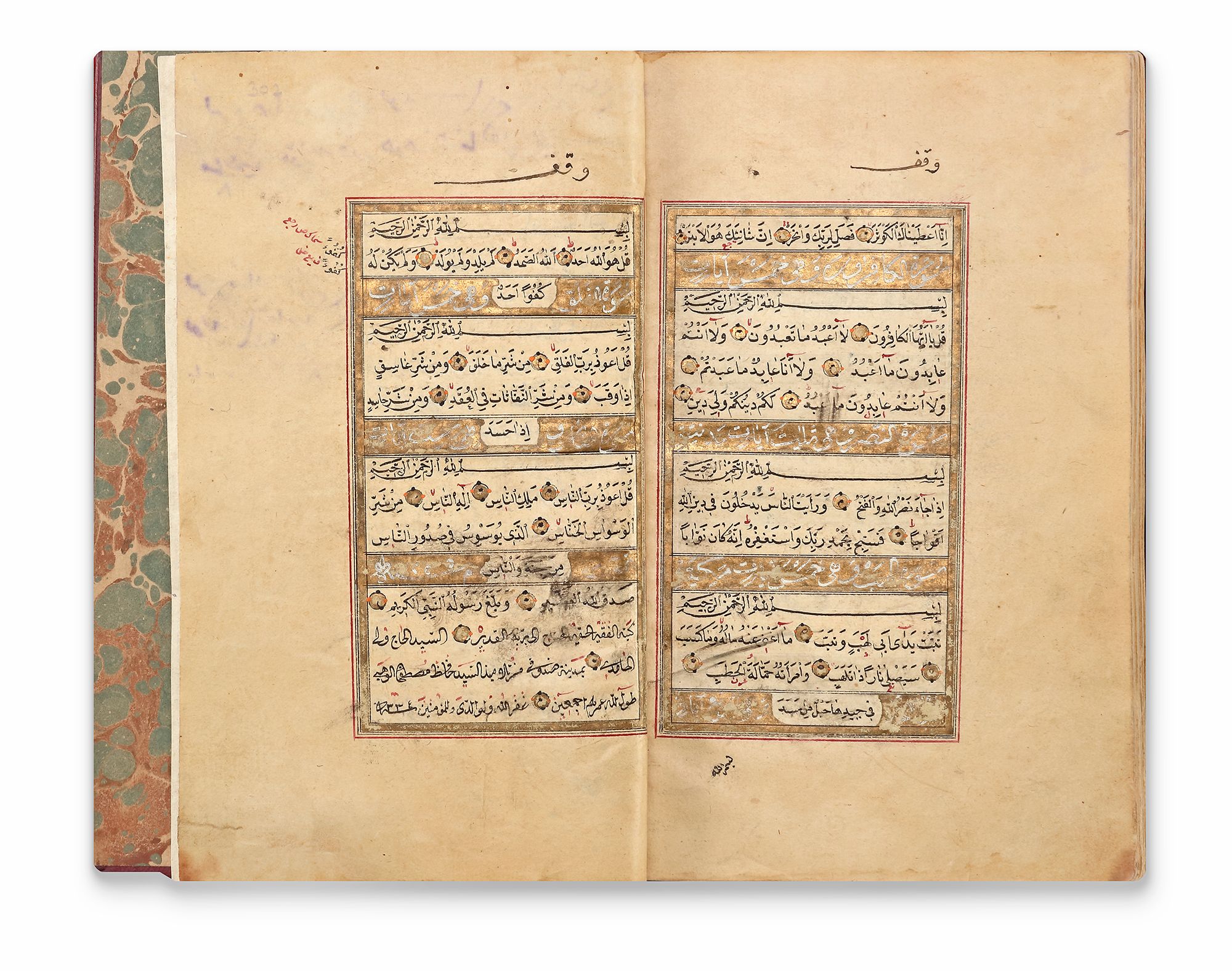 Arabic manuscript on paper, 303 leaves, each folio with 15 lines of elegant black naskh script, diacritics and vowels in red, gold roundel verse markers outlined in black with polychrome dots, large gilt and polychrome floral marginal 'juz' and hizb medallions', occasional marginal commentaries, text within gold and polychrome rules. Surah headings in white thuluth script on an illuminated ground, two opening bifolia fully illuminated in gold and polychrome framing 7 lines of black naskh script in clouds reserved against a sprinkled gilt ground. The last page with a prayer for completion of the recitation of the Quran (Dua'a al-khatm) and signed 'written by el-Sayyid al-Hajj Wali al-Hamedi, student of Mustafa Vehbi and dated 13334AH'.