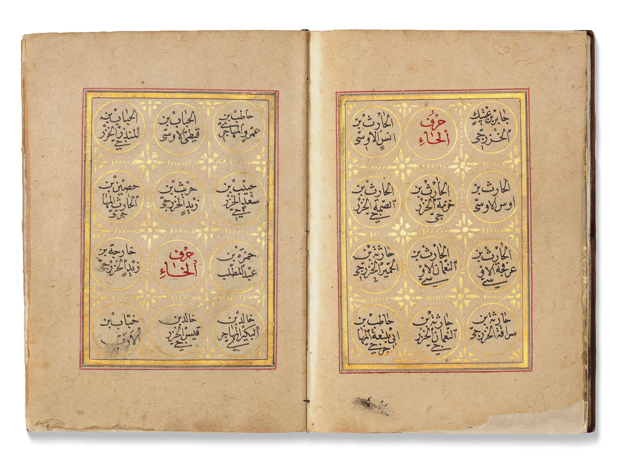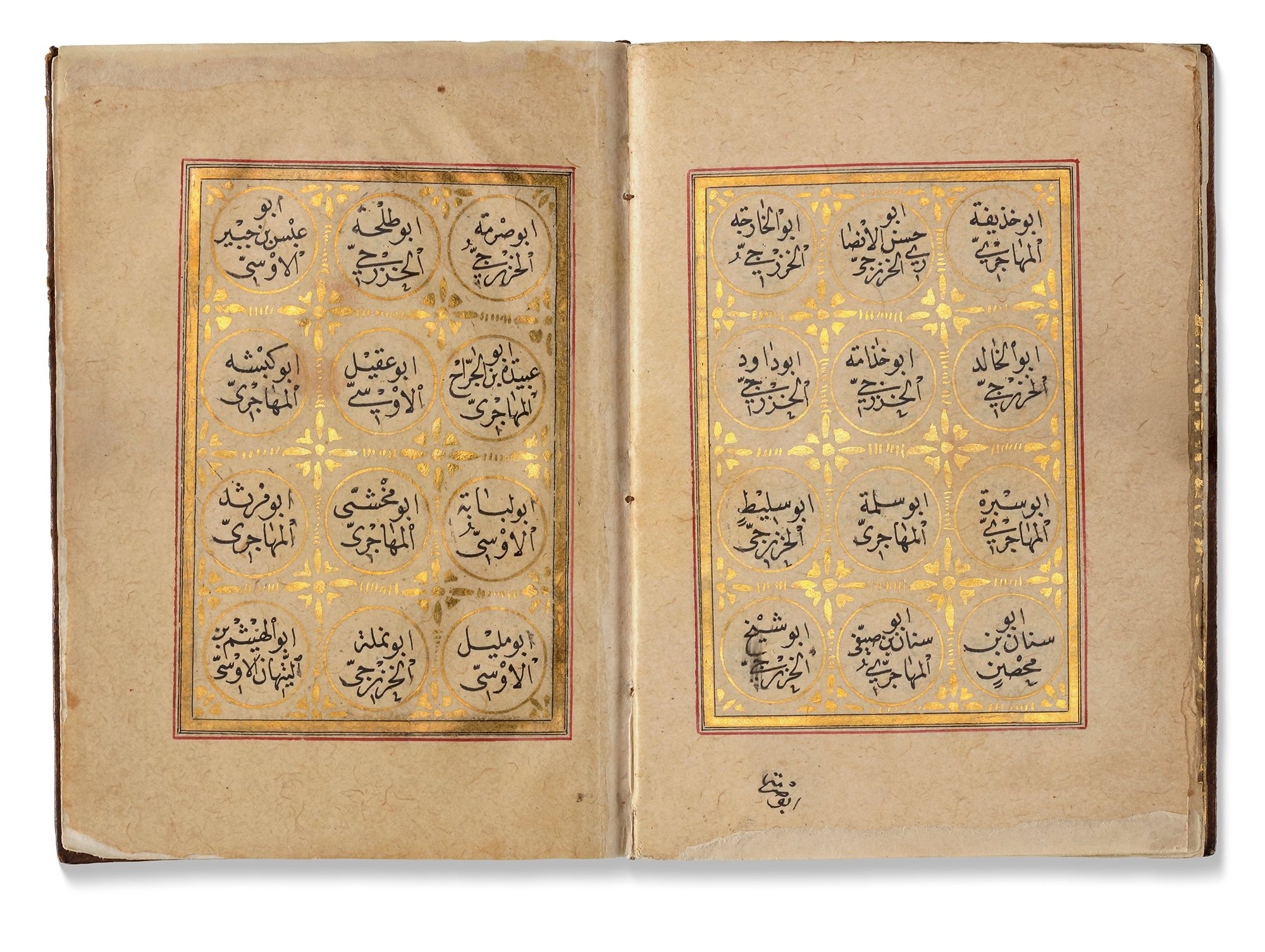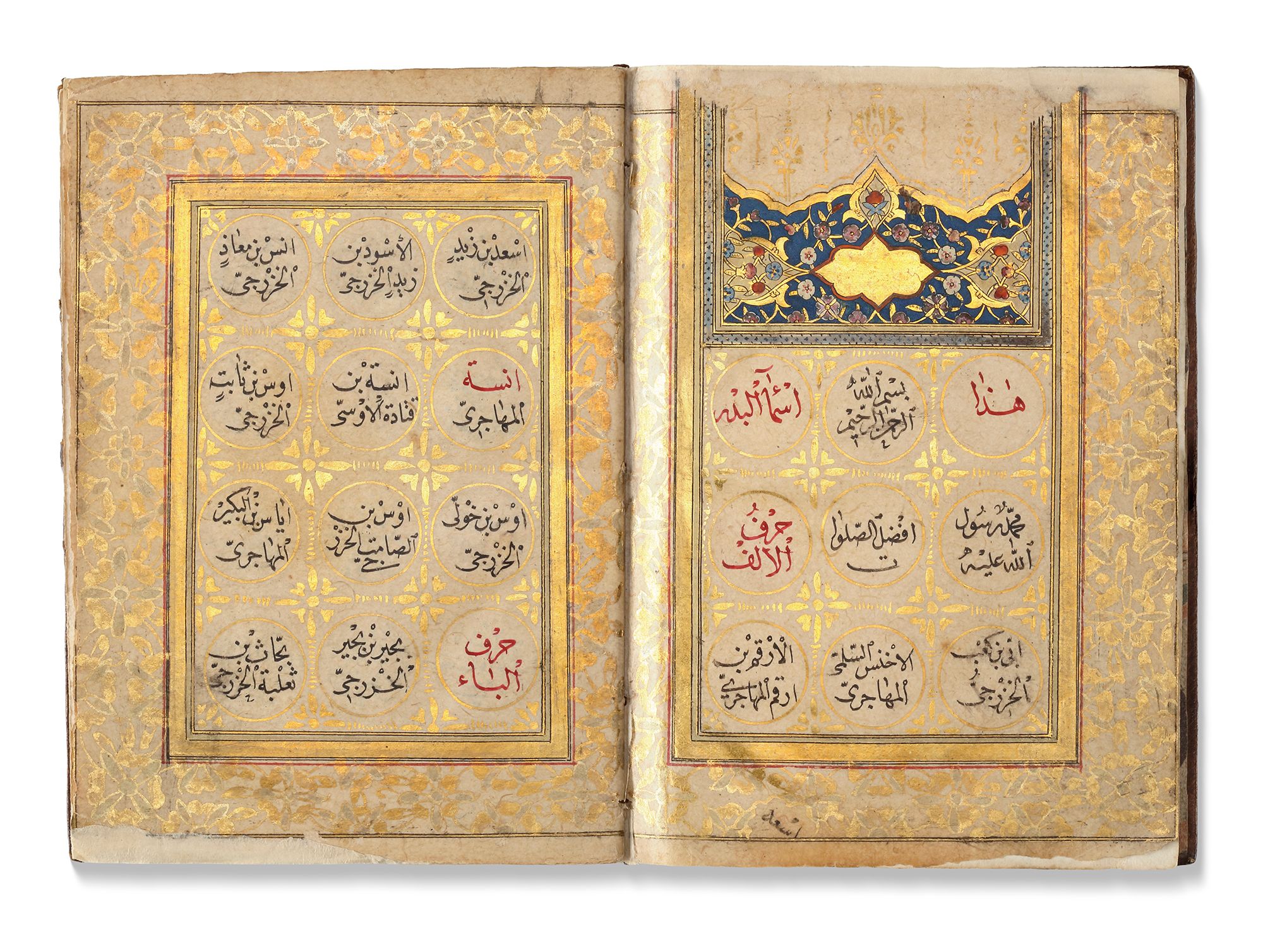 The manuscript is richly adorned with wide floral gold borders, and several pages feature boxed gold embellishments that highlight the names of the Companions. Chapter headings are illuminated in lapis blue and gold leaf, accentuated with delicate floral motifs.