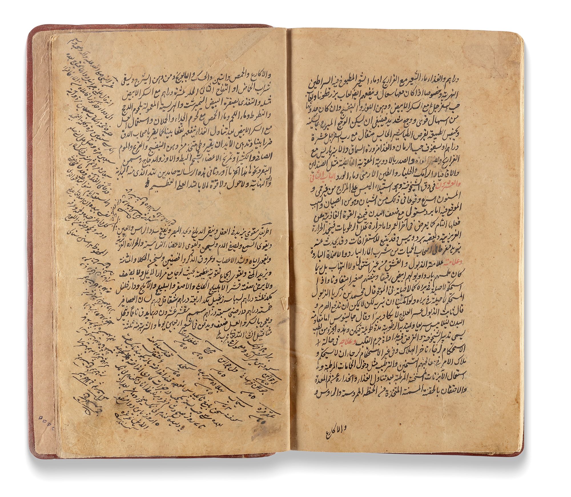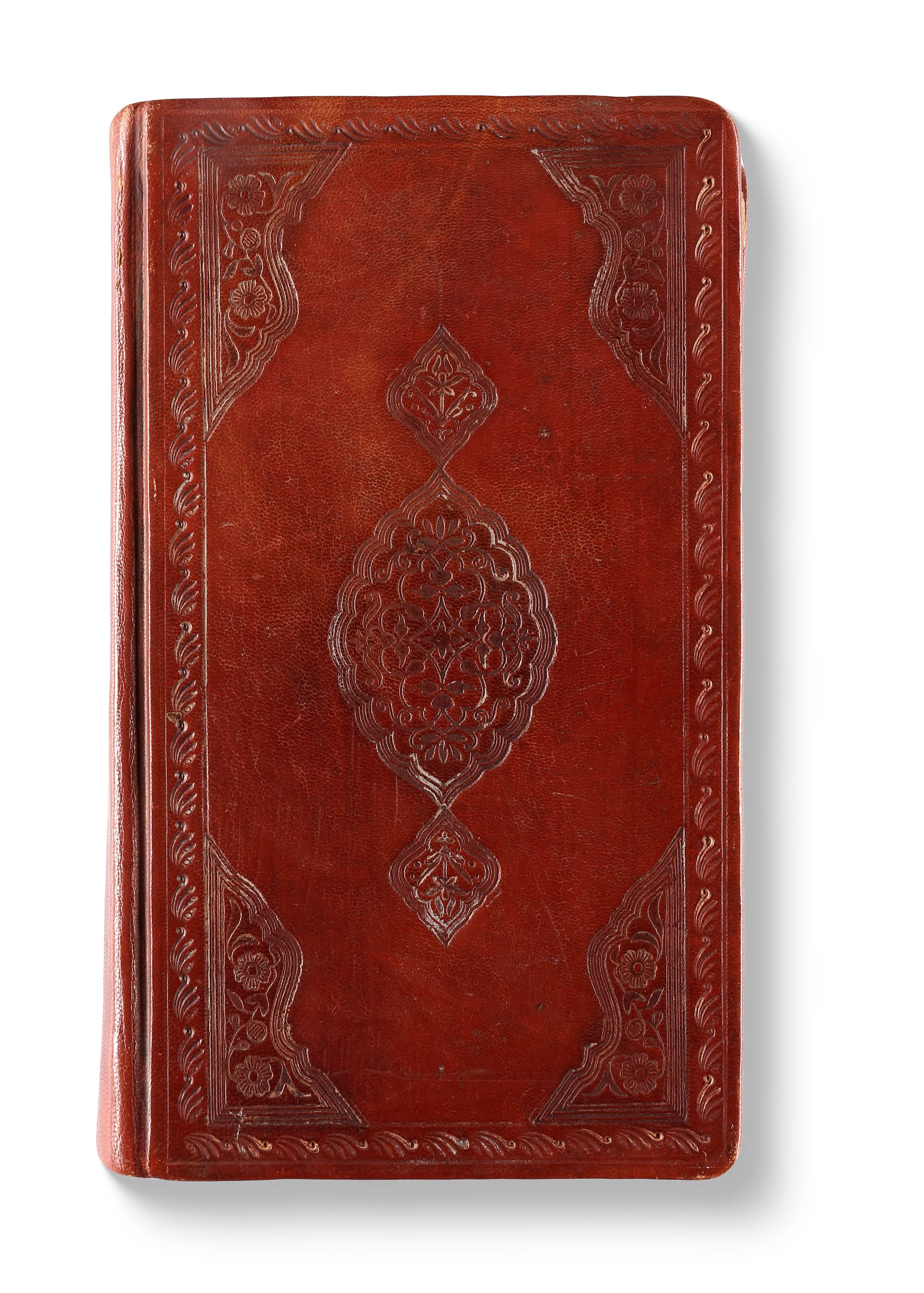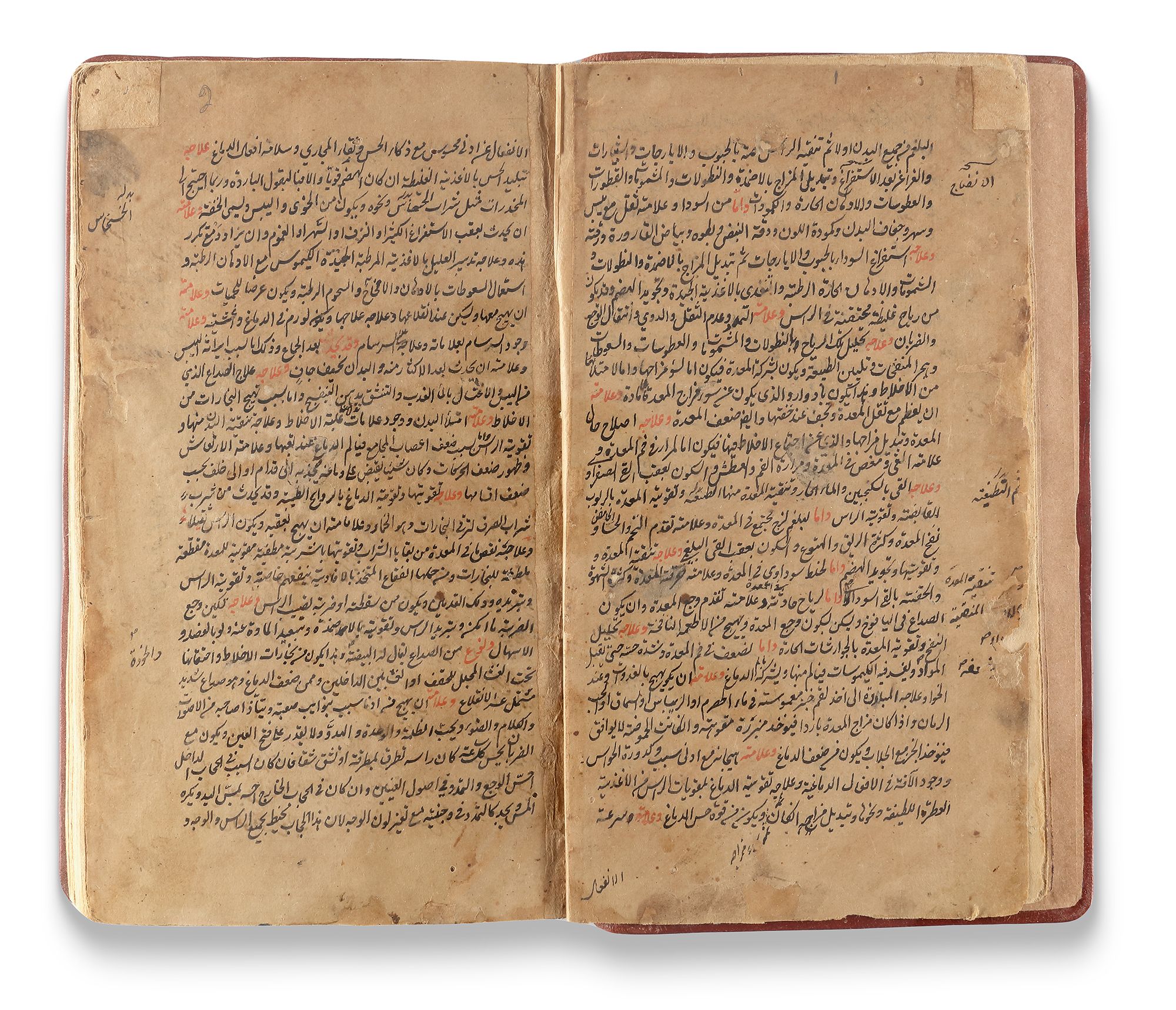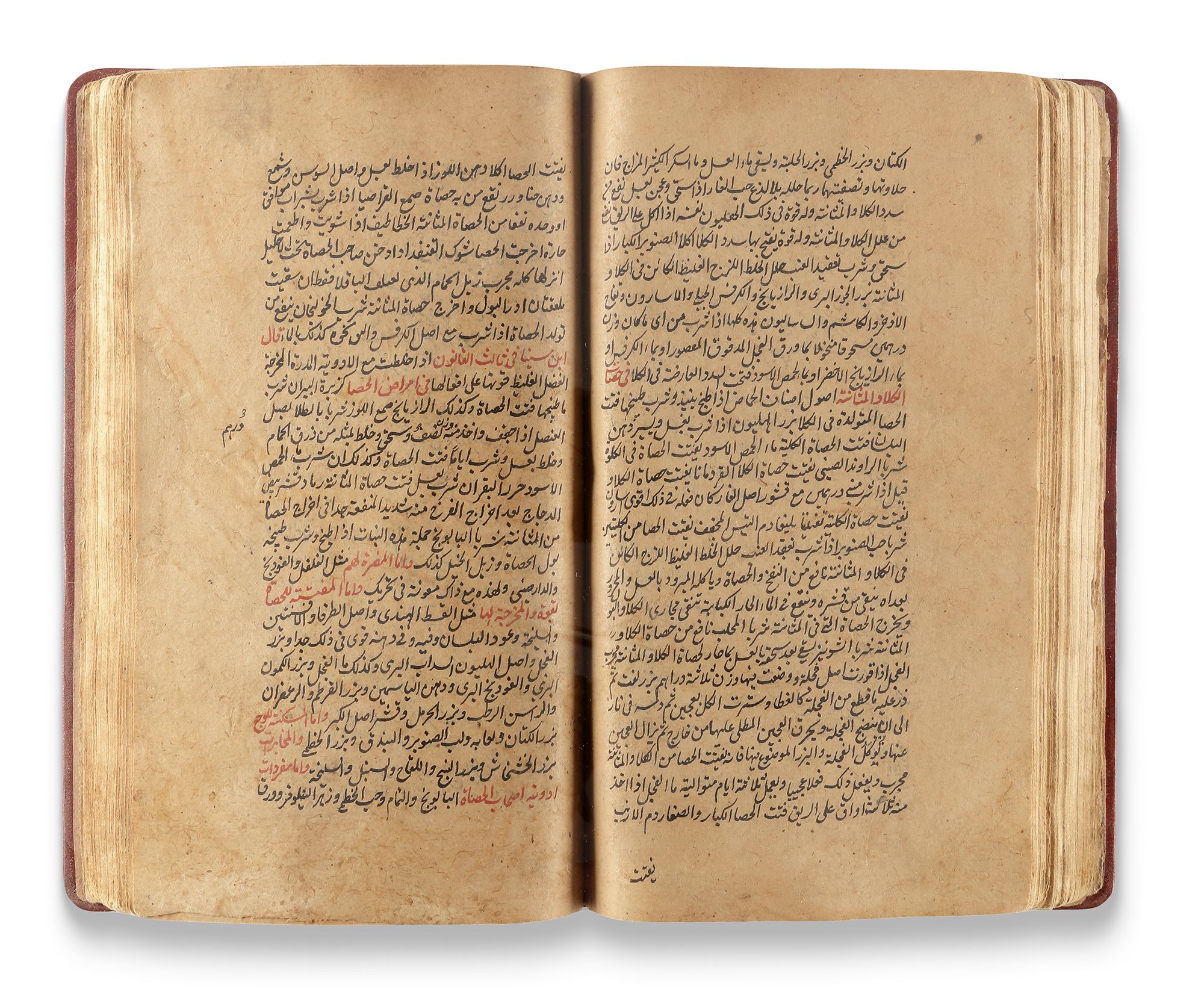 Arabic manuscript on paper, each page written in 25 lines of black ink, with titles and catchwords in red ink. Housed in deep red leather binding.