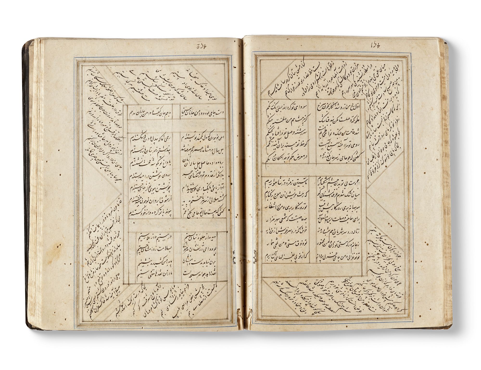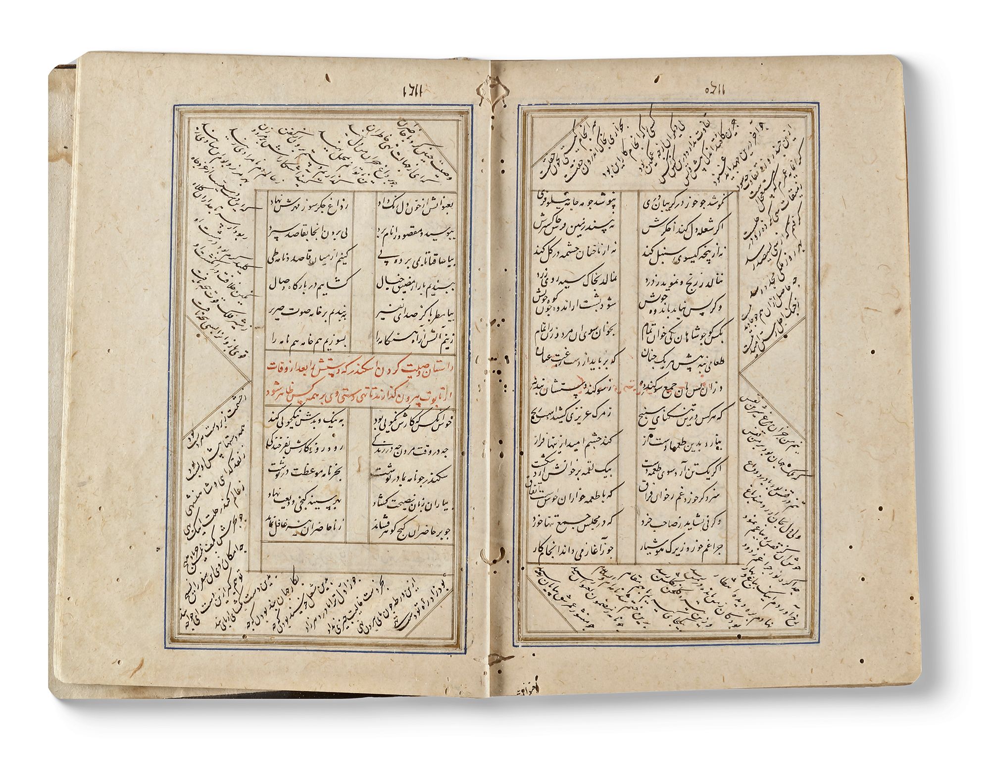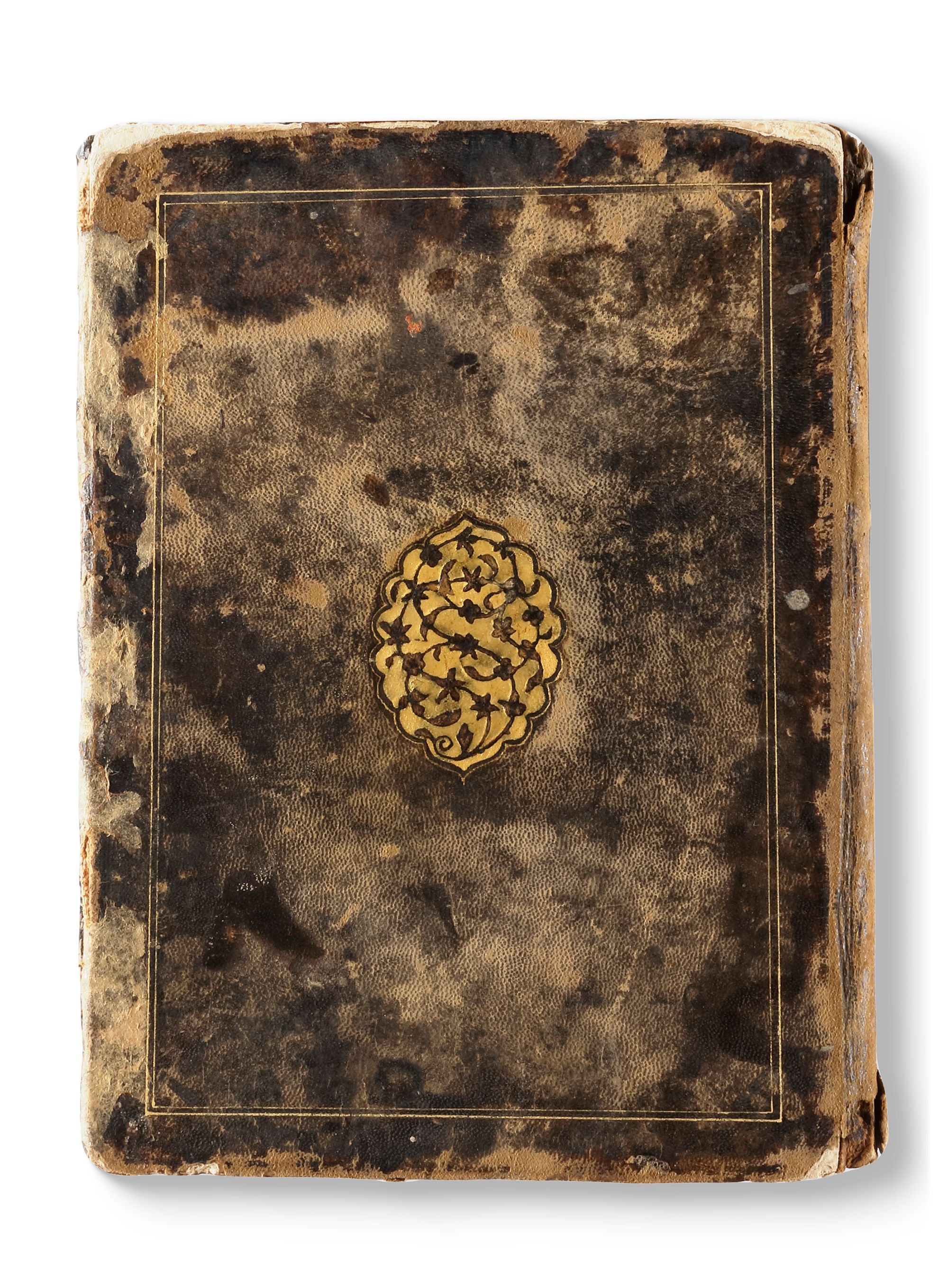 Persian manuscript on paper, 112 leaves, approximately 12 lines to the page written in elegant nasta'liq script in black ink, text written horizontally in two columns and approximately 26 lines written diagonally in the outer borders of each page, double intercolumnar and interlinear rules in gold, inner margins ruled in blue and gold, one fine illuminated headpiece in colours and gold, worming throughout the manuscript, later dark brown morocco with stamped central medallions, with flap, worn, spine damaged and crudely repaired.