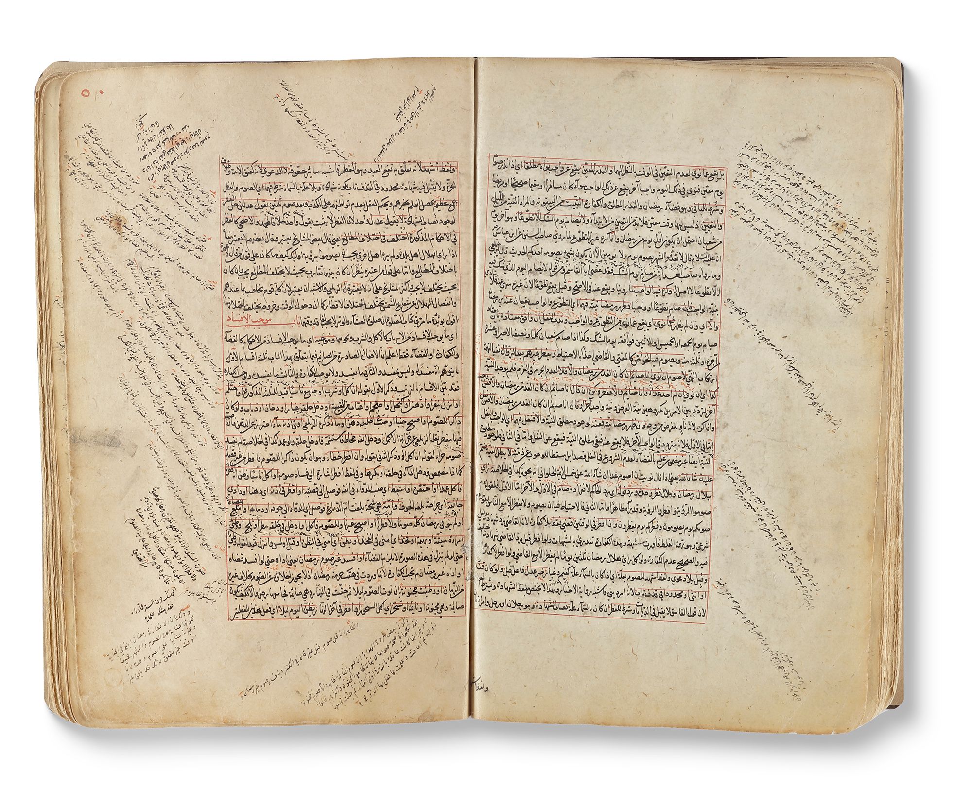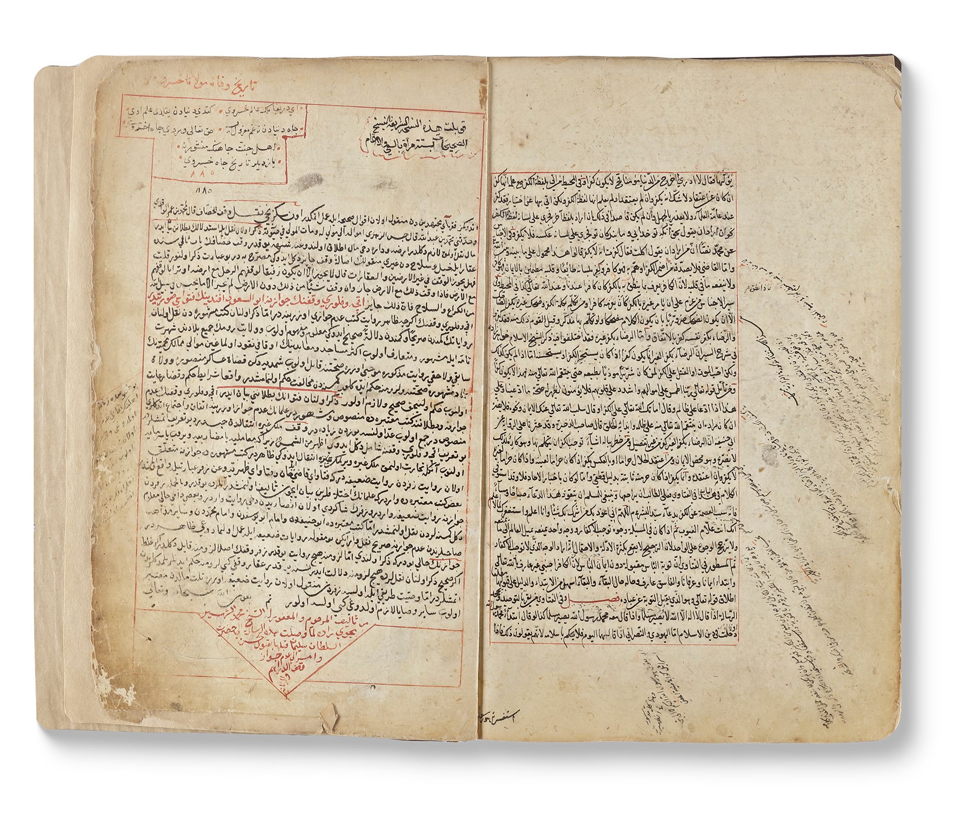 Arabic manuscript on paper, each page with 27 lines, written in black naskh script, ruled in red border, titles and catchwords in red ink, underlined in red, excessively marginal notes and commentaries, opening biofolio with blue and gold decoration, It regards Hanafi Fiqh or jurisprudence. It contains explanations of legal rulings from Rum in Anatolia. The last page with a commentary that this work was sponsored by Sultan Suleyman.