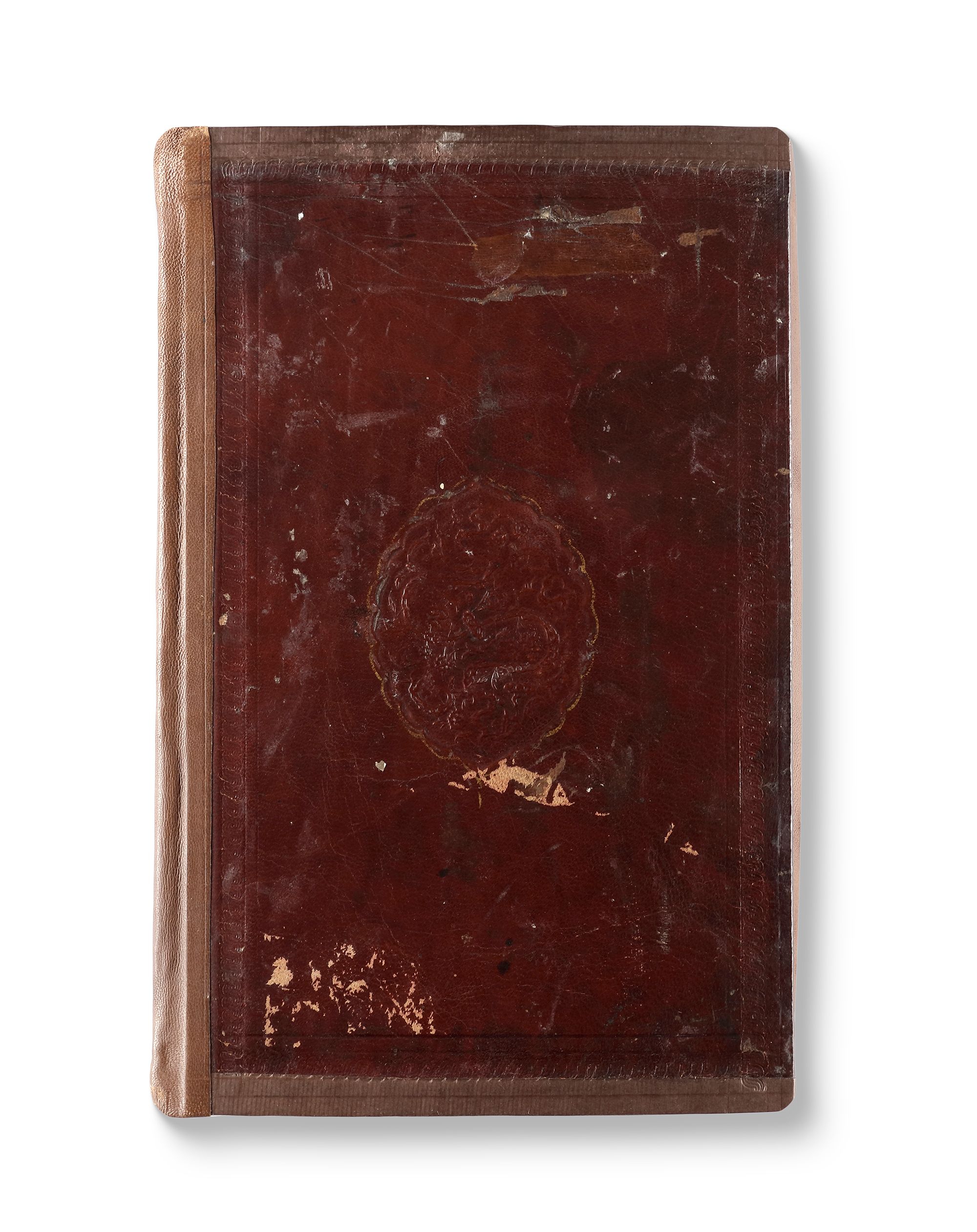 In a deep red leather binding with flap.