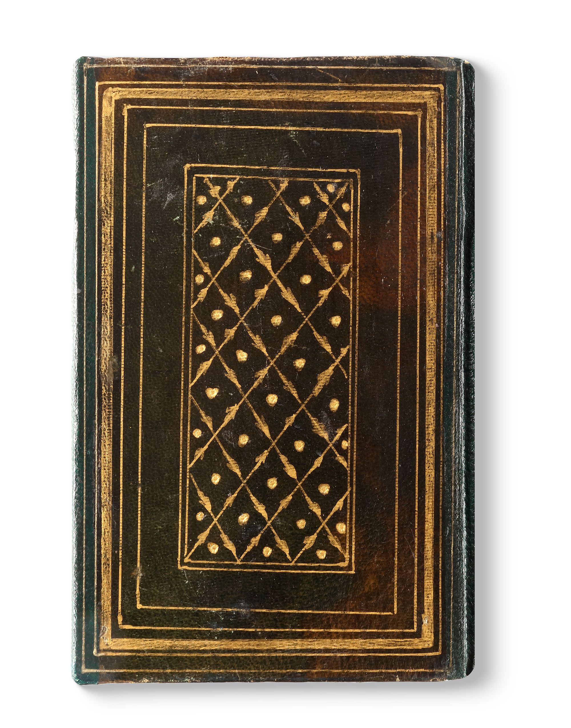 In black morocco binding with flap decorated with gold painted floral motifs.