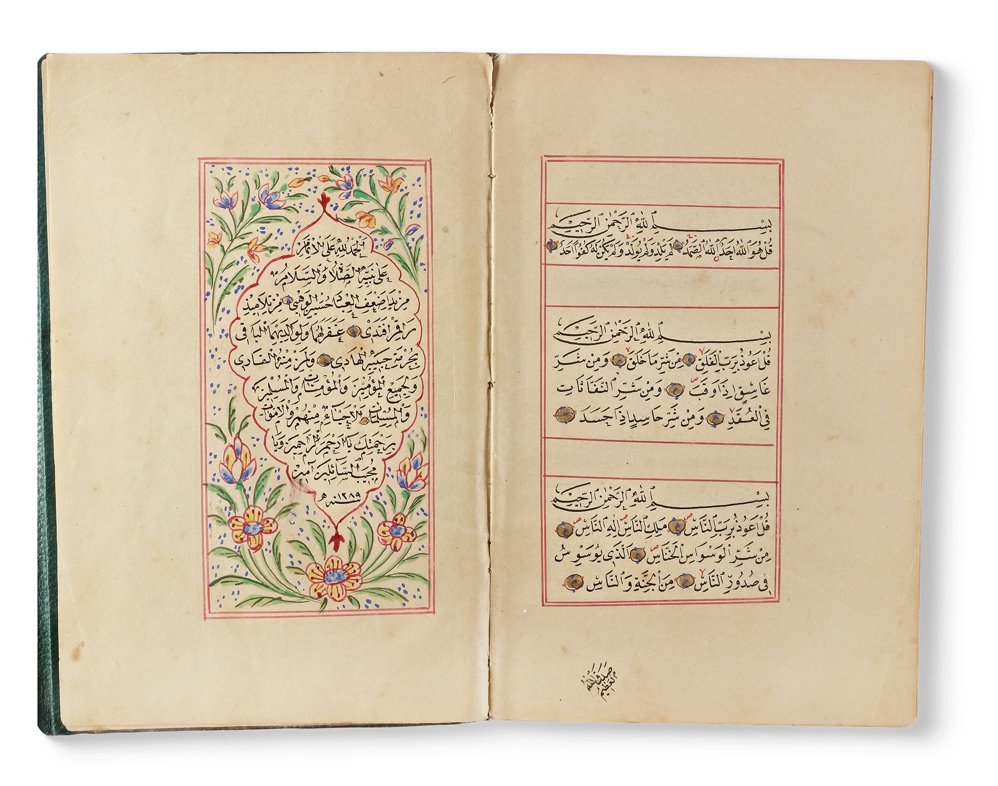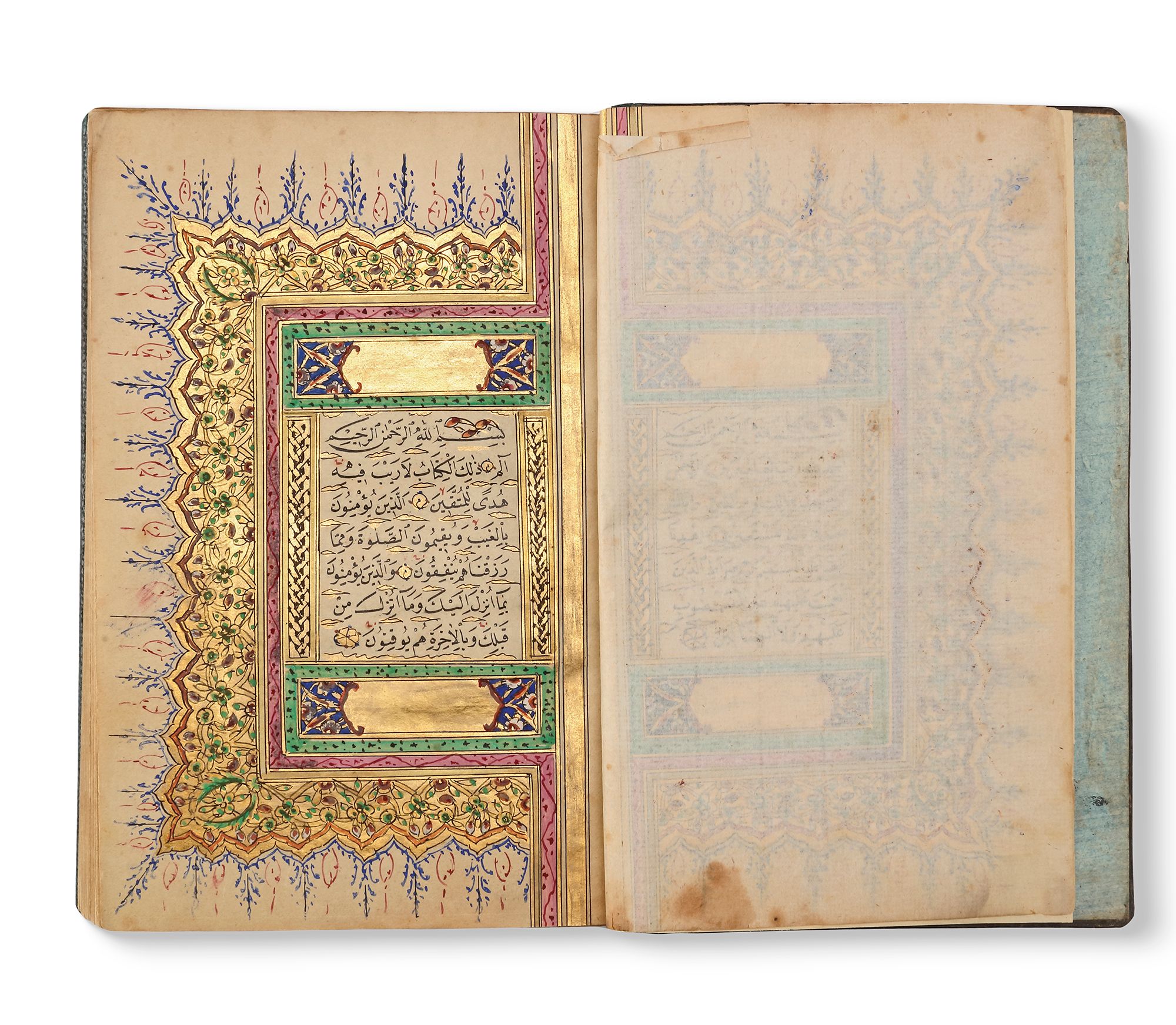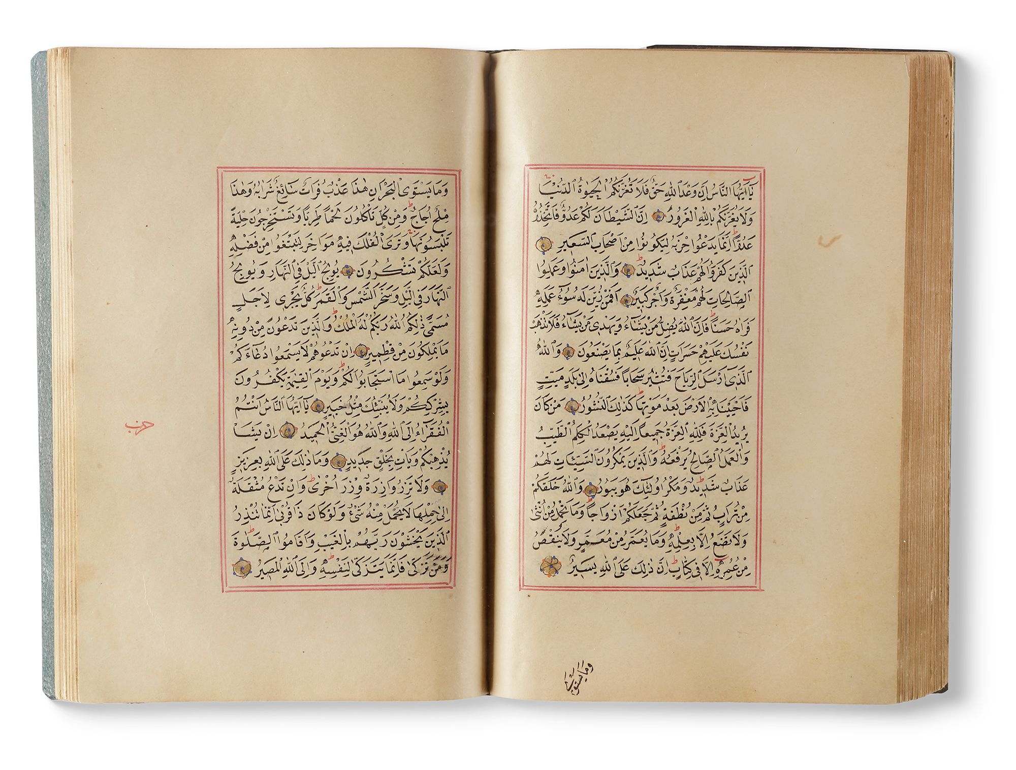 A complete Quran, Arabic manuscript on cream paper, each page with 15 lines written in black naskh script within double red rules, gold roundel verse markers outlined in black and pointed by polychrome dots. Tajwid in red ink, occasional gold and polychrome marginal floral motifs. Two opening folio heavily with gilt and polychrome decoration framing 7ll. of black naskh script. Final folio with gilt and polychrome decoration framing" written by husyn al-vehbi, student of Rakim Effendi and dated 1289AD".