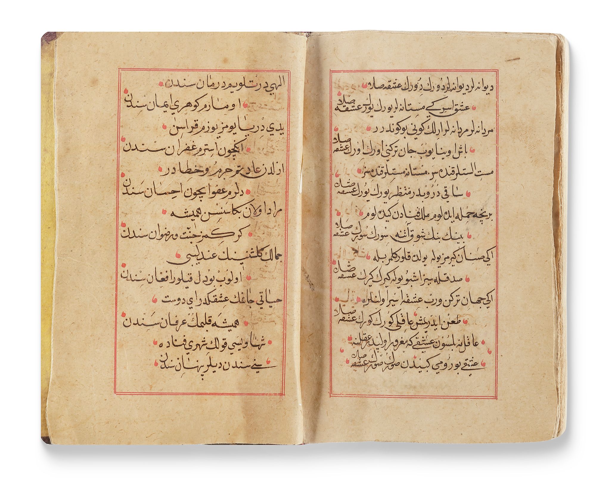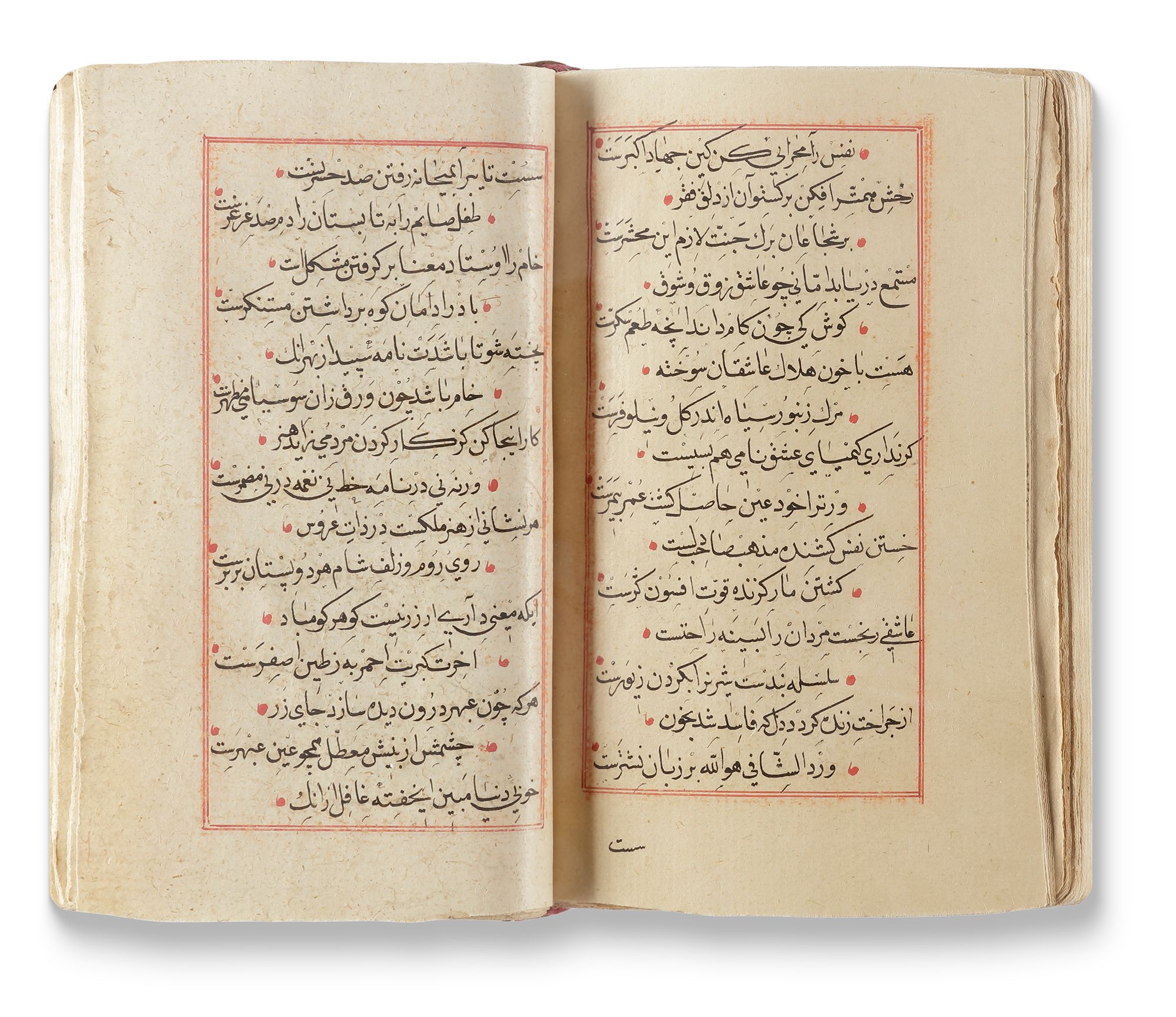 This refined manuscript contains the Divan of Hafiz, the timeless collection of poetry by Khwāja Shams al-Dīn Muhammad Ḥāfiẓ of Shiraz (d. 1390 CE), one of the most beloved and influential poets in the Persian literary canon. The Divan comprises primarily ghazals—lyric odes rich in metaphor and layered meanings—alongside qasidas, rubāʿiyāt, and other poetic forms.