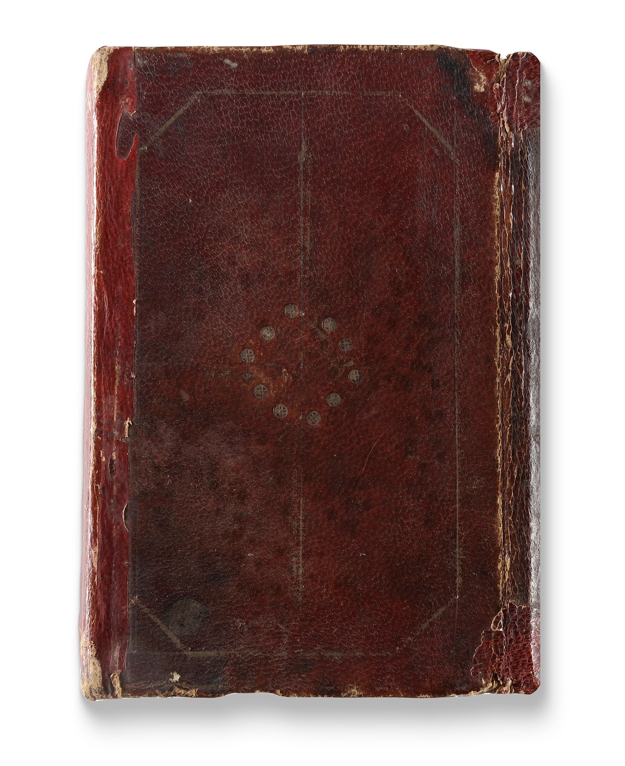 The manuscript is housed in a deep red morocco binding with a fore-edge flap.