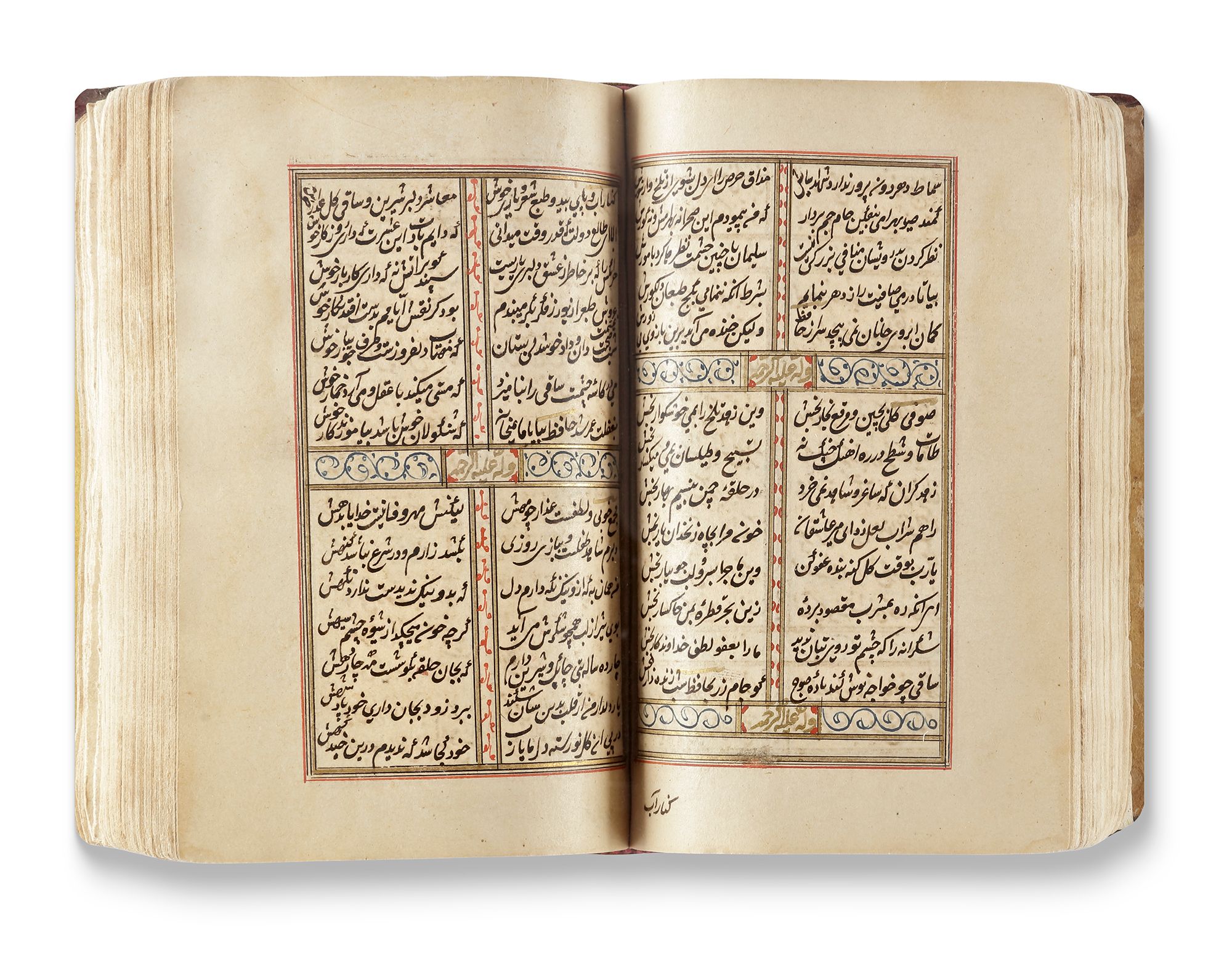 Persian poetry manuscript on paper, each folio features 15 lines of elegant black nastaʿlīq script, arranged in two columns separated by double black-ruled gold divisions. Select passages are set within central cartouches. Section titles are rendered in gold nastaʿlīq script, framed by blue floral scrolls. The main text is enclosed within gold frames, ruled in red and black, and includes catchwords throughout.