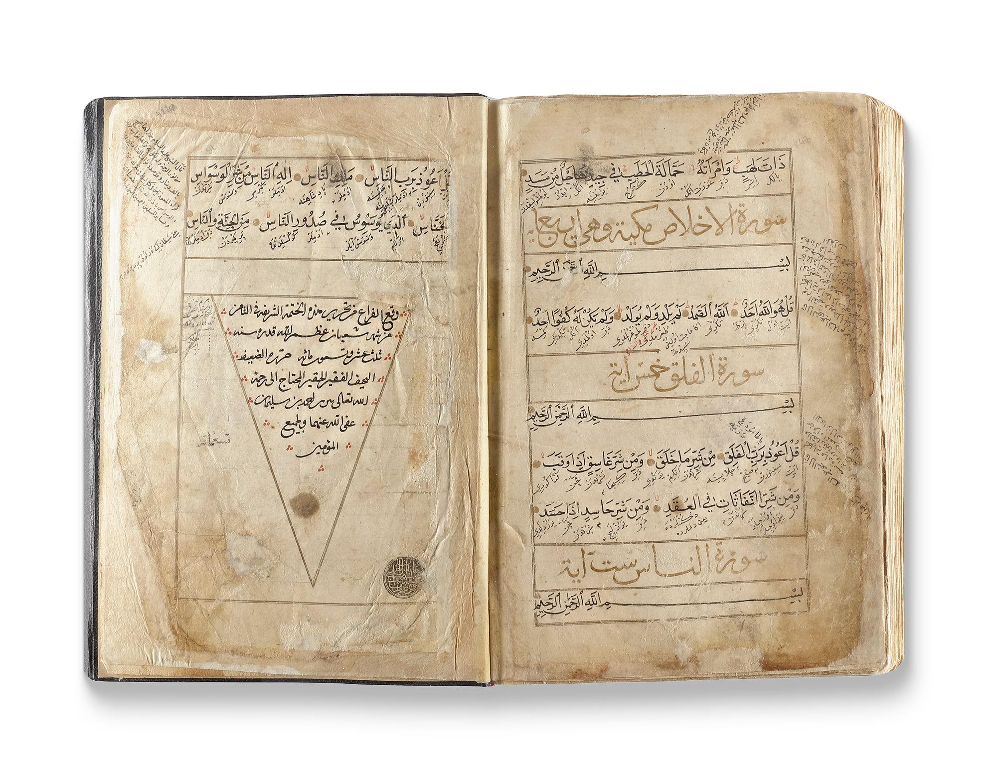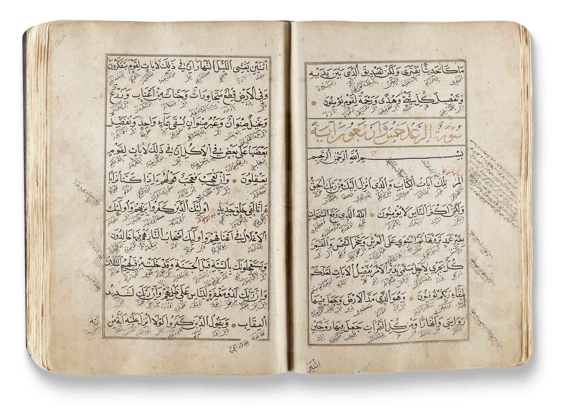 Arabic manuscript on cream paper, 425ff. plus two fly-leaves, each folio with 10ll. written in black naskh script, tajwid in red ink , gold roundel verse markers, interlinear Ottoman Turkish translations, within gold and black rules, catchwords, sura headings in gold thuluth script, occasional marginal notes and commentaries. Two opening bifolio with gold and polychrome illumination framing 6ll. of naskh in clouds reserved against a gold-hatched ground, colophon signed and dated, followed by a prayer, in later brown morocco with stamped central lobed cartouche, some areas of restoration.