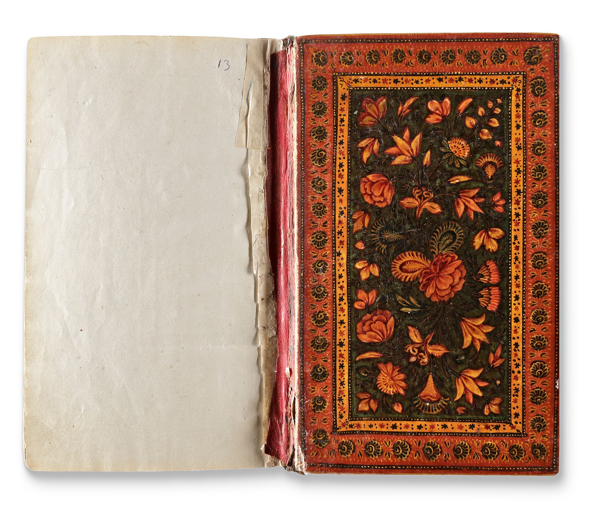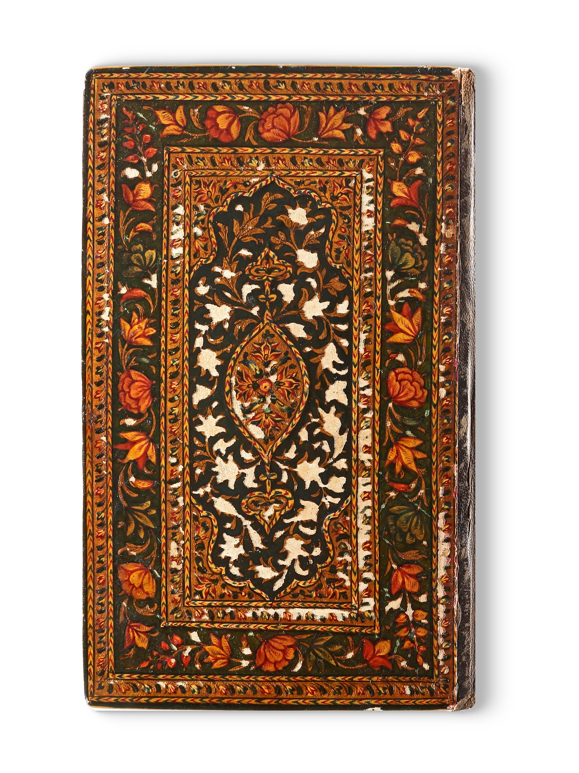 In gilt Qajar lacquer binding with central cartouche enclosing flower heads and surrounded by spandrels containing scrolling foliage.