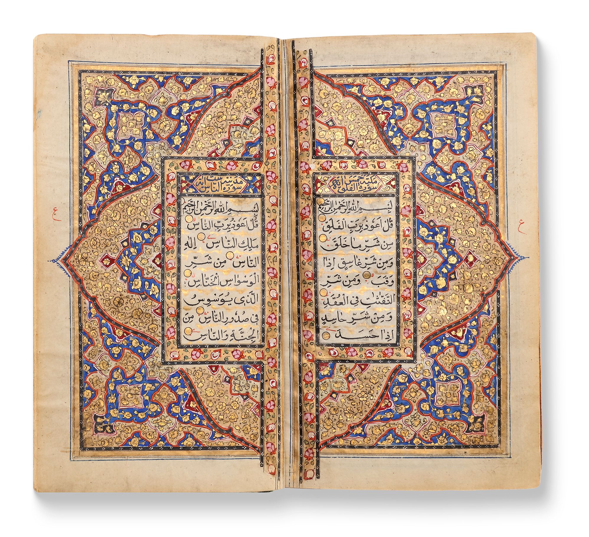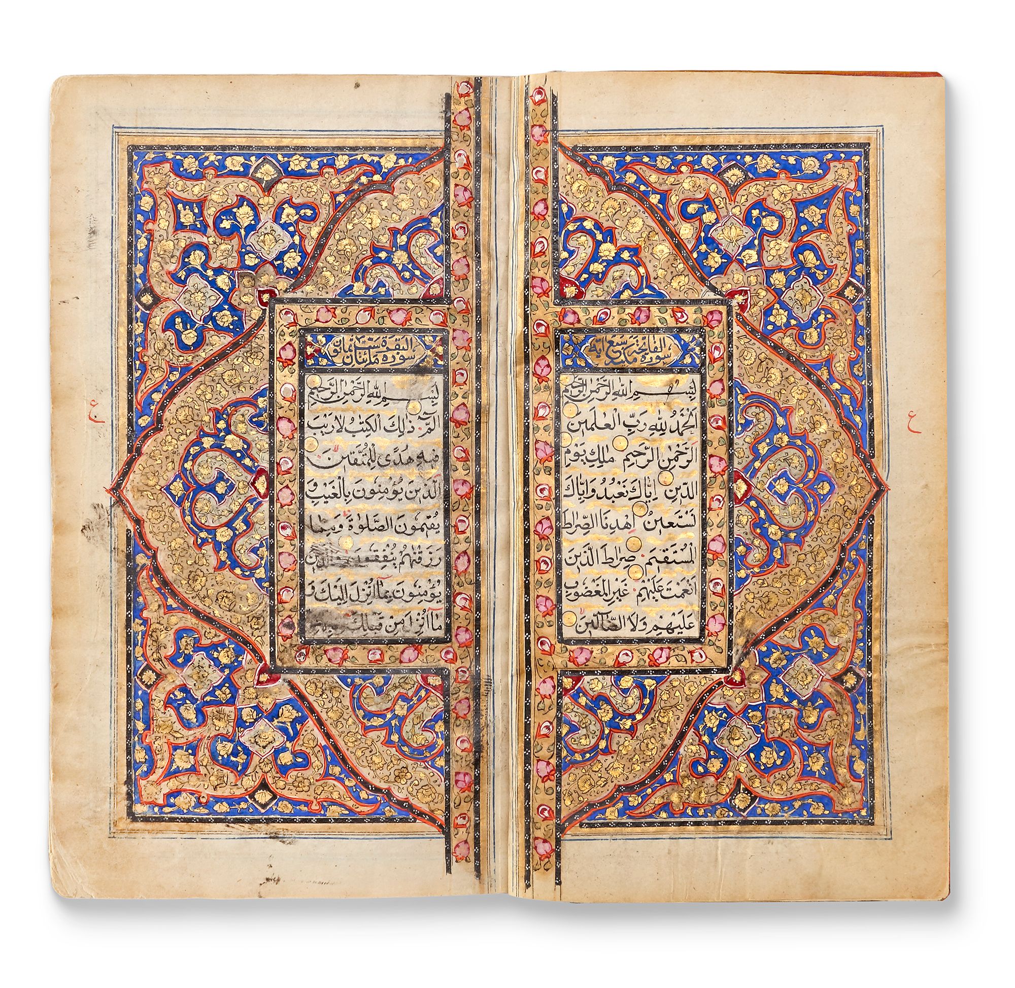 surah headings in blue thuluth script on an blue and illuminated ground, two opening bifolia and two last pages fully illuminated in gold and polychrome decoration framing 8 lines of black naskh script in clouds reserved against a sprinkled gilt ground.