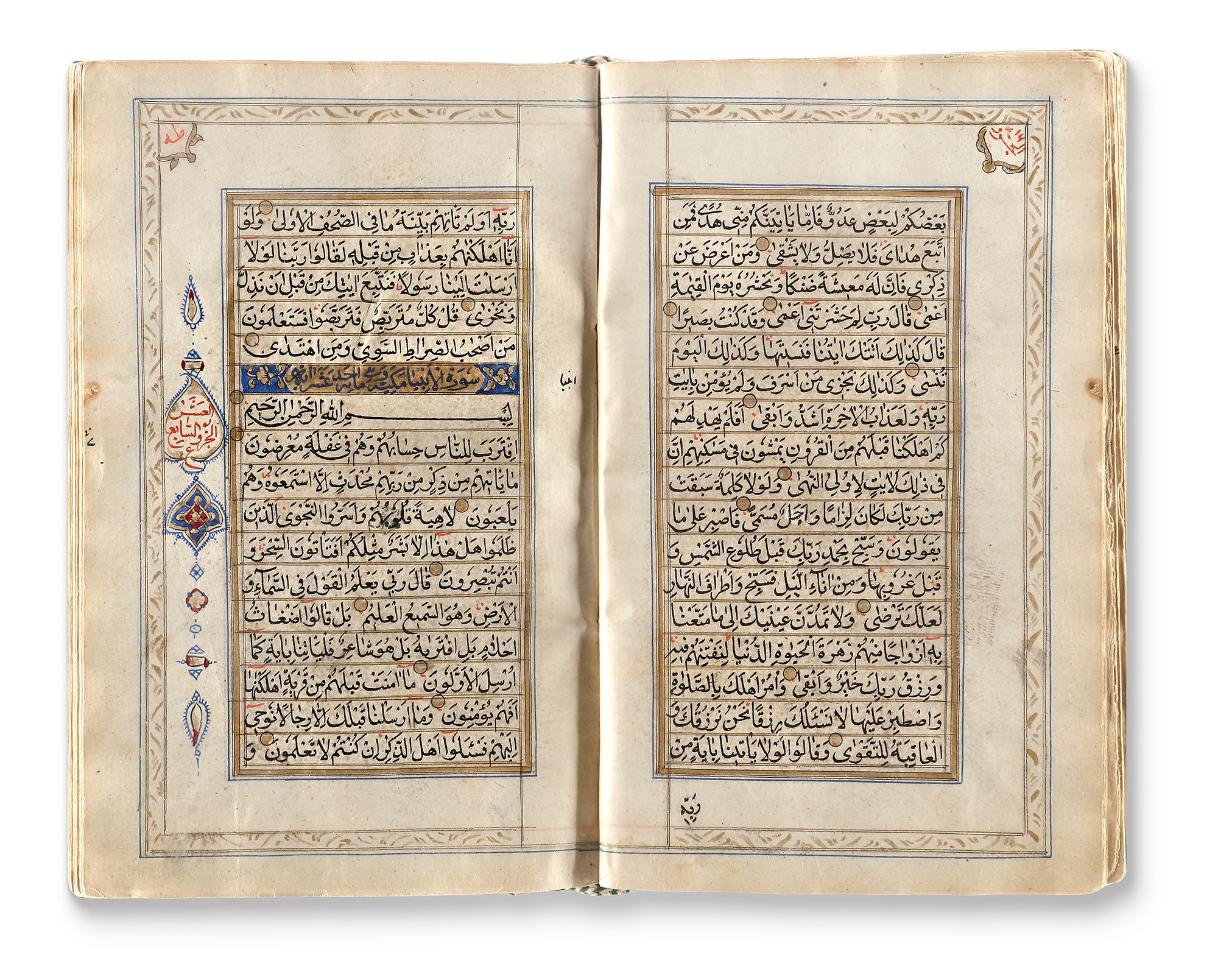 Arabic manuscript on paper, each folio with 17 lines of elegant black naskh, diacritics and vowels in red, gold and polychrome roundel verse markers outlined in black, large gilt and polychrome floral marginal 'juz, hizb and nisf ' medallions, text within gold and blue rules, outer border with blue and gilt floral motifs,