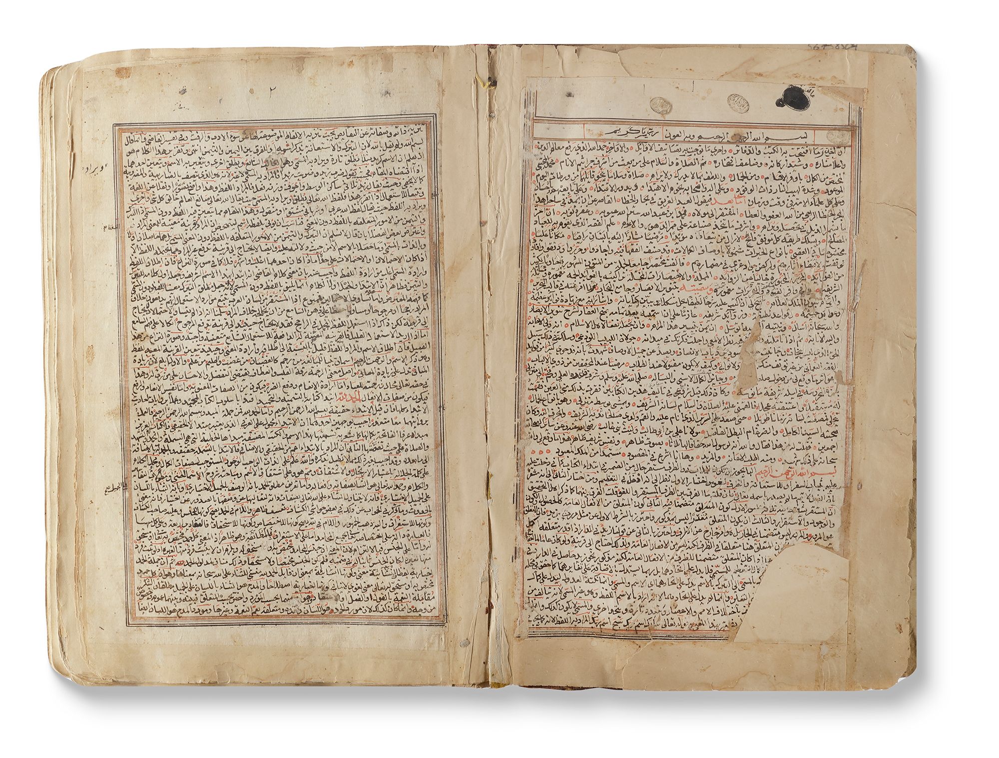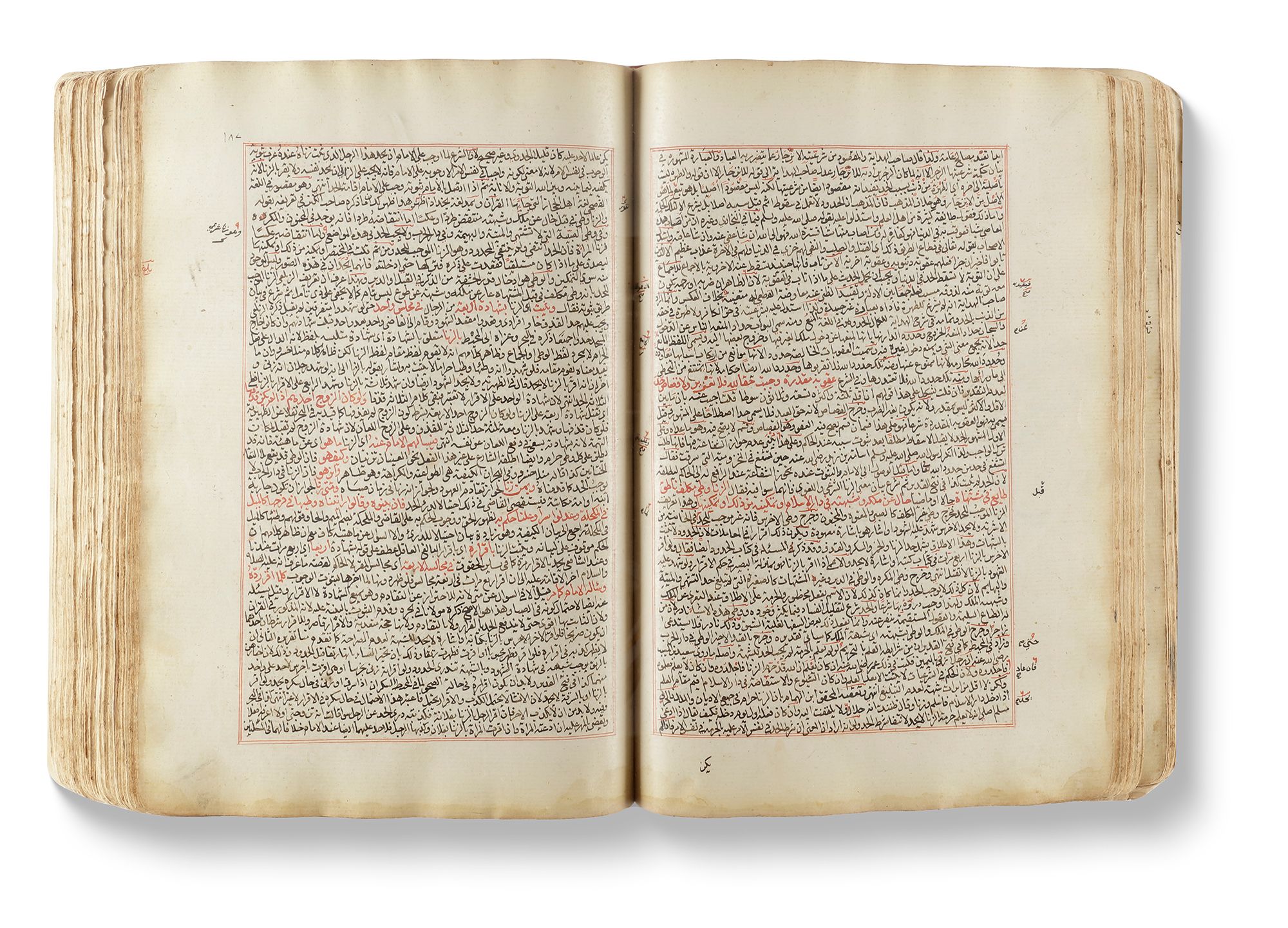 Arabic manuscript on cream burnished paper, 483 leaves, 39 lines of black naskh script, titles and catchwords in red ink, ruled in double red borders, occasional marginal notes.