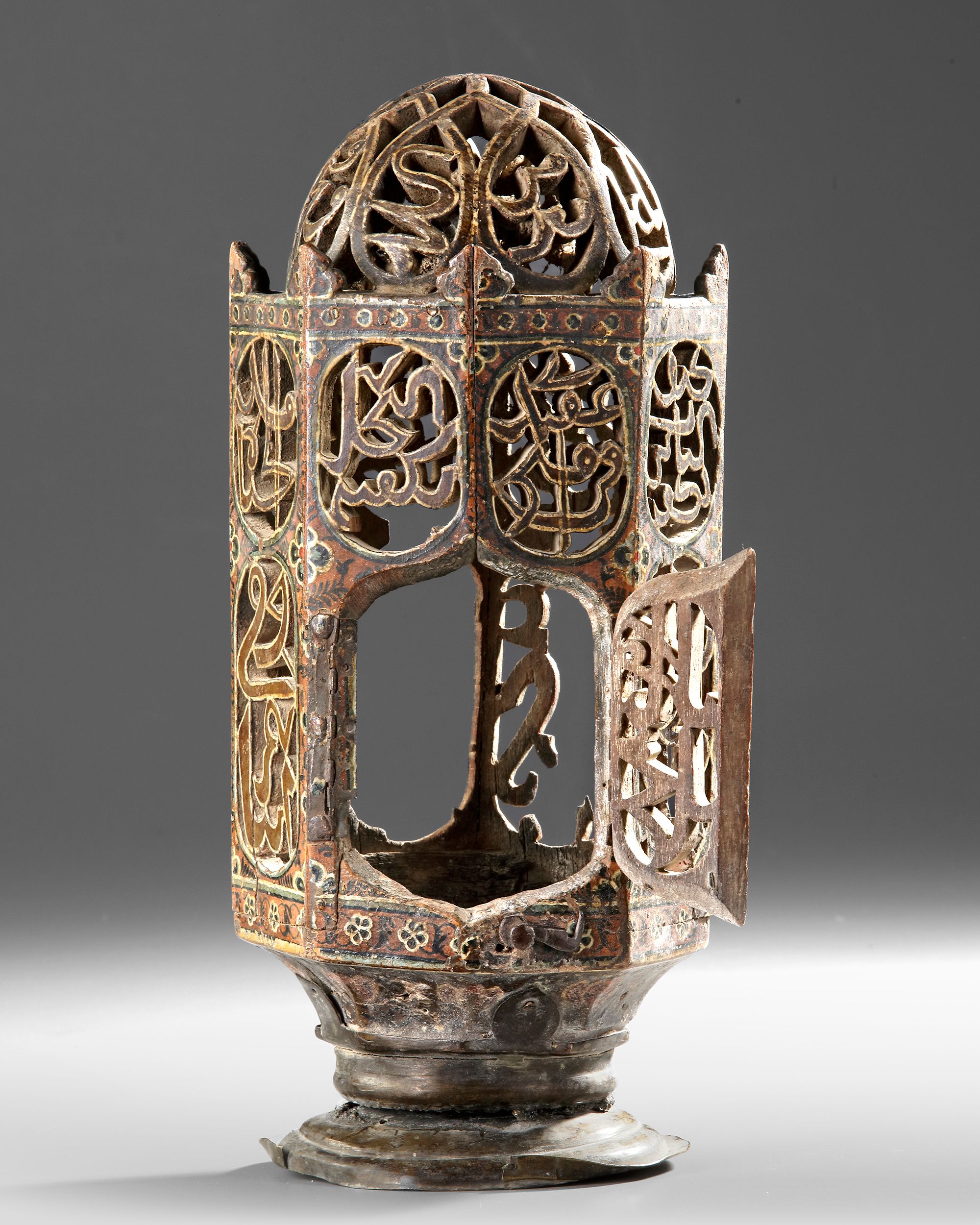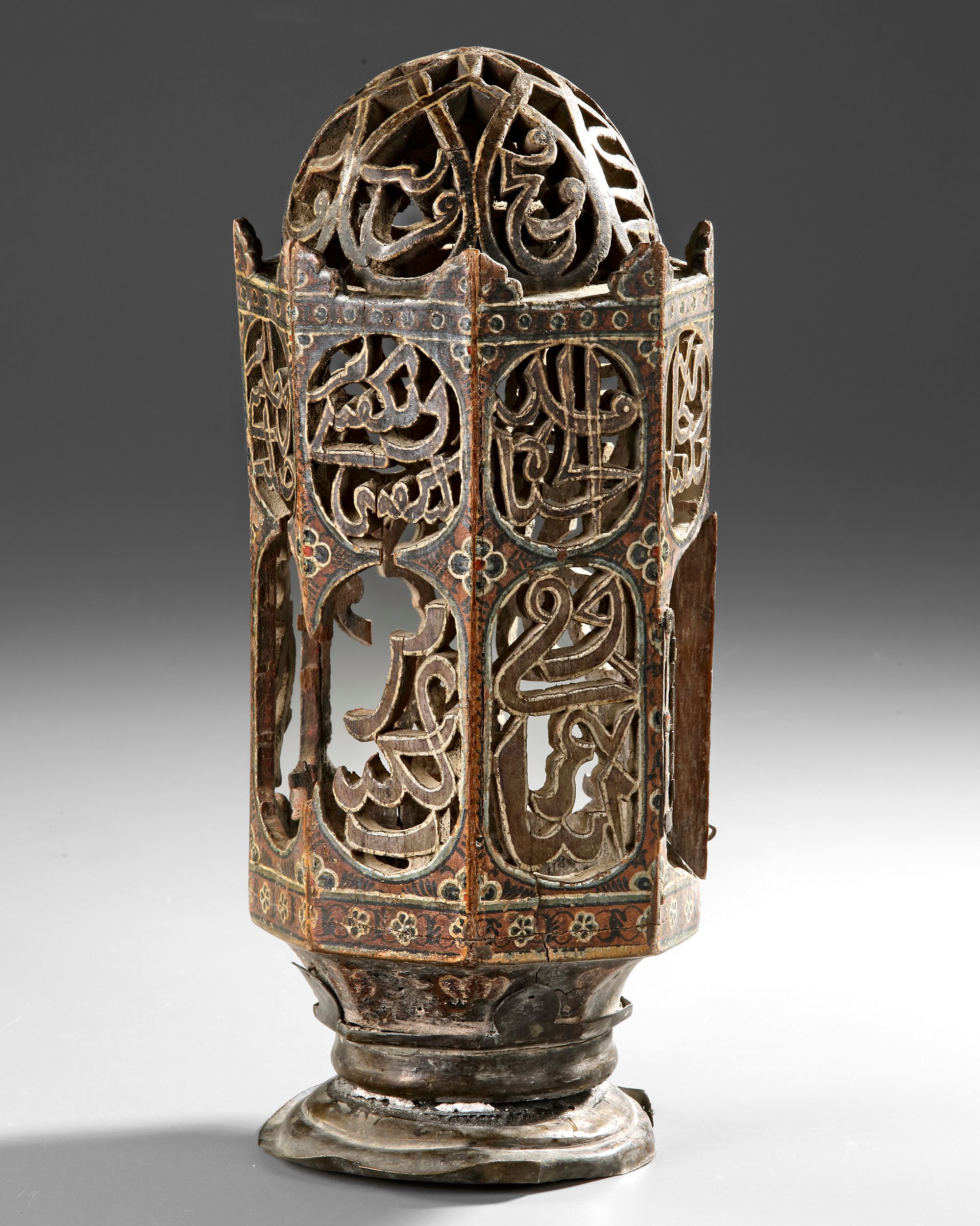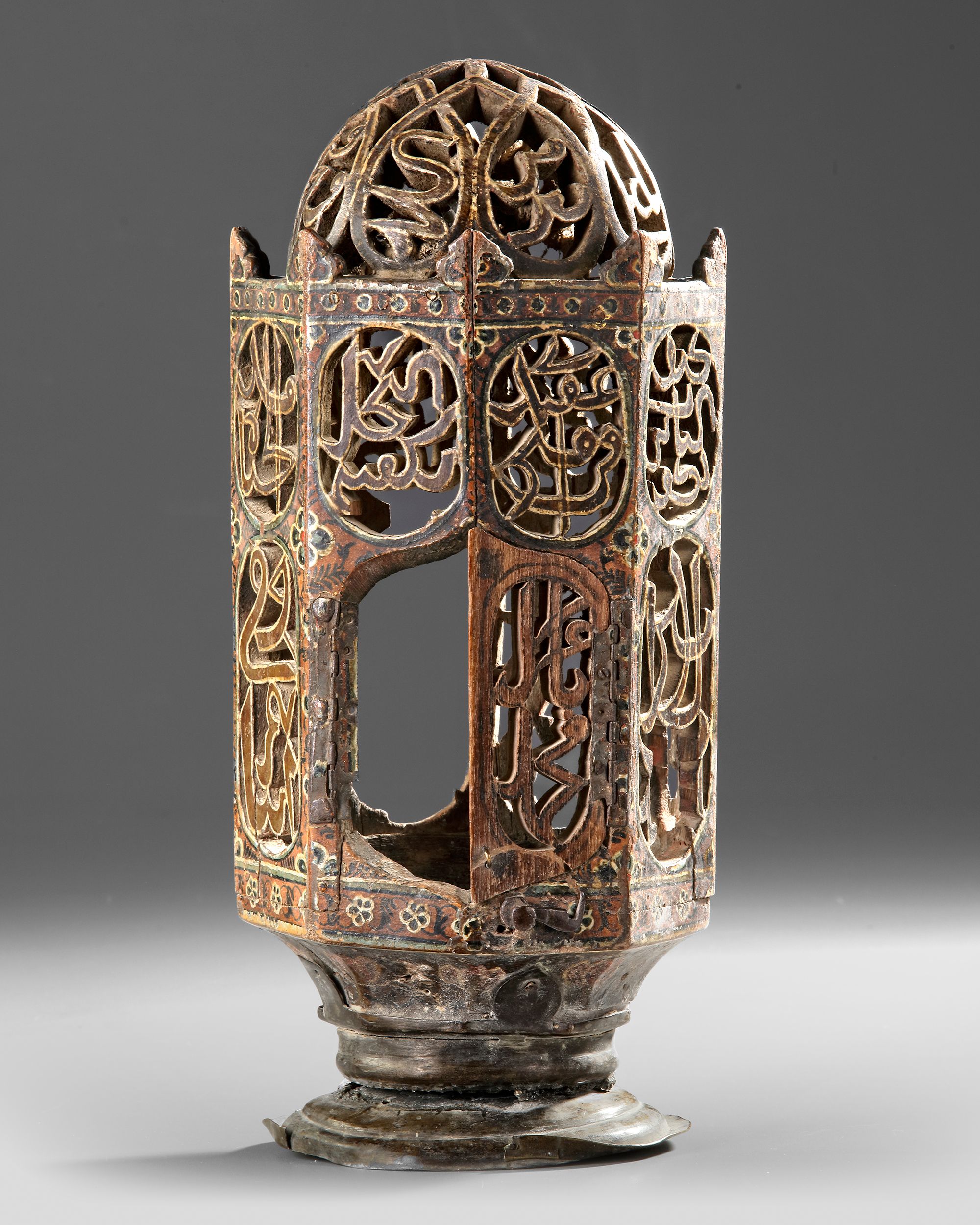 The hinged door reveals the hollow interior where incense would have been placed, allowing fragrant smoke to diffuse through the elaborate openwork. Despite signs of age and wear—including some losses to the wood and pigment—the piece remains a striking example of late medieval Islamic devotional and domestic artistry, reflecting both functional and spiritual purpose.