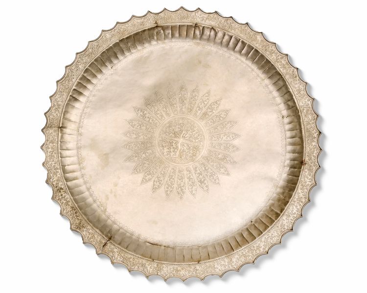 Finely decorated with intricate floral and geometric engravings in a radiating starburst pattern, bordered with a scalloped rim. Diam 77 cm. 2276 gr.