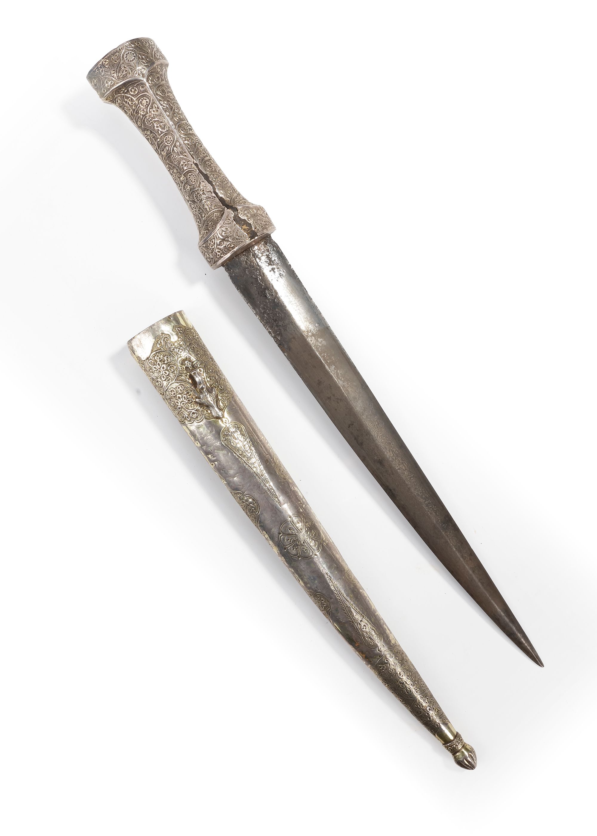 An Ottoman silver dagger, elegantly crafted with a slender, tapering blade and a sheath richly decorated in fine floral and scrollwork engravings.
