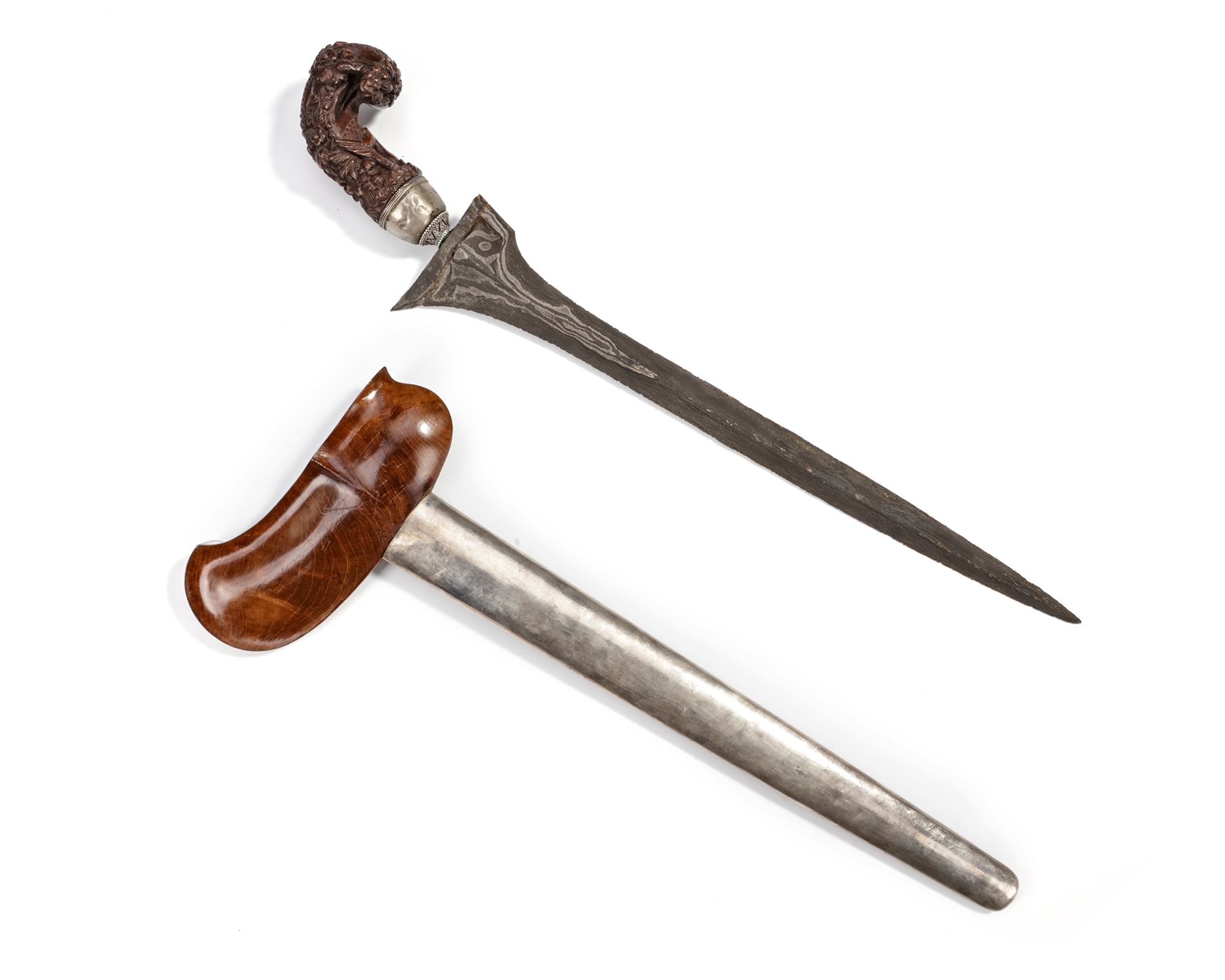 With a finely carved wooden hilt, a distinctive wavy-patterned blade, and a silver scabbard richly decorated with floral motifs.