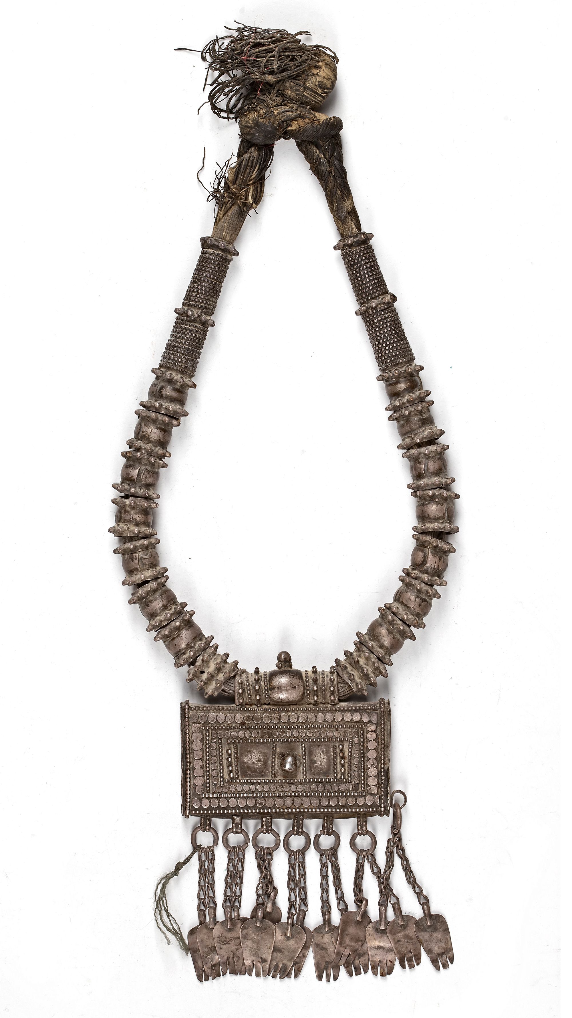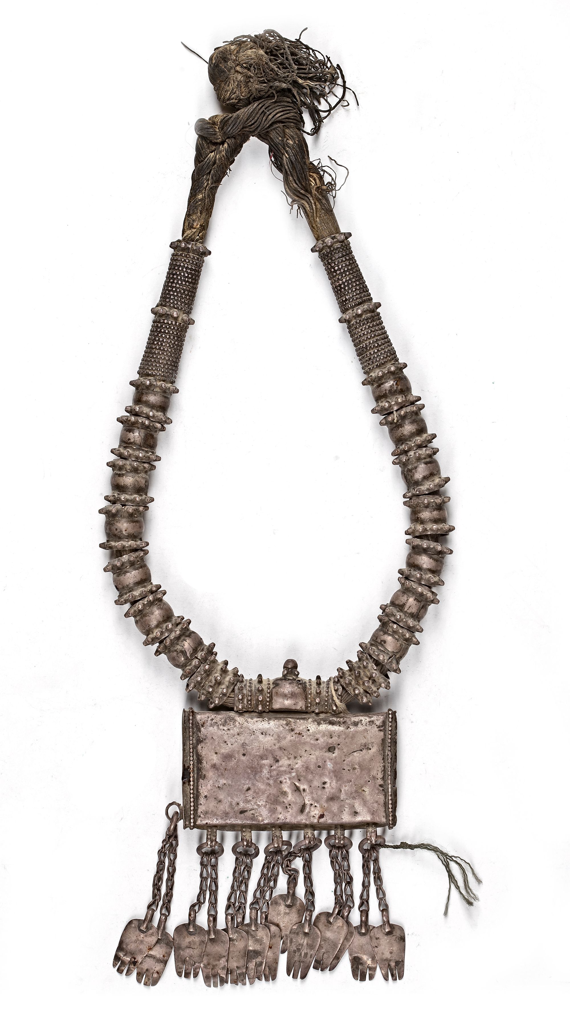 Richly decorated with bold geometric patterns and raised beadwork. The central rectangular pendant is adorned with intricate dot motifs and dangling chains ending in stylized hand-shaped charms, symbolizing protection. The necklace features heavy cylindrical and spiked silver beads, with braided cord at the top for fastening.