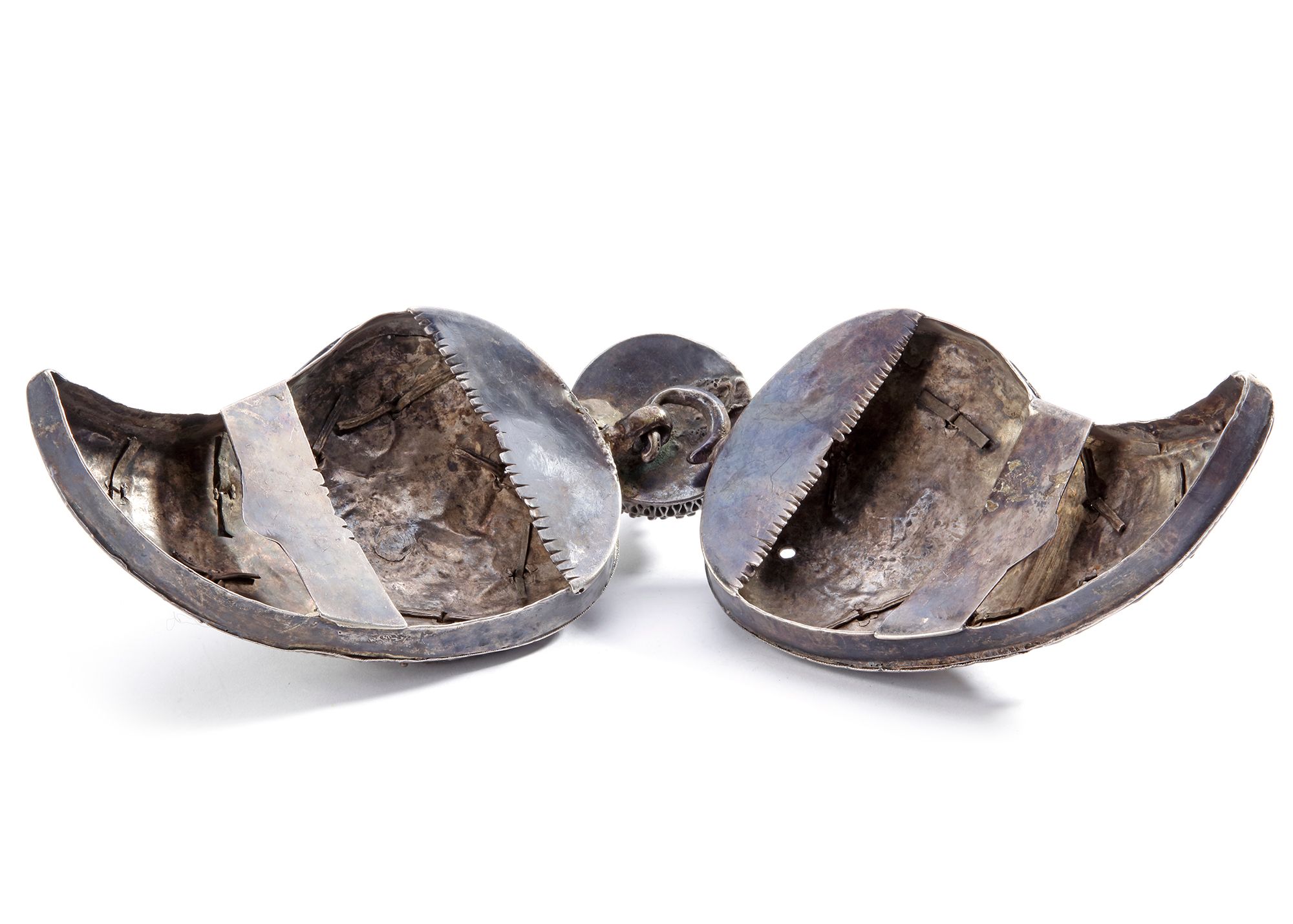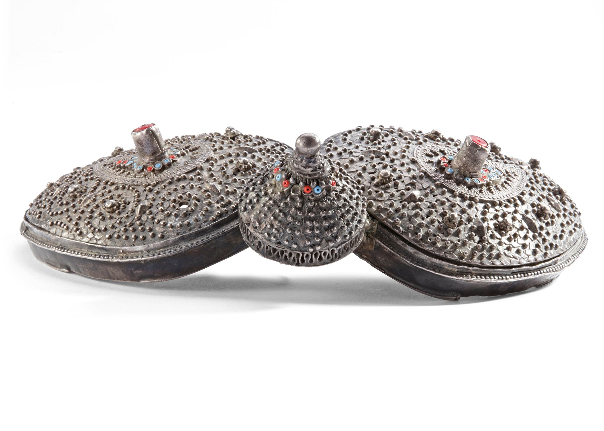 Decorated with intricate repoussé patterns and colorful bead inlays. 25 by 20 cm. Weight 747 gr. THE DR. SAAD AL-JADIR COLLECTION