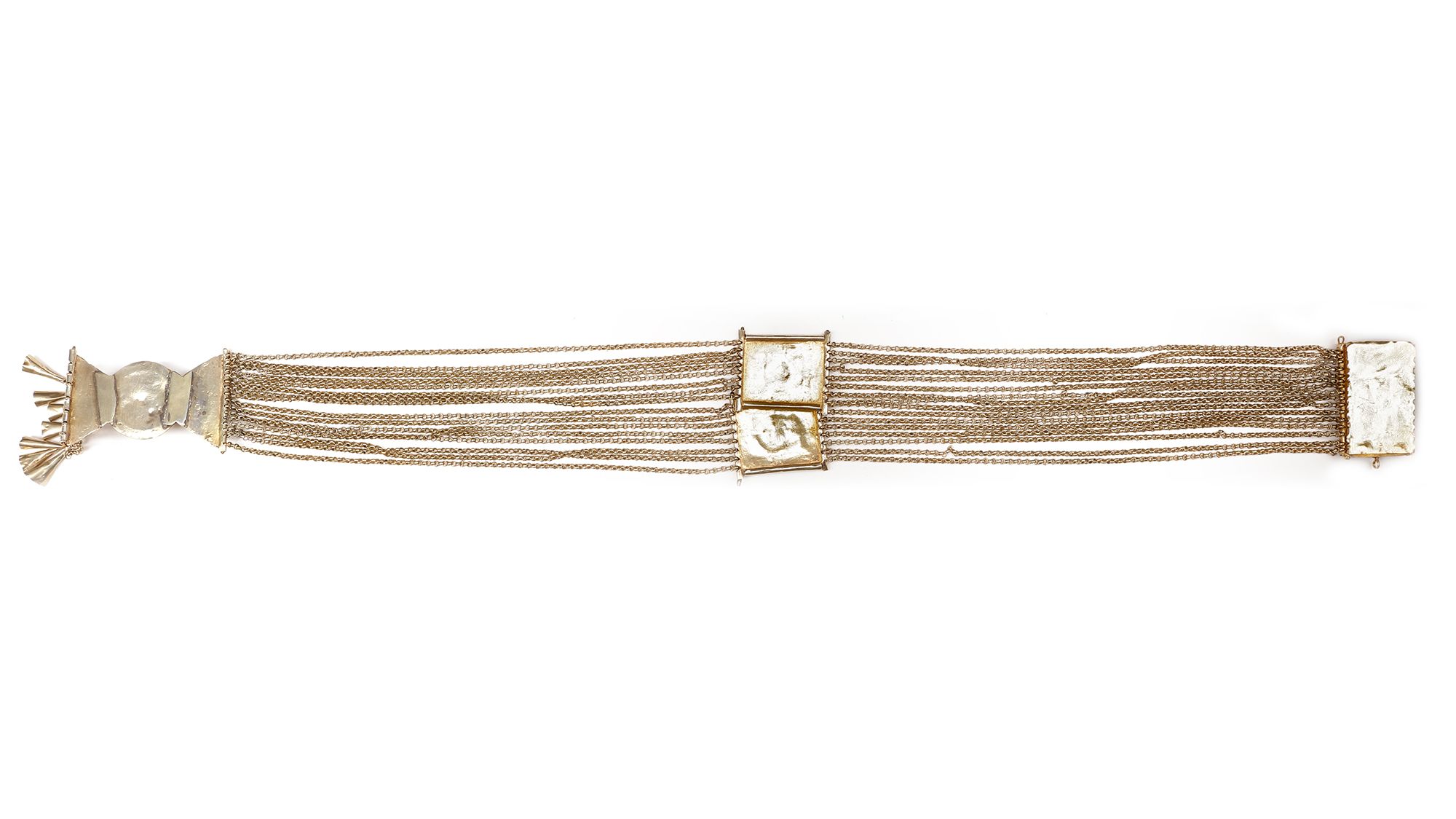 With multiple chains and ornate clasps with detailed geometric and floral designs. 57 by 3 cm. 145 gr. THE DR. SAAD AL-JADIR COLLECTION