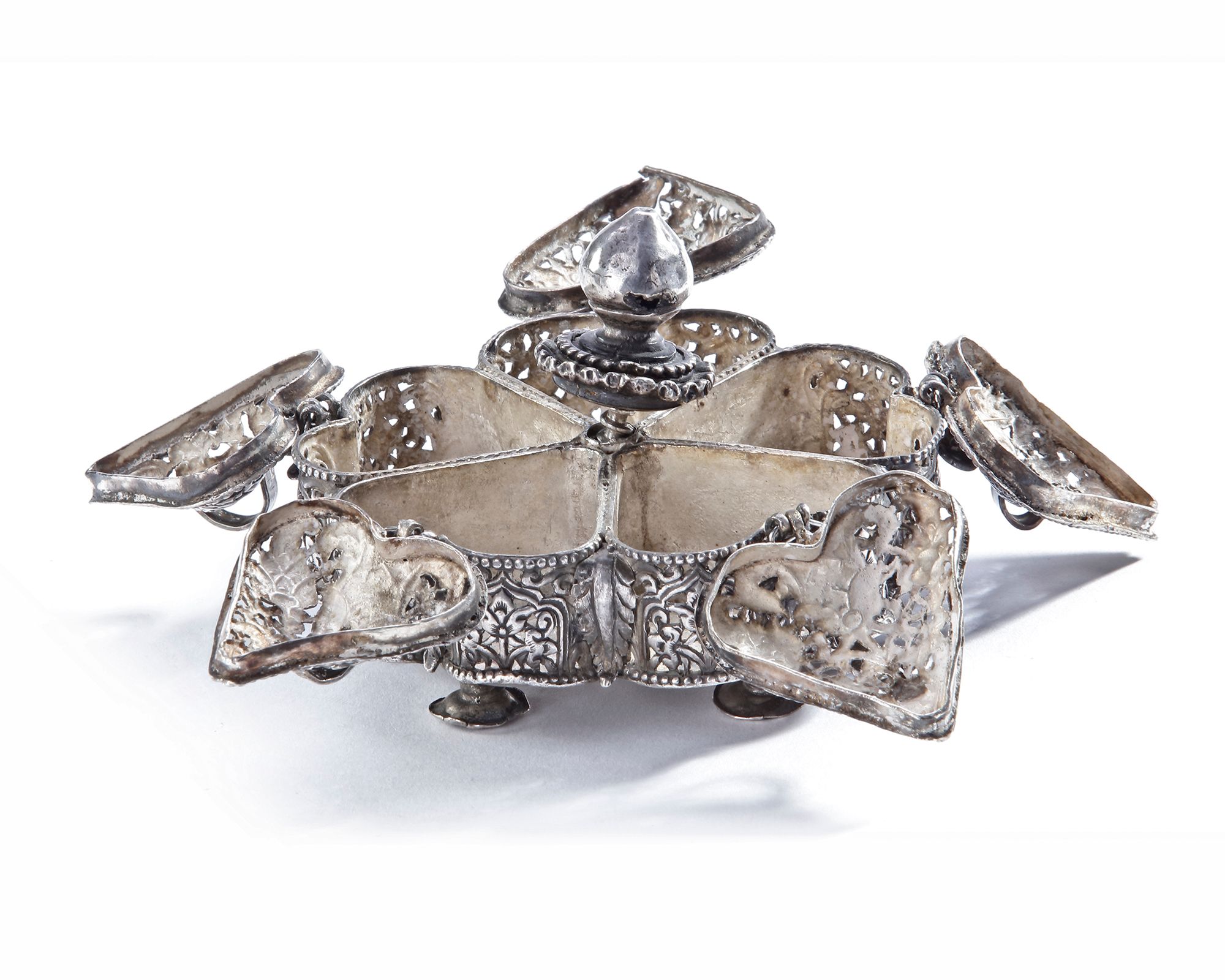 On five feet, of flower-shaped form divided into heart-shaped compartments, each with hinged opening and bird finial, surrounding a central core topped by a cupola-like knob.