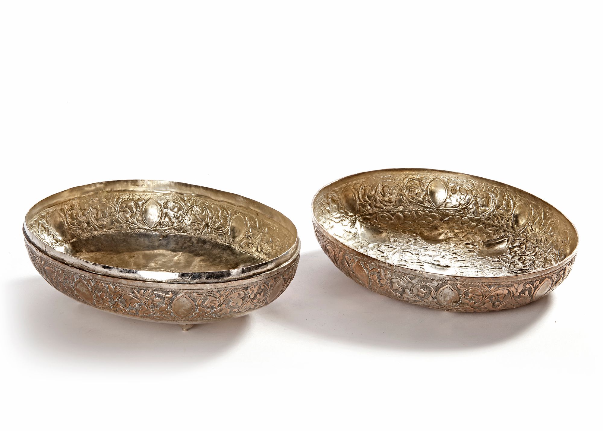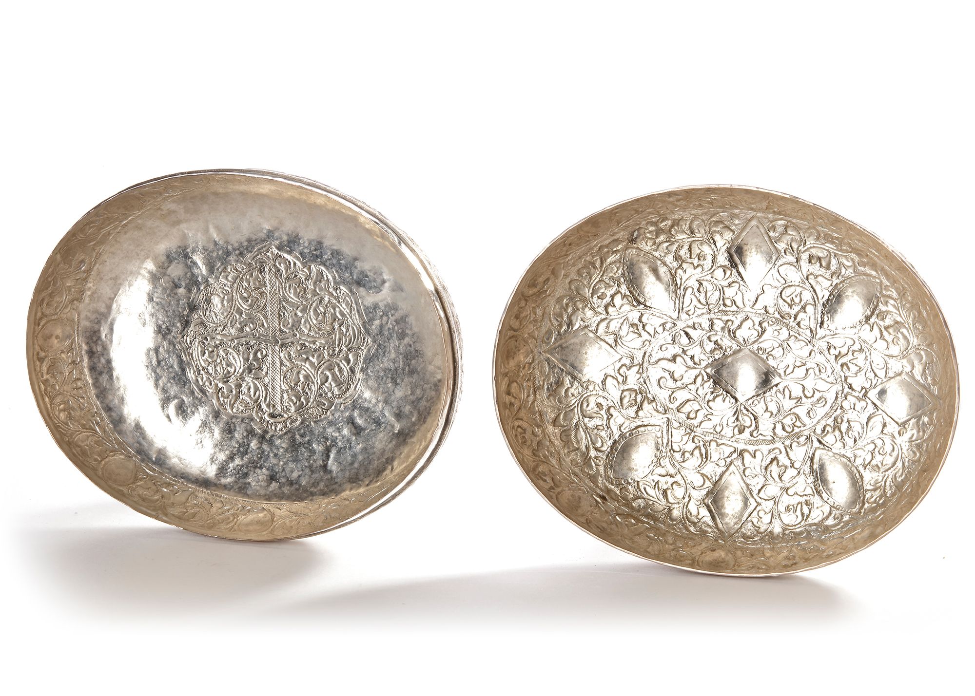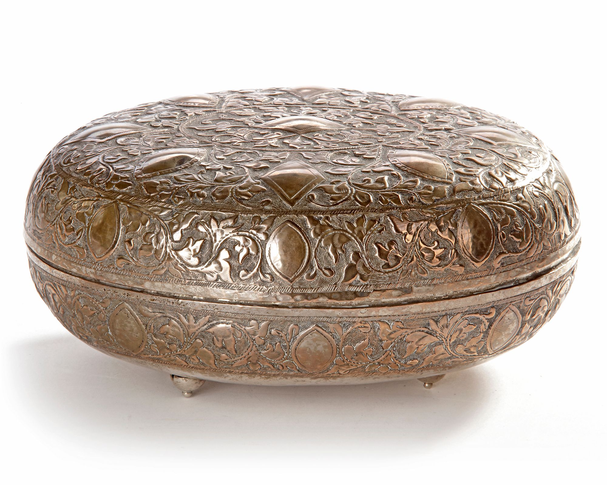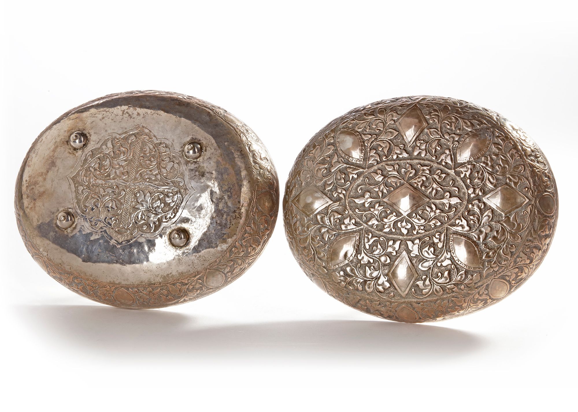 Richly decorated in repoussé floral and geometric designs, resting on small rounded feet. 19 by 15 cm. 202 gr. THE DR. SAAD AL-JADIR COLLECTION