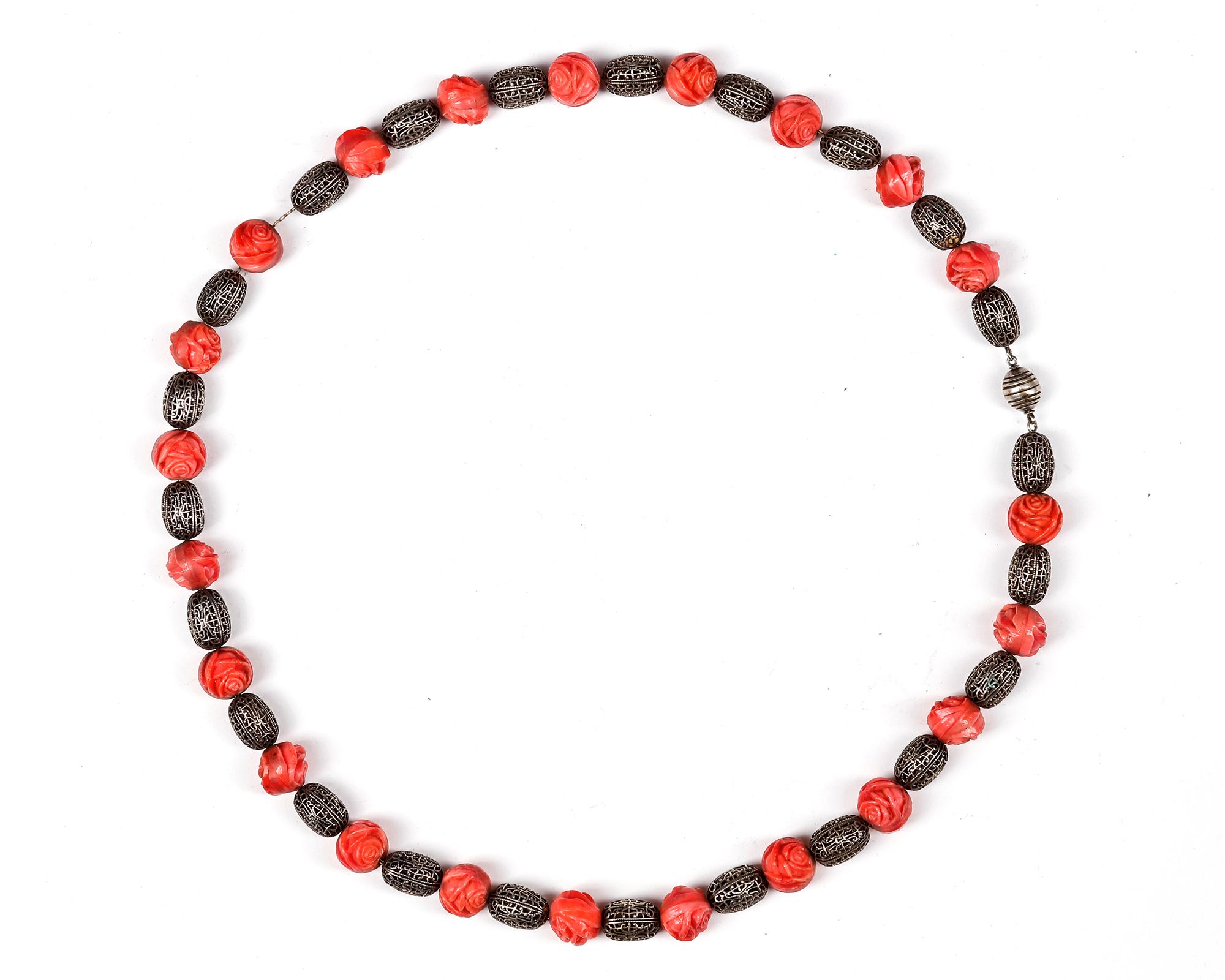 Composed of alternating filigree silver beads and carved coral-colored beads. 60 cm. 78 gr. THE DR. SAAD AL-JADIR COLLECTION