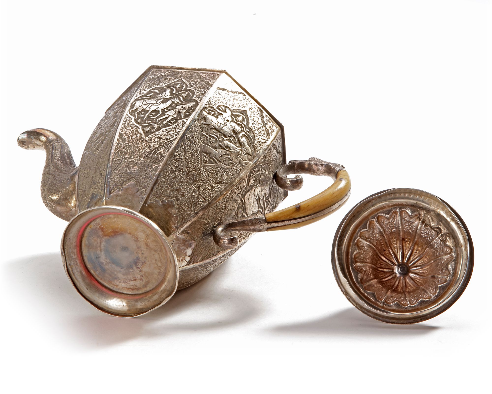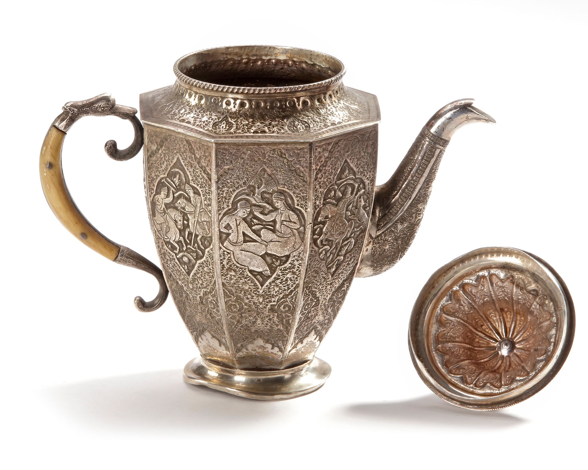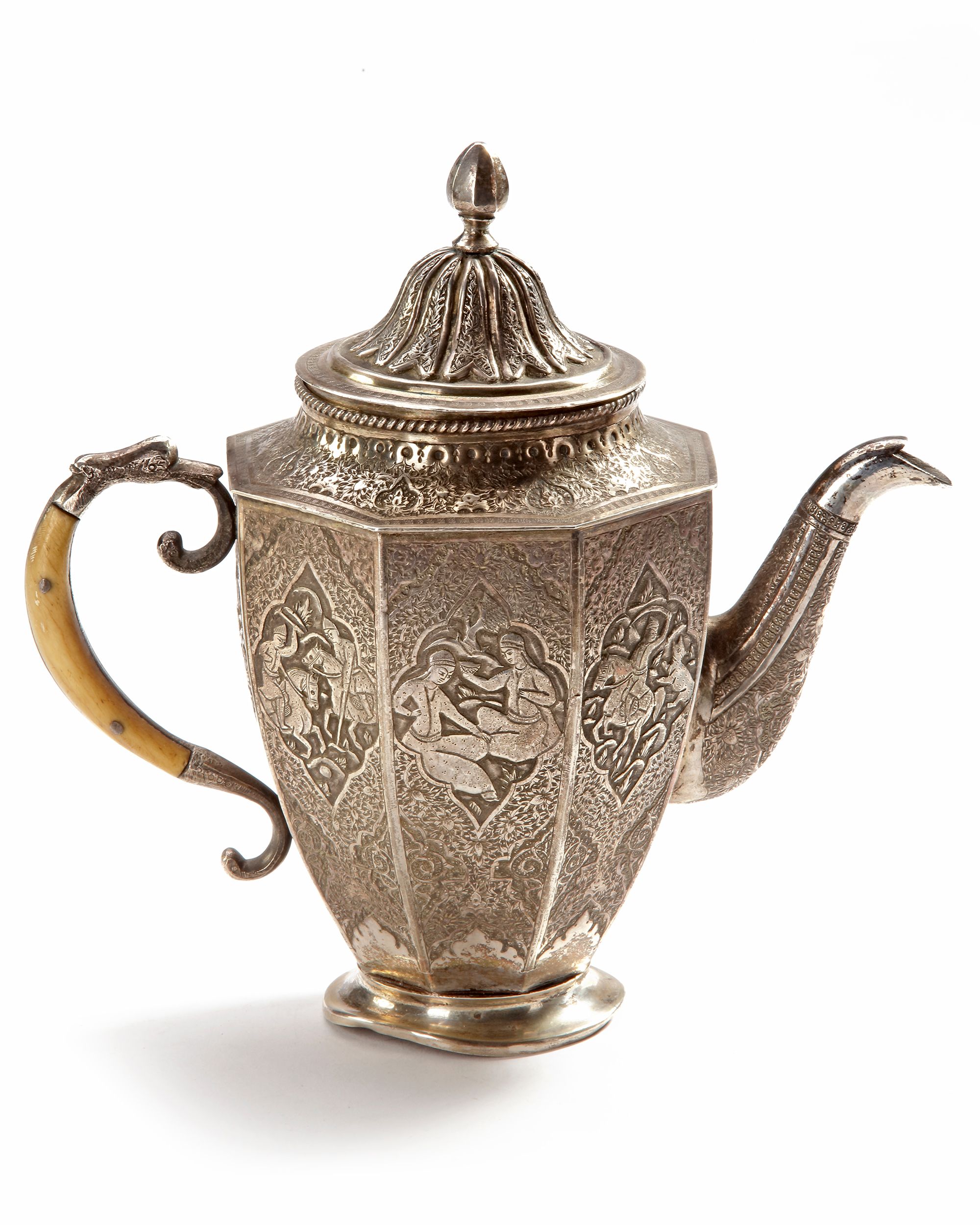 Richly decorated with finely engraved panels depicting courtly figures, horsemen. The faceted body features intricate floral motifs, a domed lid with a finial, and a gracefully curved spout. The handle is mounted with bone.