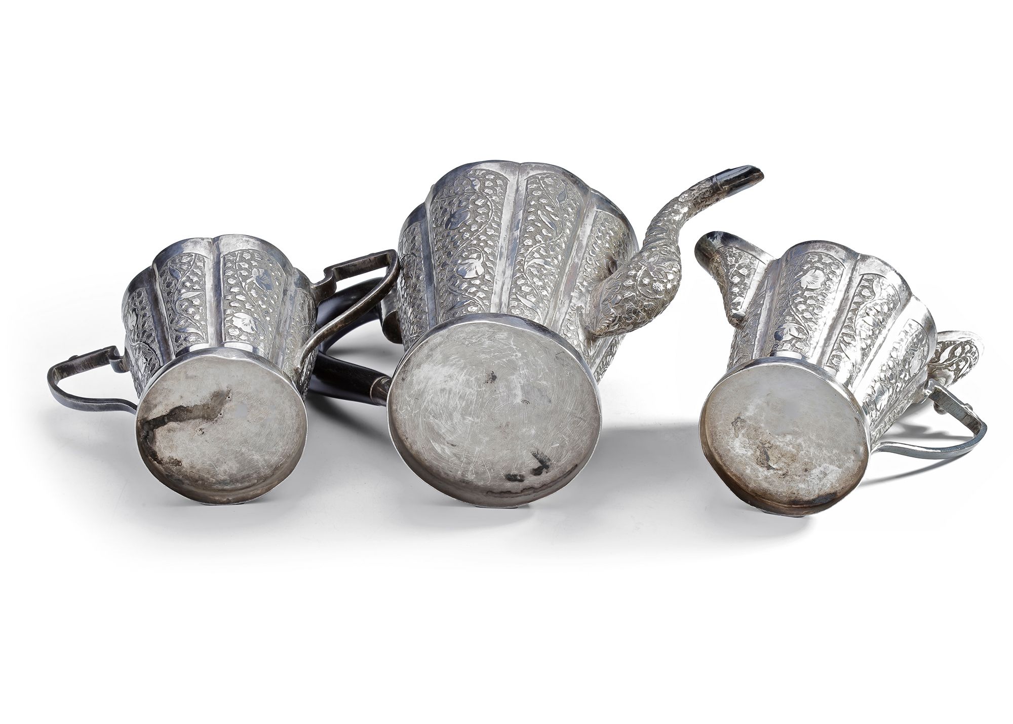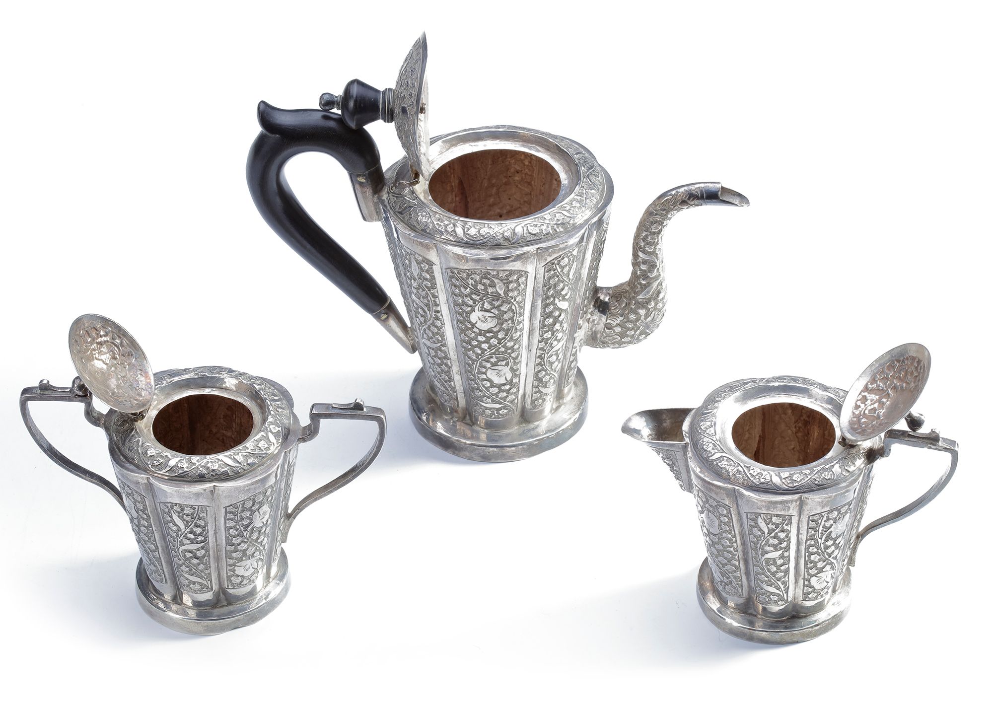 Comprising a teapot, sugar bowl, and milk jug. Each piece is finely crafted with intricate openwork floral and vine patterns.