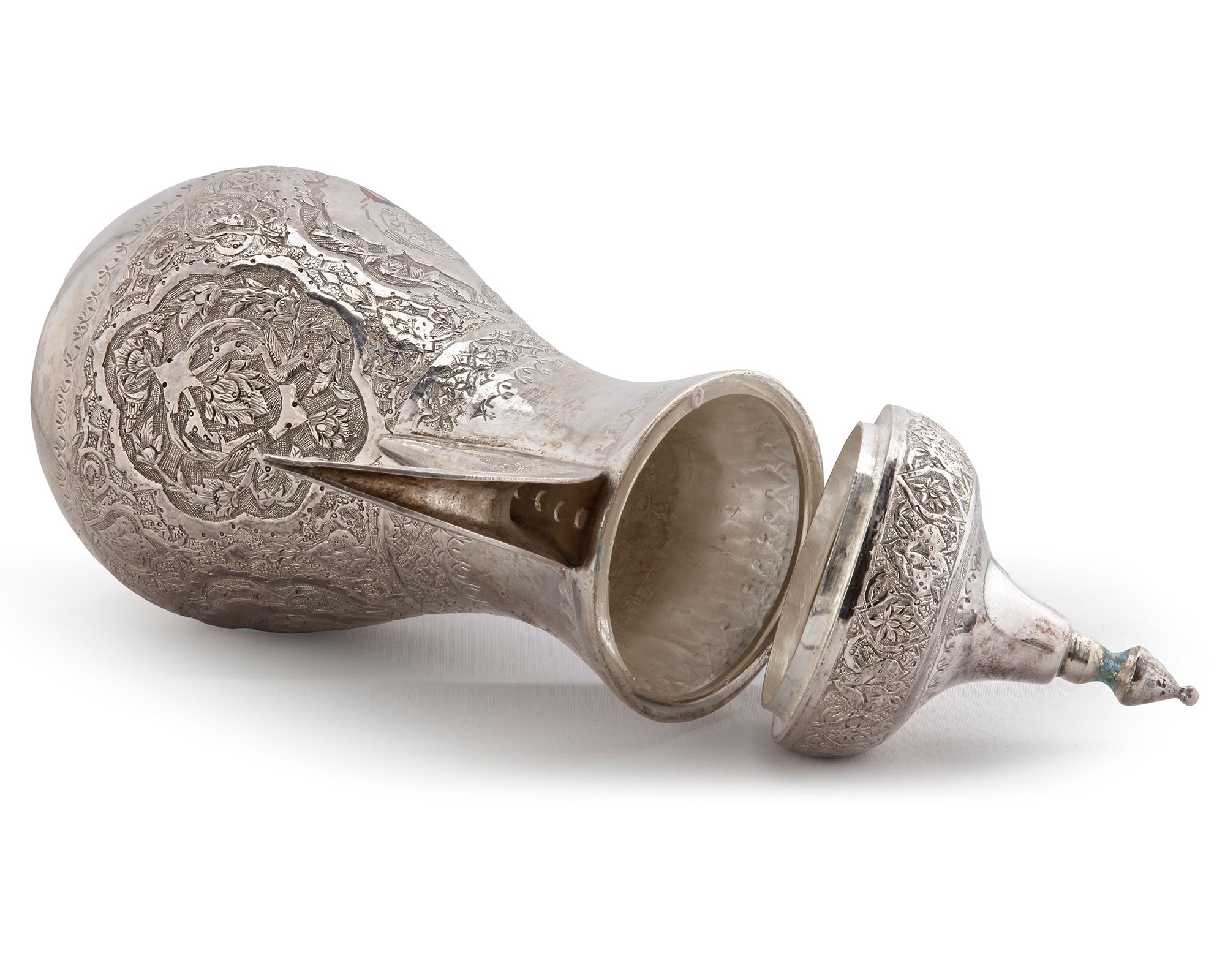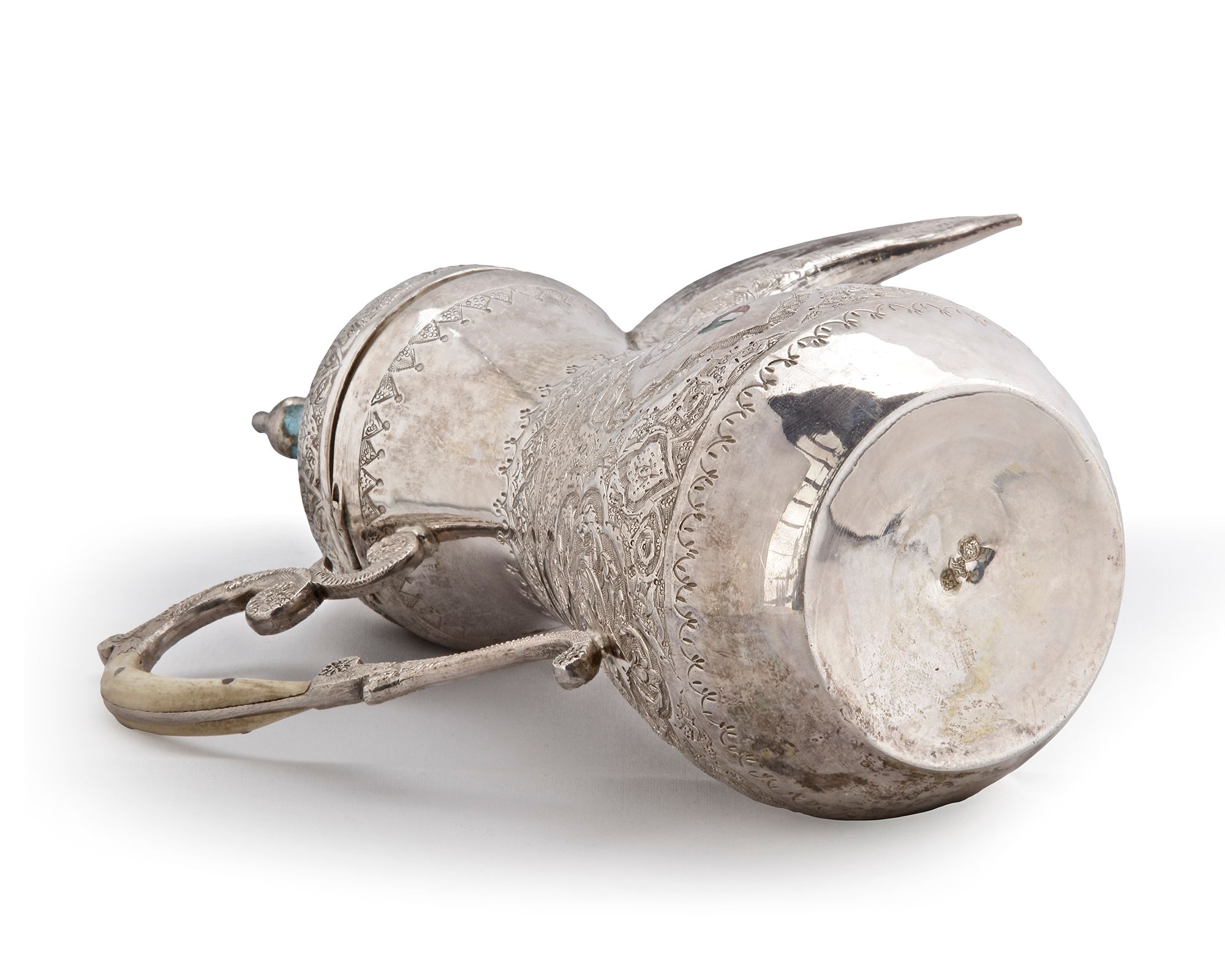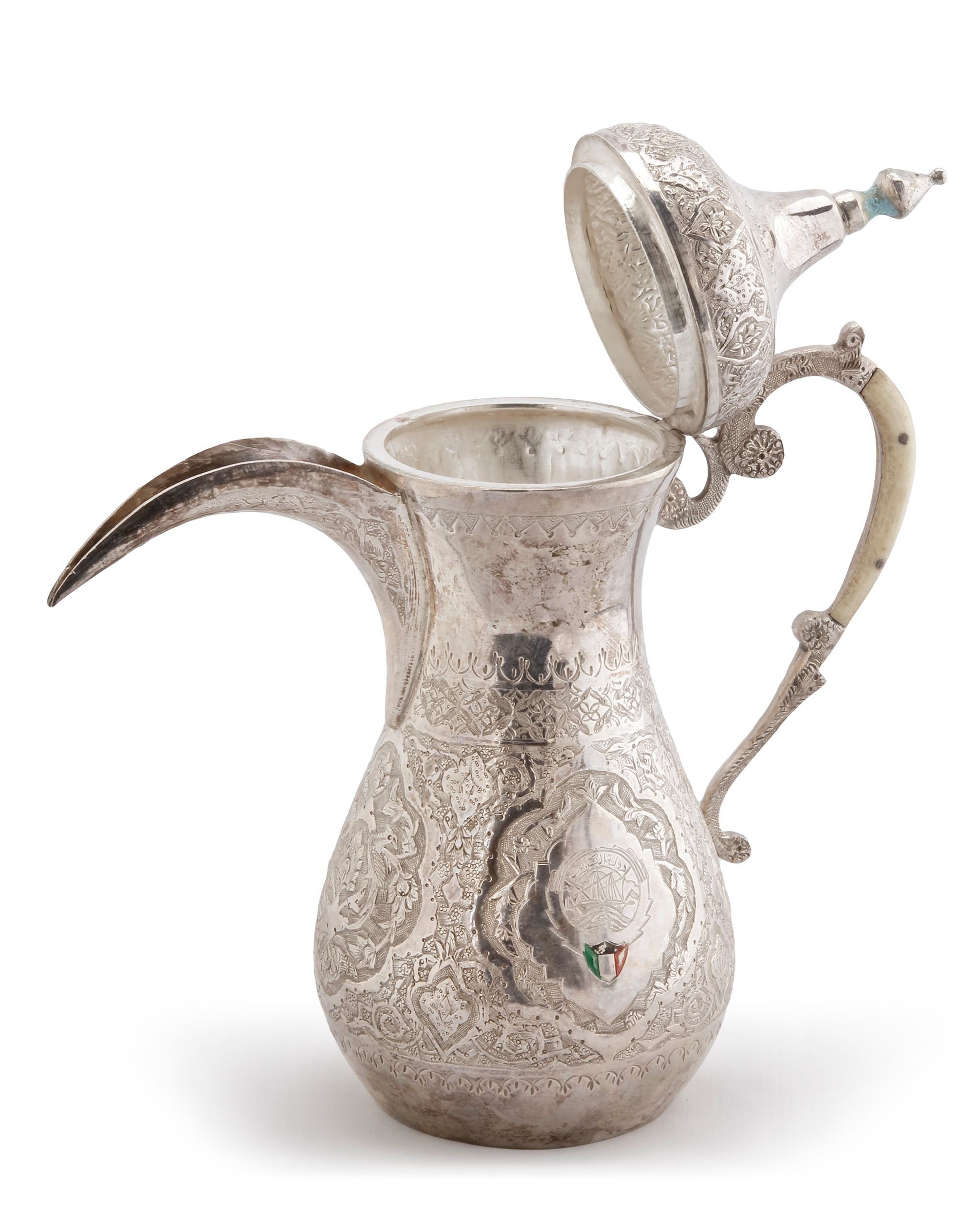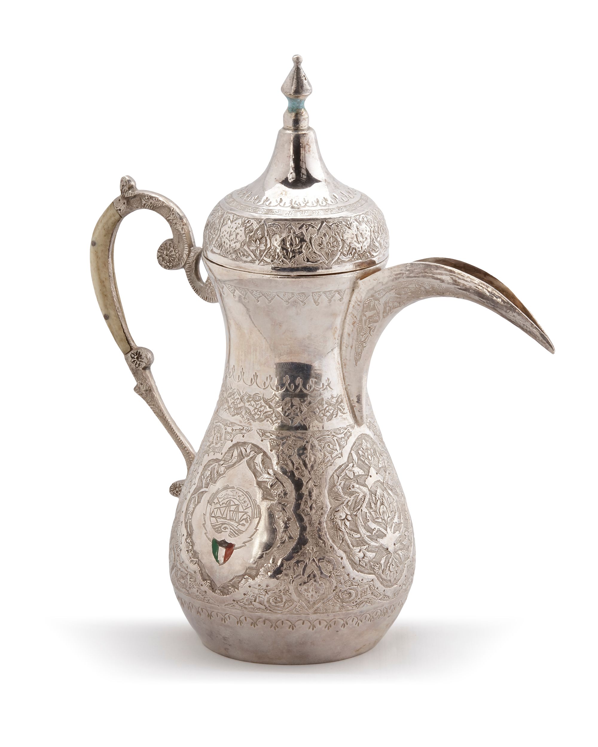 A traditional Kuwaiti silver dallah, finely engraved with intricate arabesque and floral motifs, featuring a tall spout and domed lid, used for serving Arabic coffee.