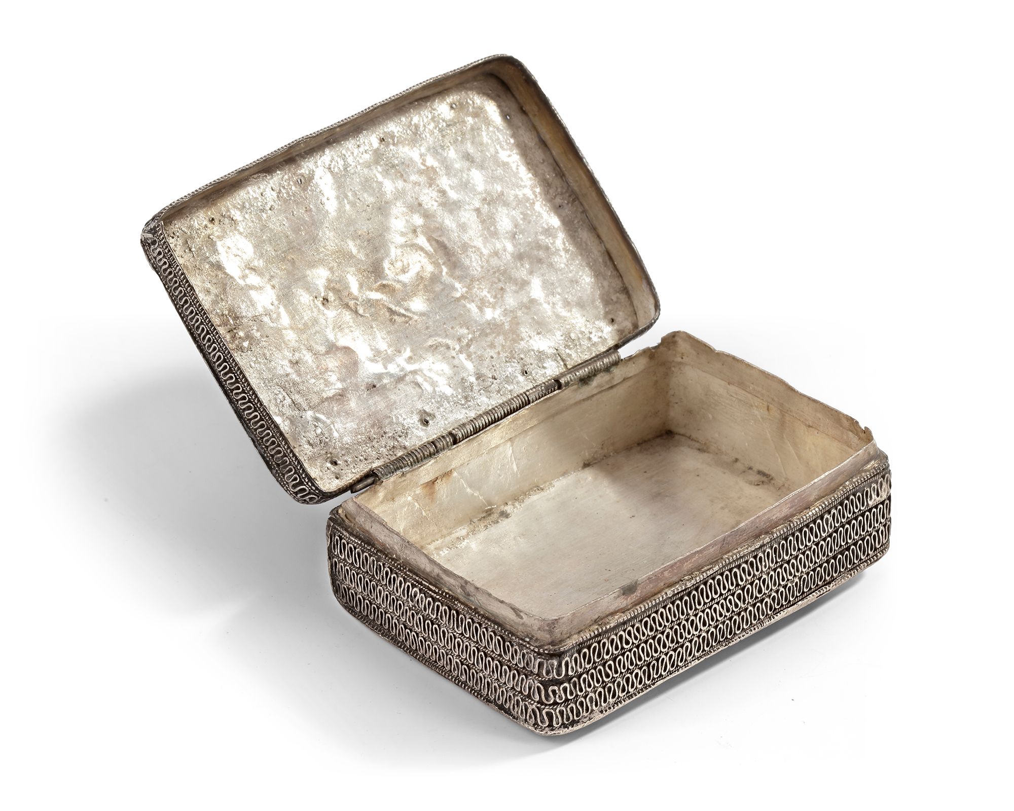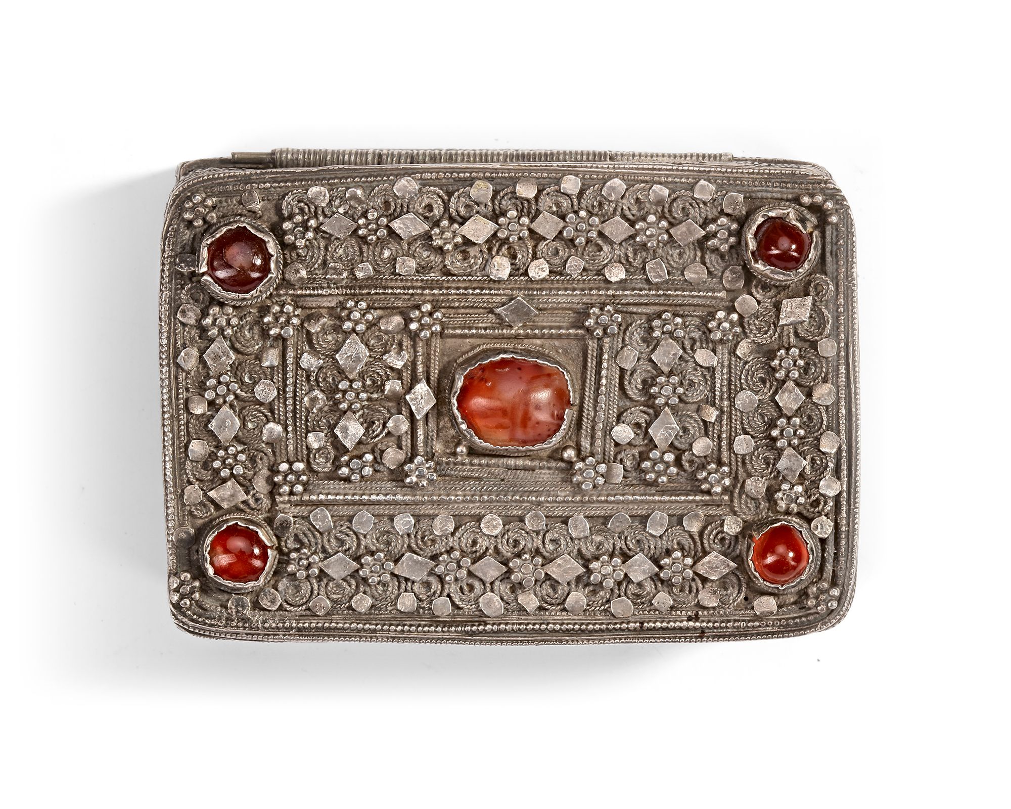 Richly decorated with intricate filigree, granulation, and geometric motifs. The lid is set with five polished red stones, including a larger central cabochon, framed by detailed silver work.