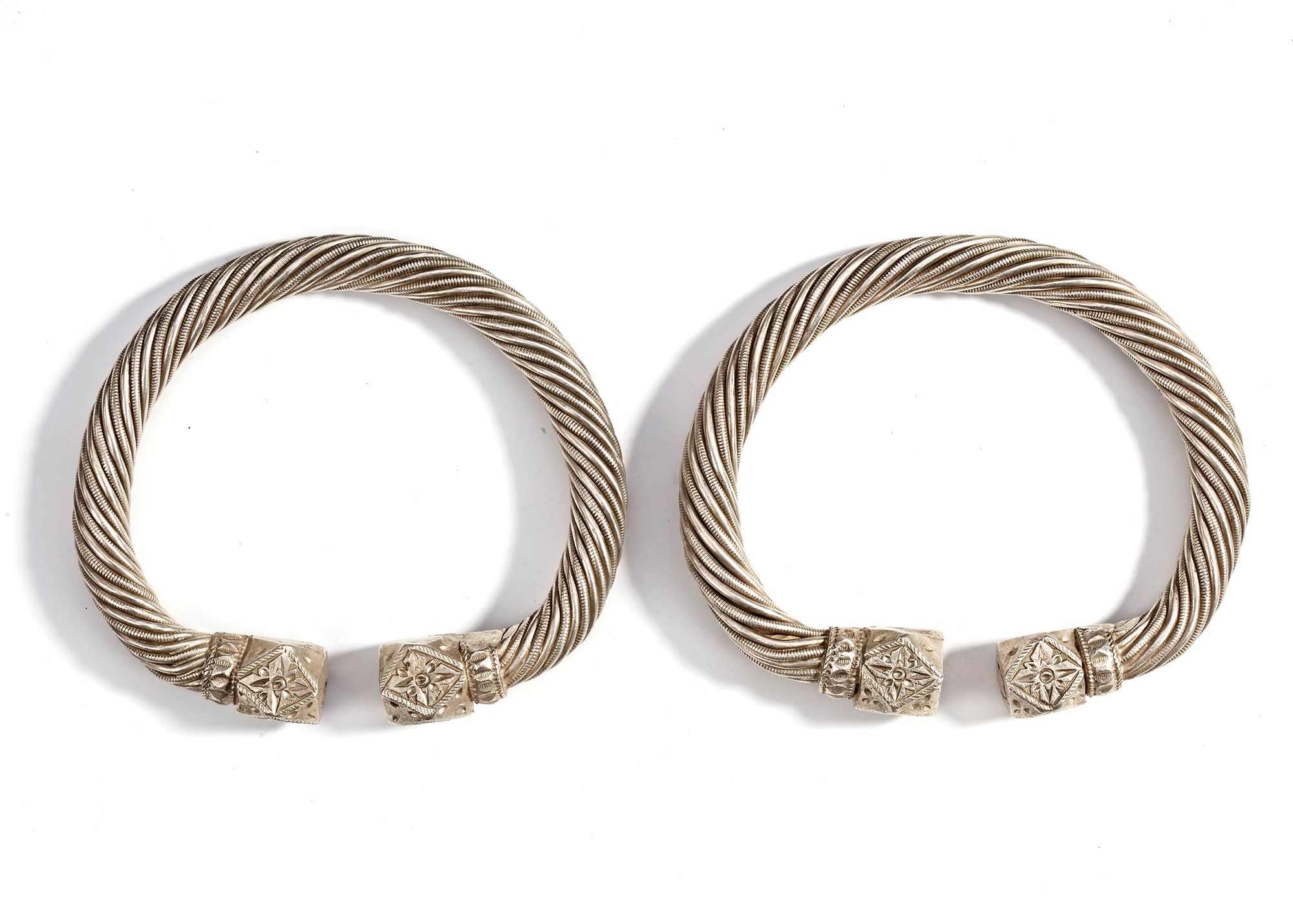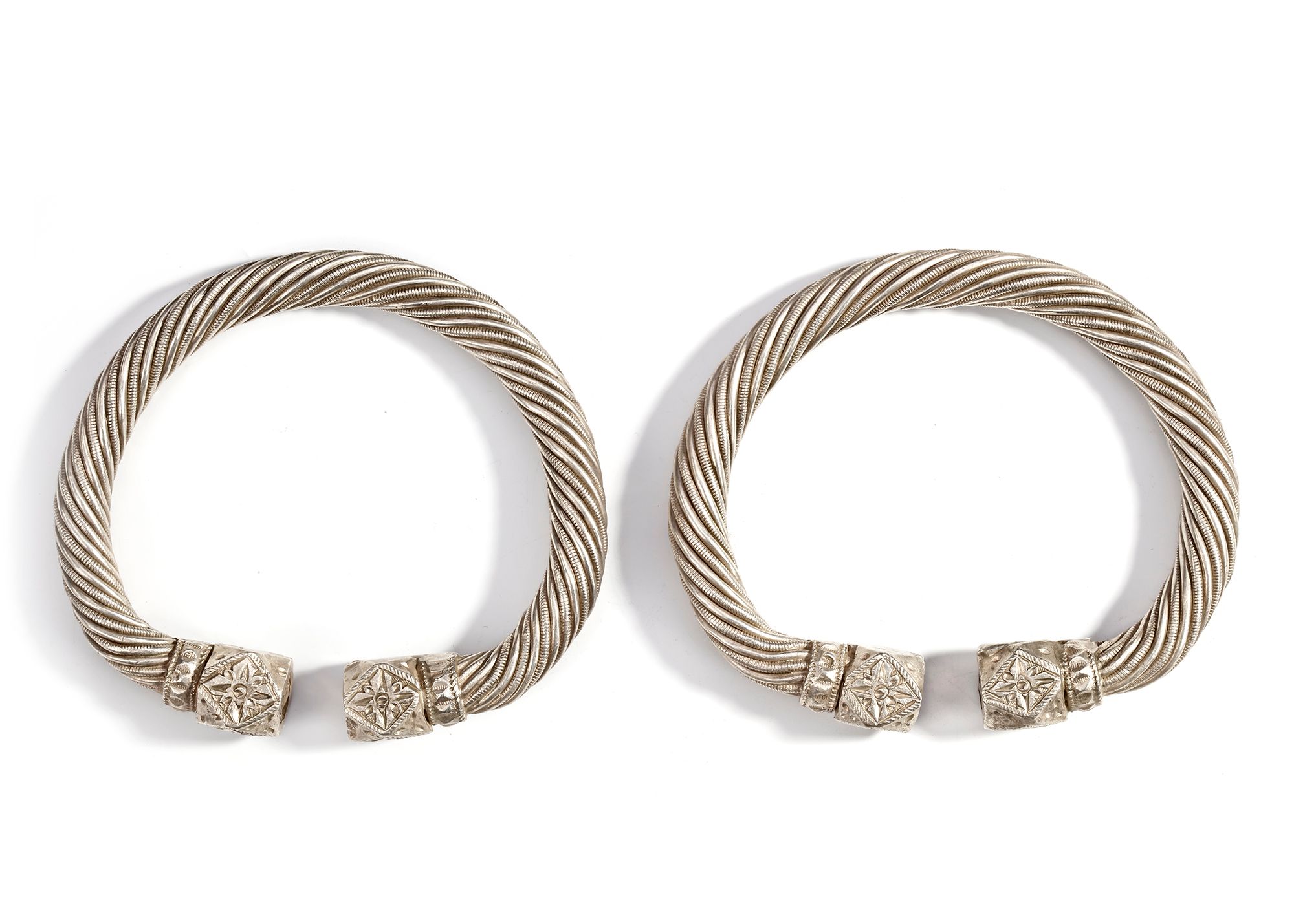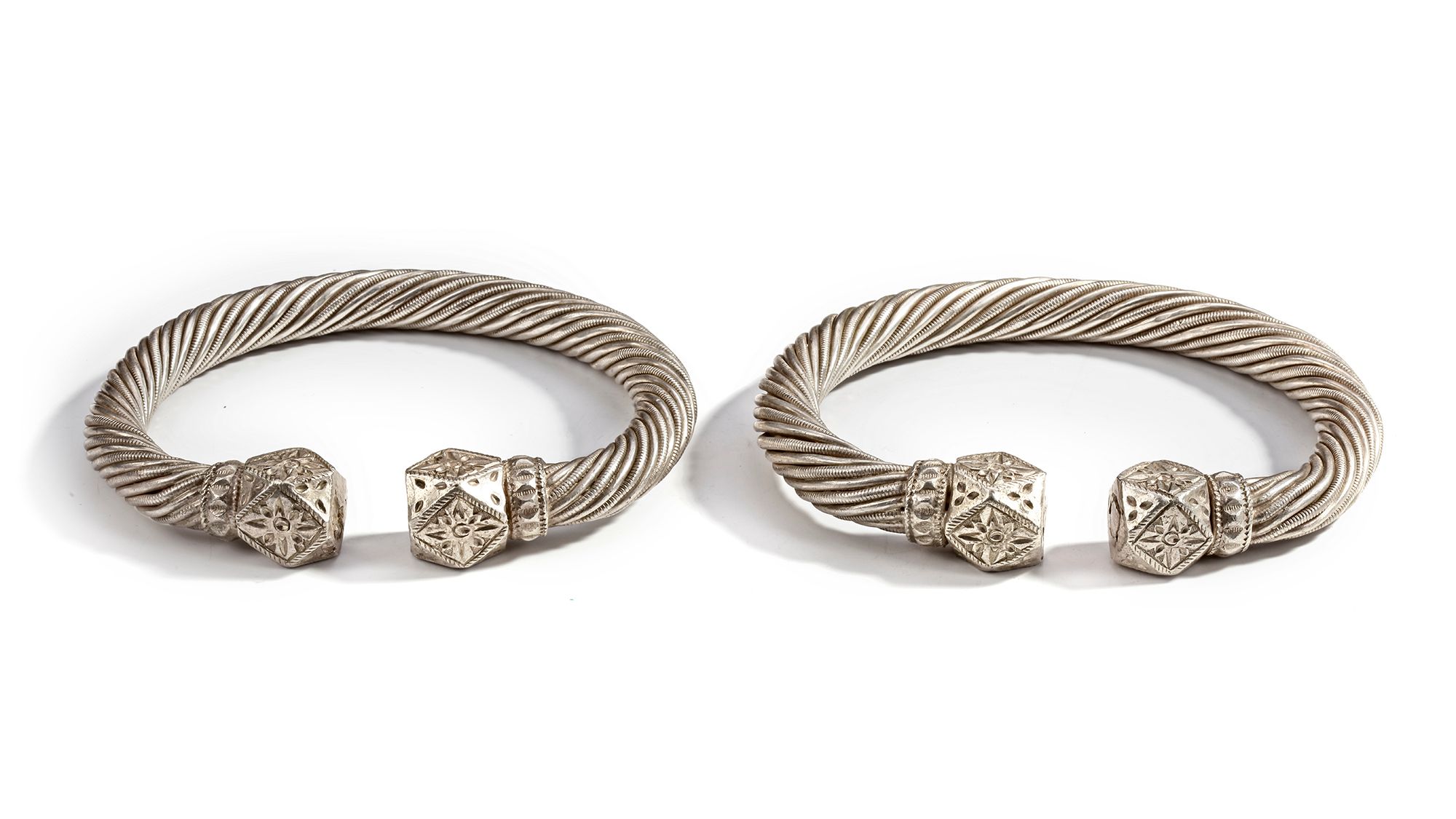 A pair of heavy Omani silver bracelets featuring twisted rope designs with finely engraved geometric hexagonal terminals.