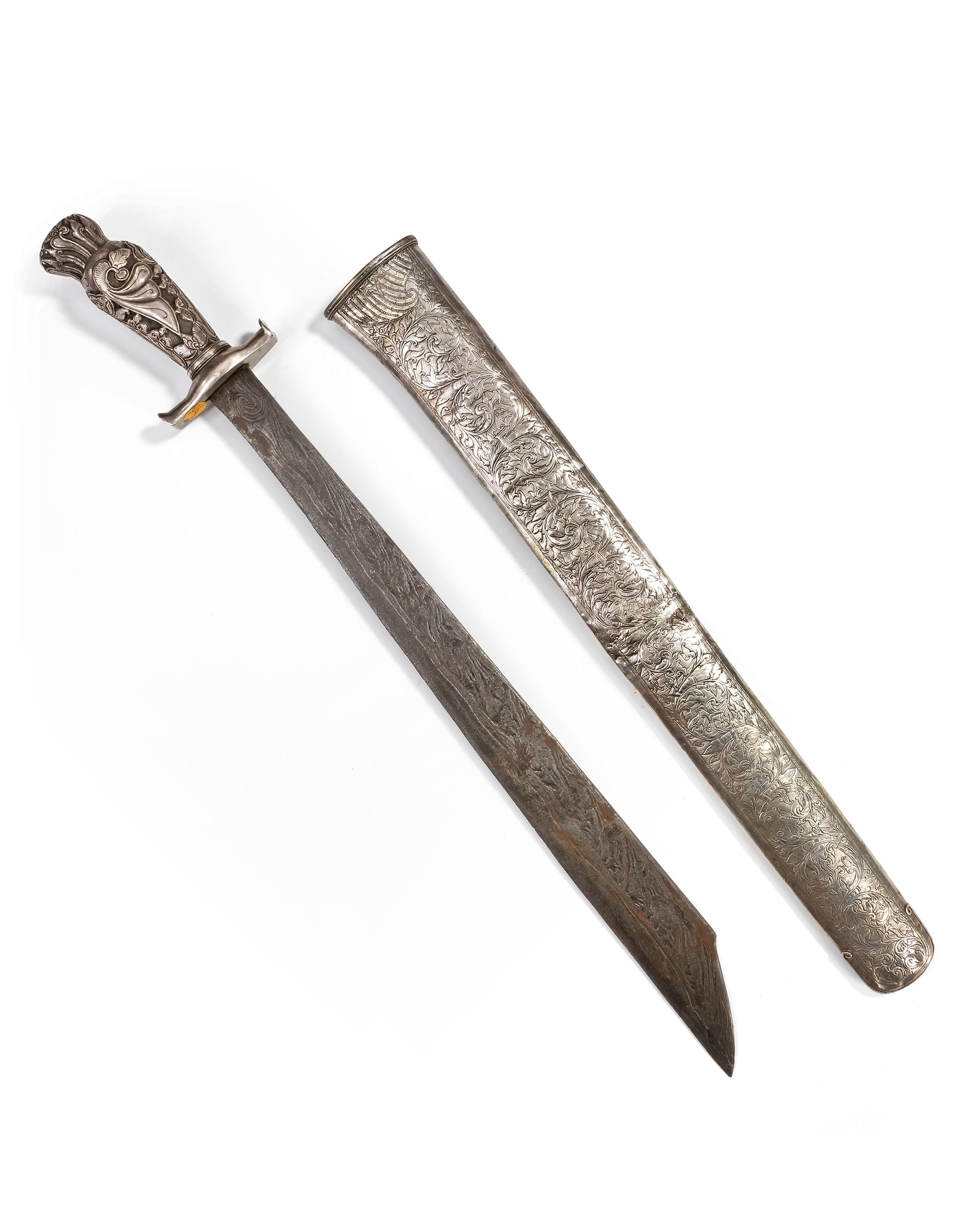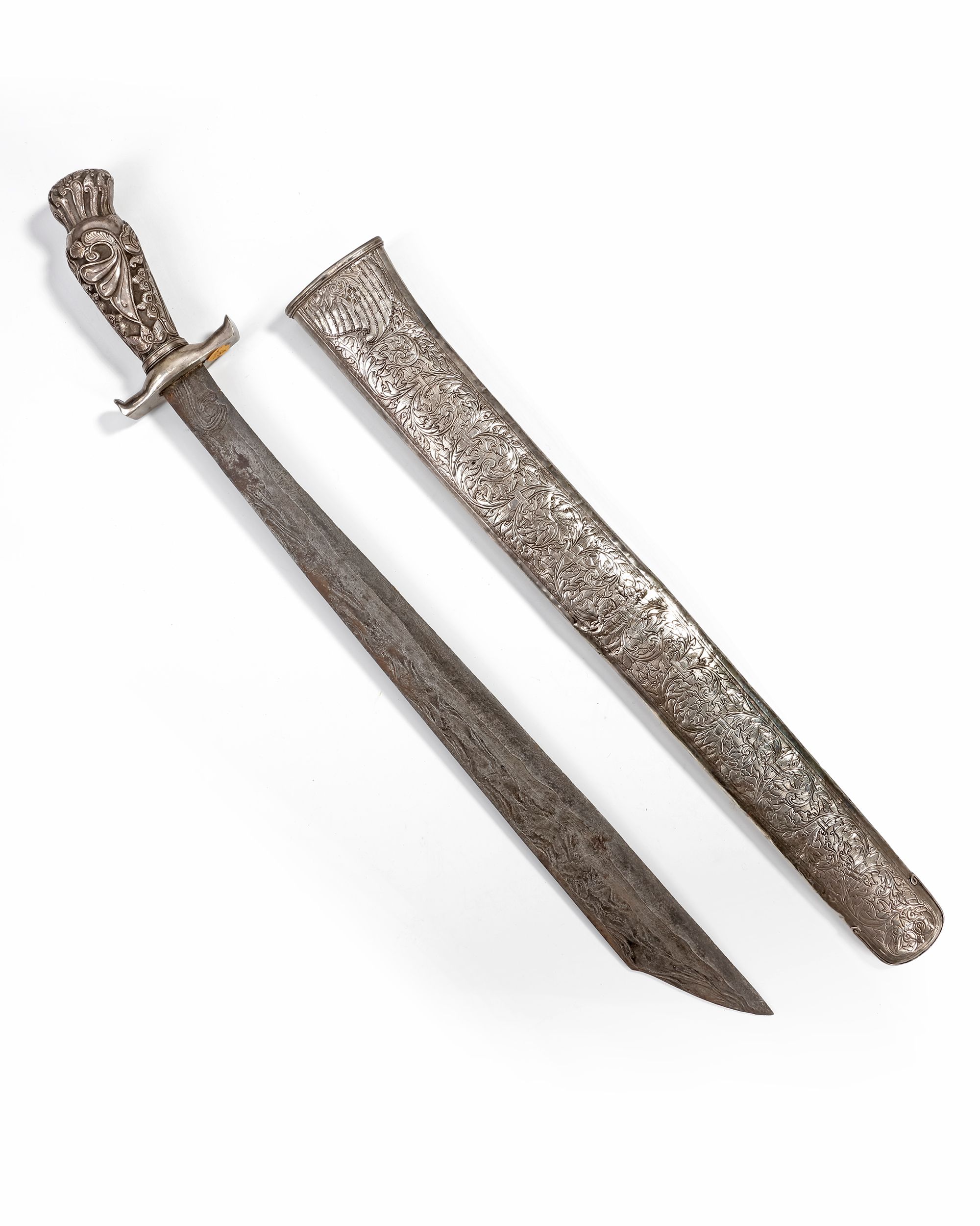 With a finely crafted silver hilt and scabbard. The handle and sheath display intricate floral and scrollwork engravings. 53 cm. 542 gr.