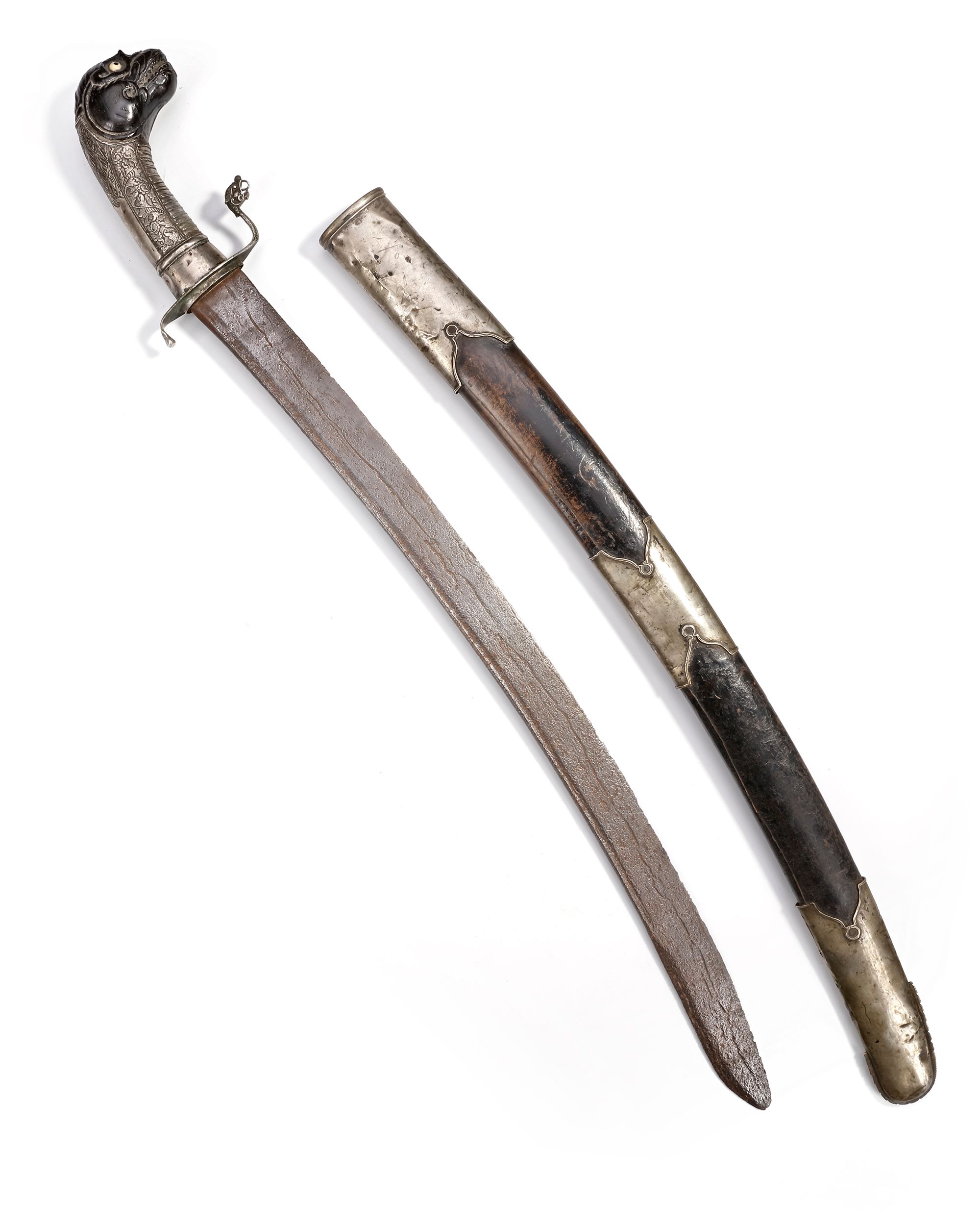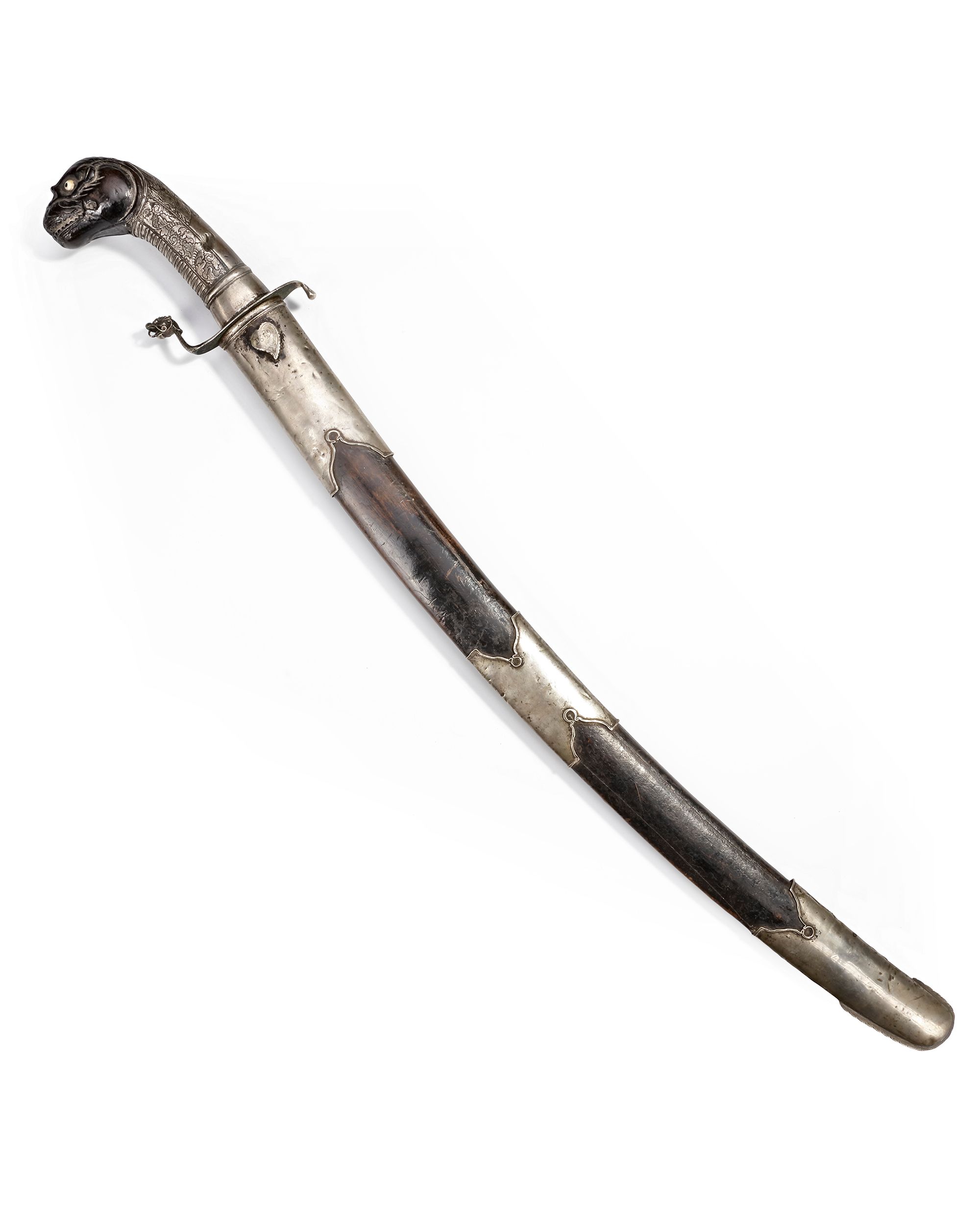 An ornate Indian sword from the 18th century, featuring a slightly curved steel blade housed in a silver-mounted scabbard. The hilt is richly decorated, ending in a striking animal-head pommel with intricate detailing and inlaid eyes. Floral engravings enhance the grip, while the guard includes zoomorphic motifs.
