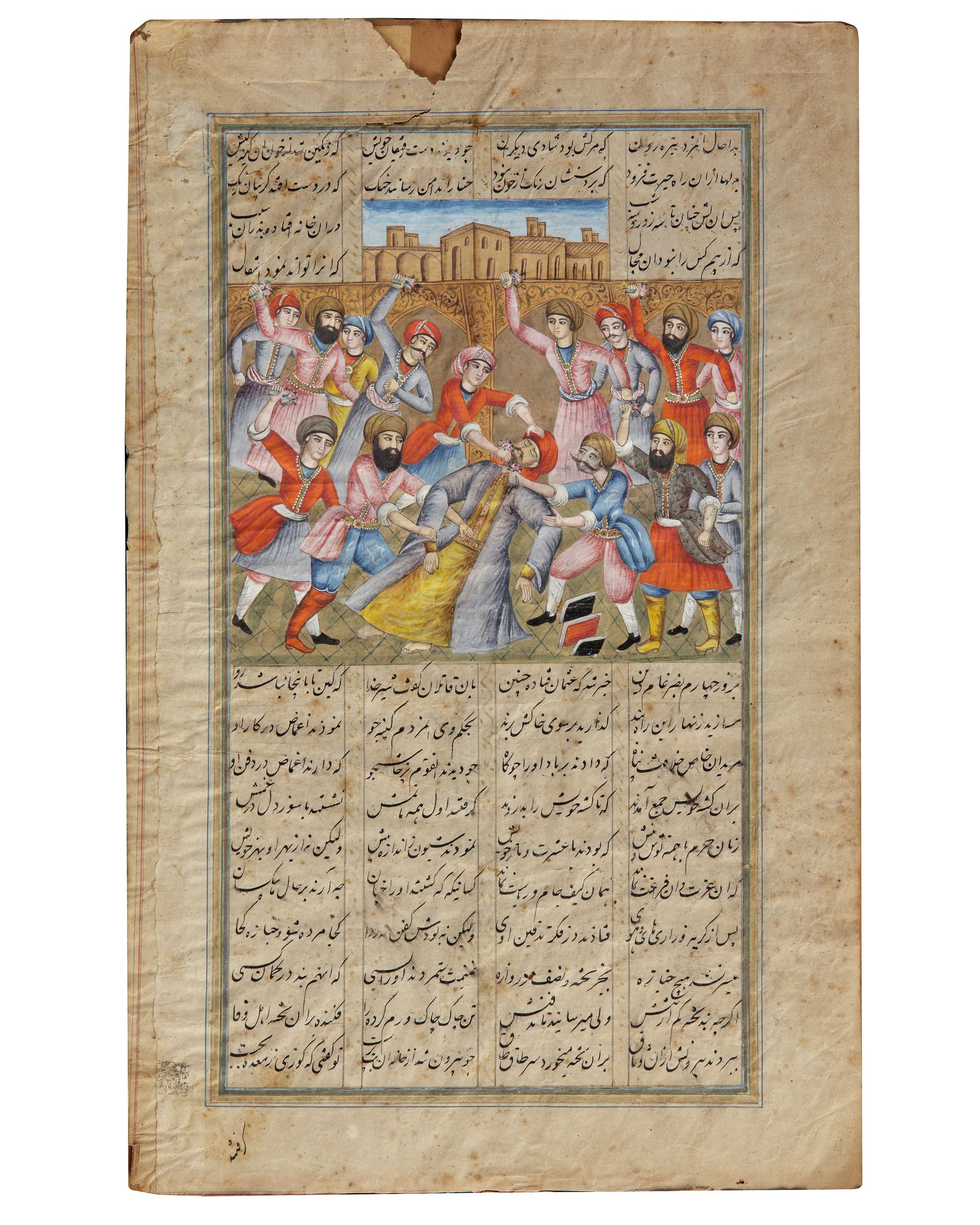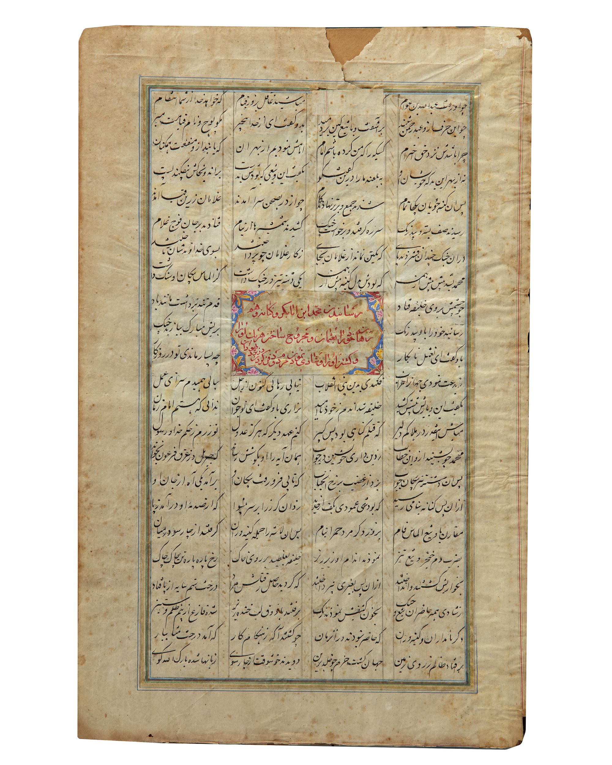 An Islamic Persian calligraphy leaf, gouache heightened with gold scene of court, with Persian poems in Nastaliq script, all within coloured and gilt borders.