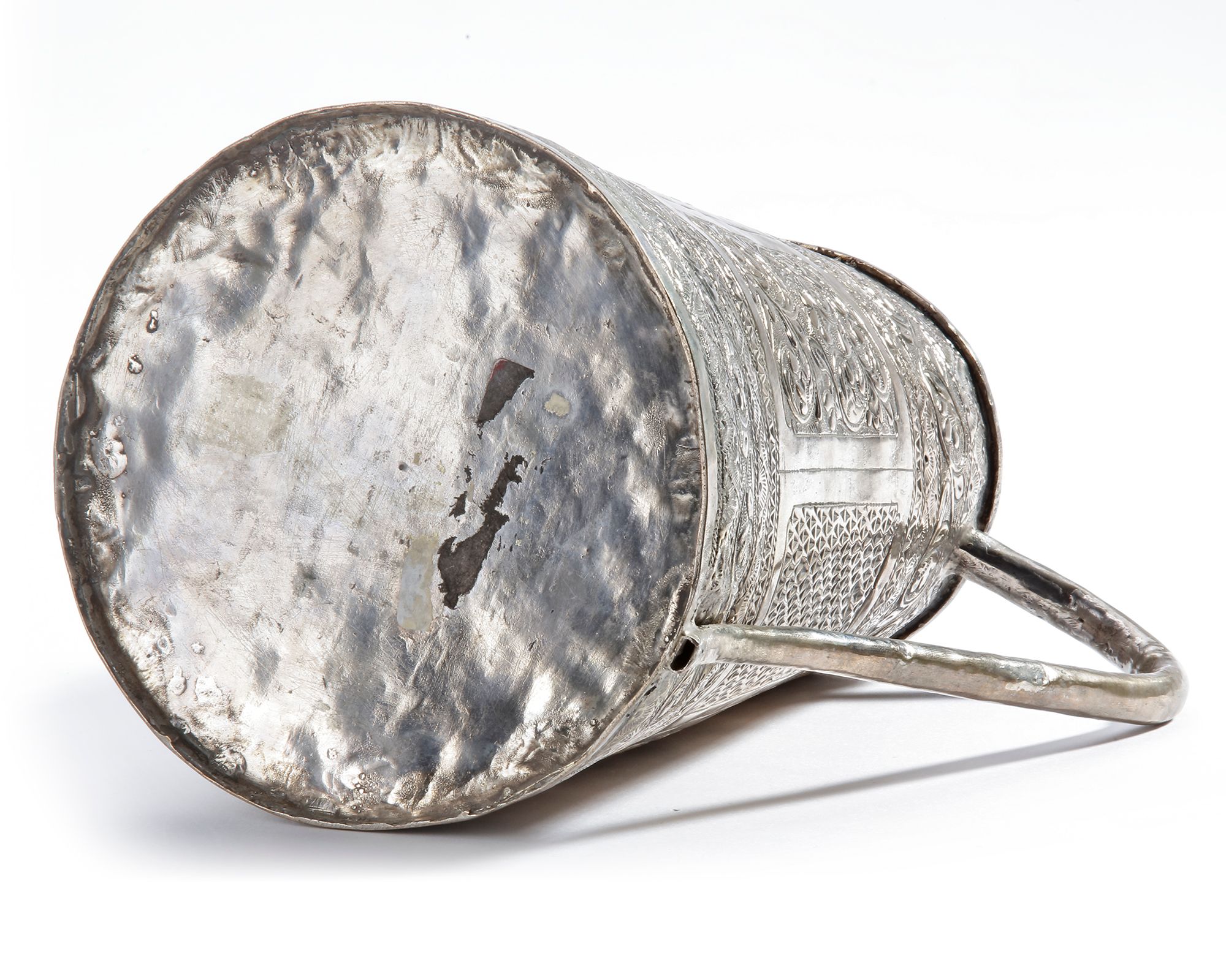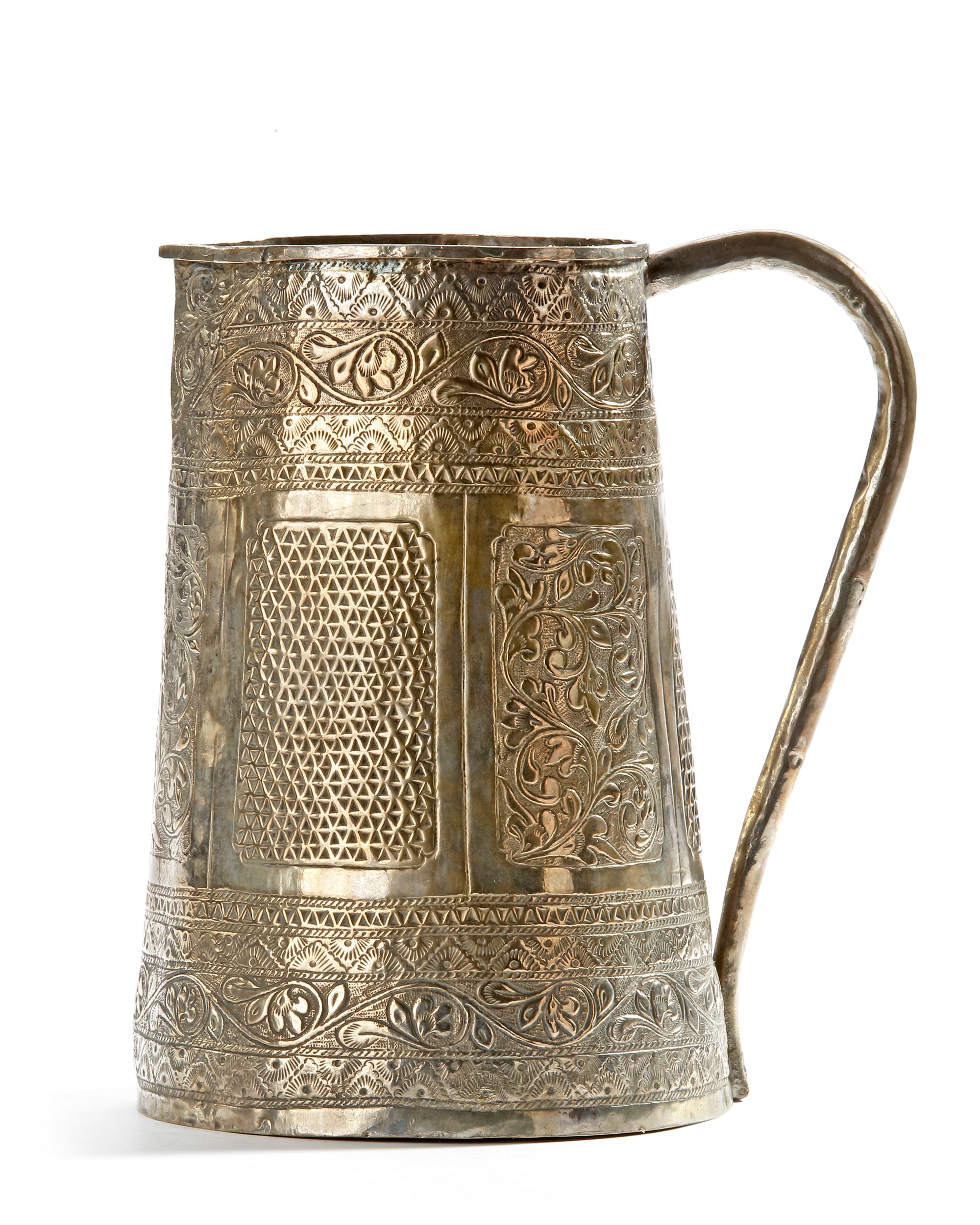 Richly decorated with intricate floral and geometric engravings. Its elegant handle and detailed repoussé patterns.