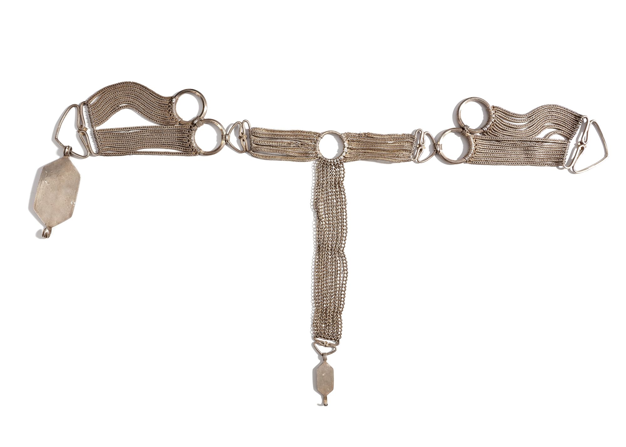 Composed of multiple fine chains linked by circular elements. Decorated with geometric pendants. 63 by 28 cm. 395 gr. THE DR. SAAD AL-JADIR COLLECTION