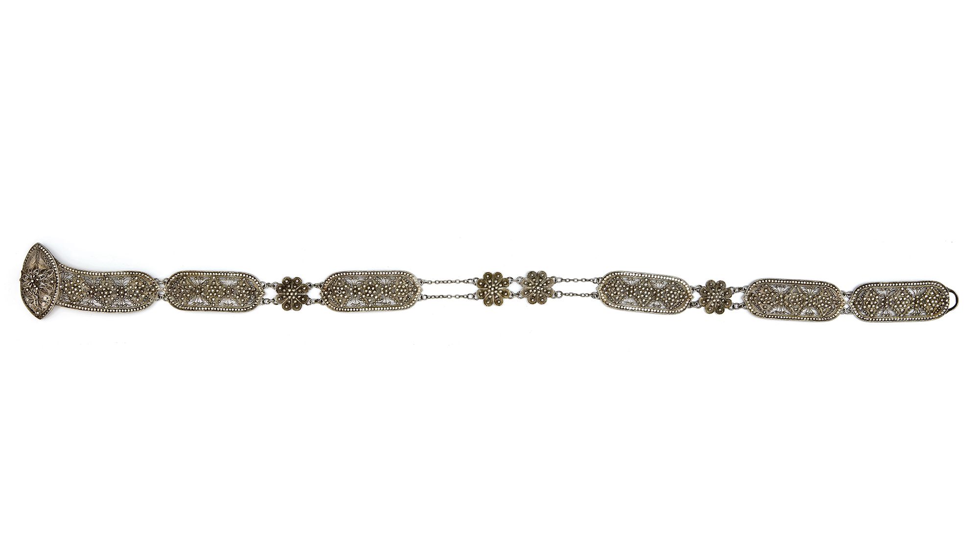 Composed of intricately pierced floral panels linked together. The central clasp features a rosette design.