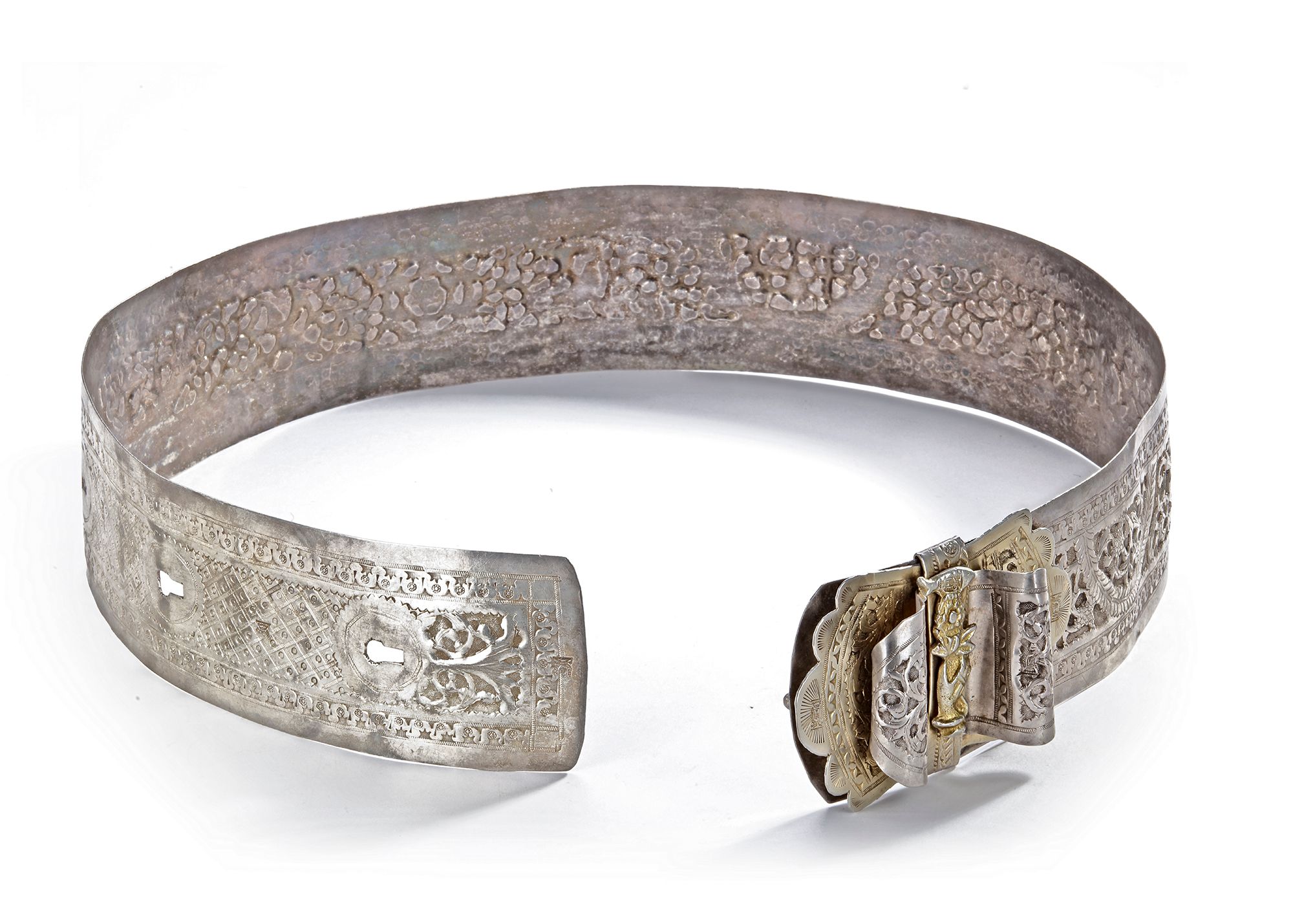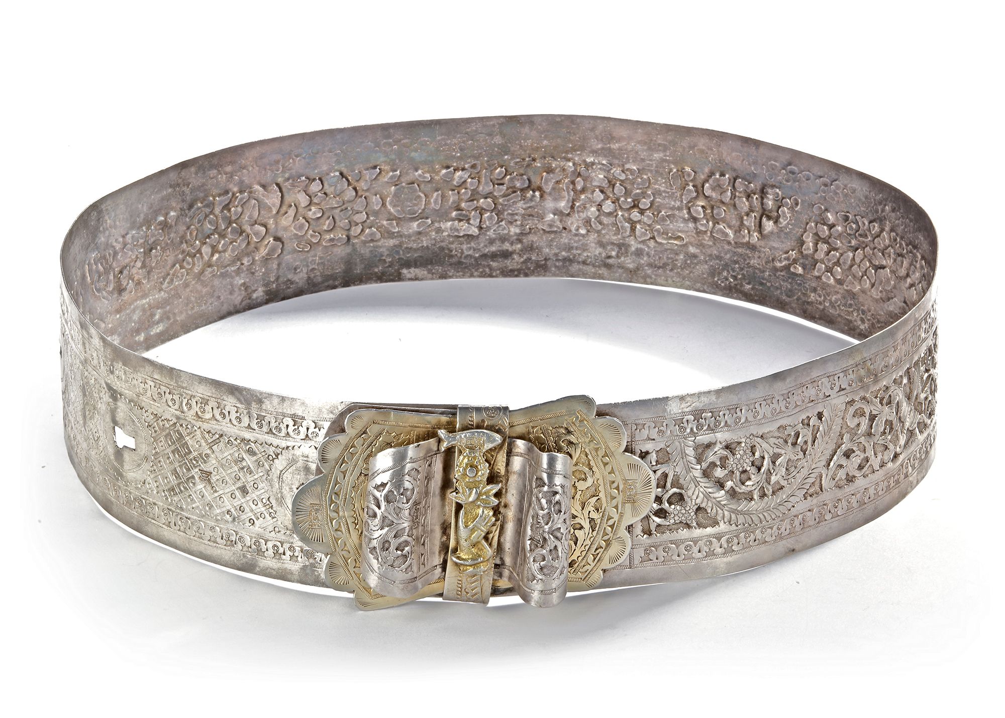 Richly decorated with intricate floral and geometric engravings, featuring a prominent gilded buckle with symbolic motifs of strength and prestige.