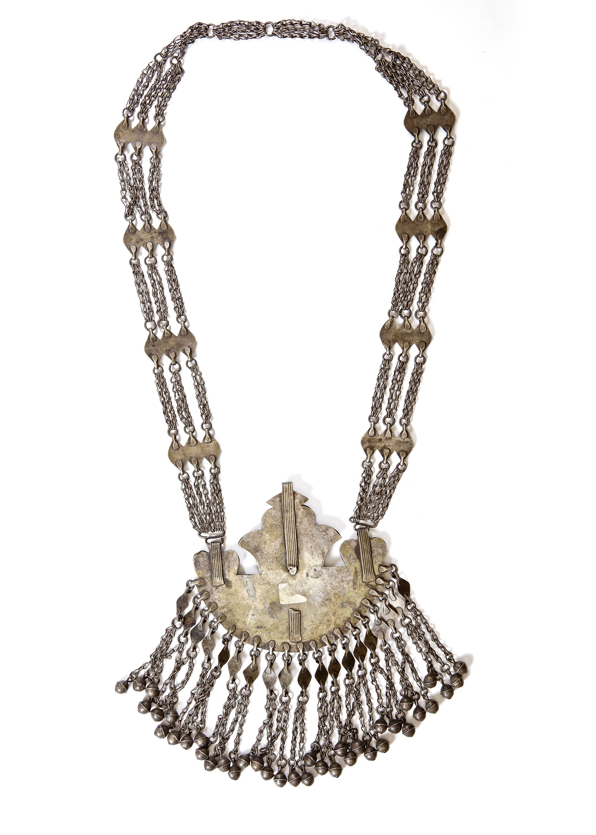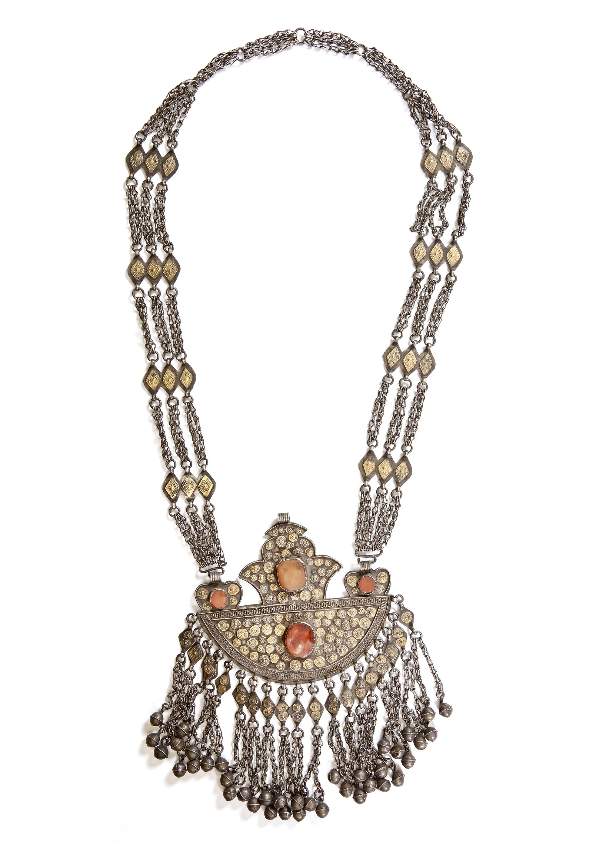 Richly decorated with gilded circular motifs, red carnelian stones, and intricate chainwork. The large crescent-shaped pendant is adorned with dangling bells and ornate details.
