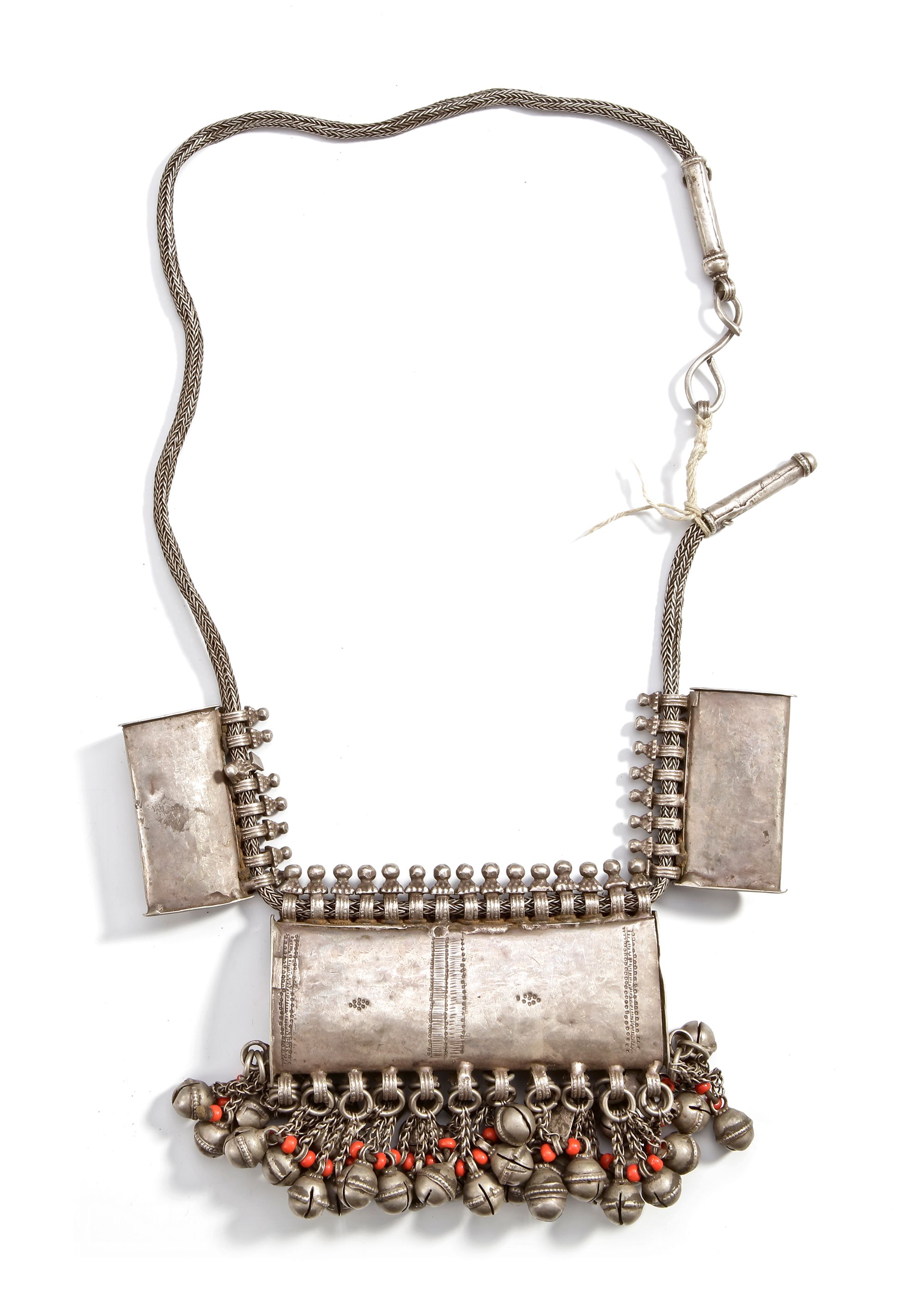 Featuring an amulet case with fine engraved patterns, adorned with coral beads and multiple hanging bells.