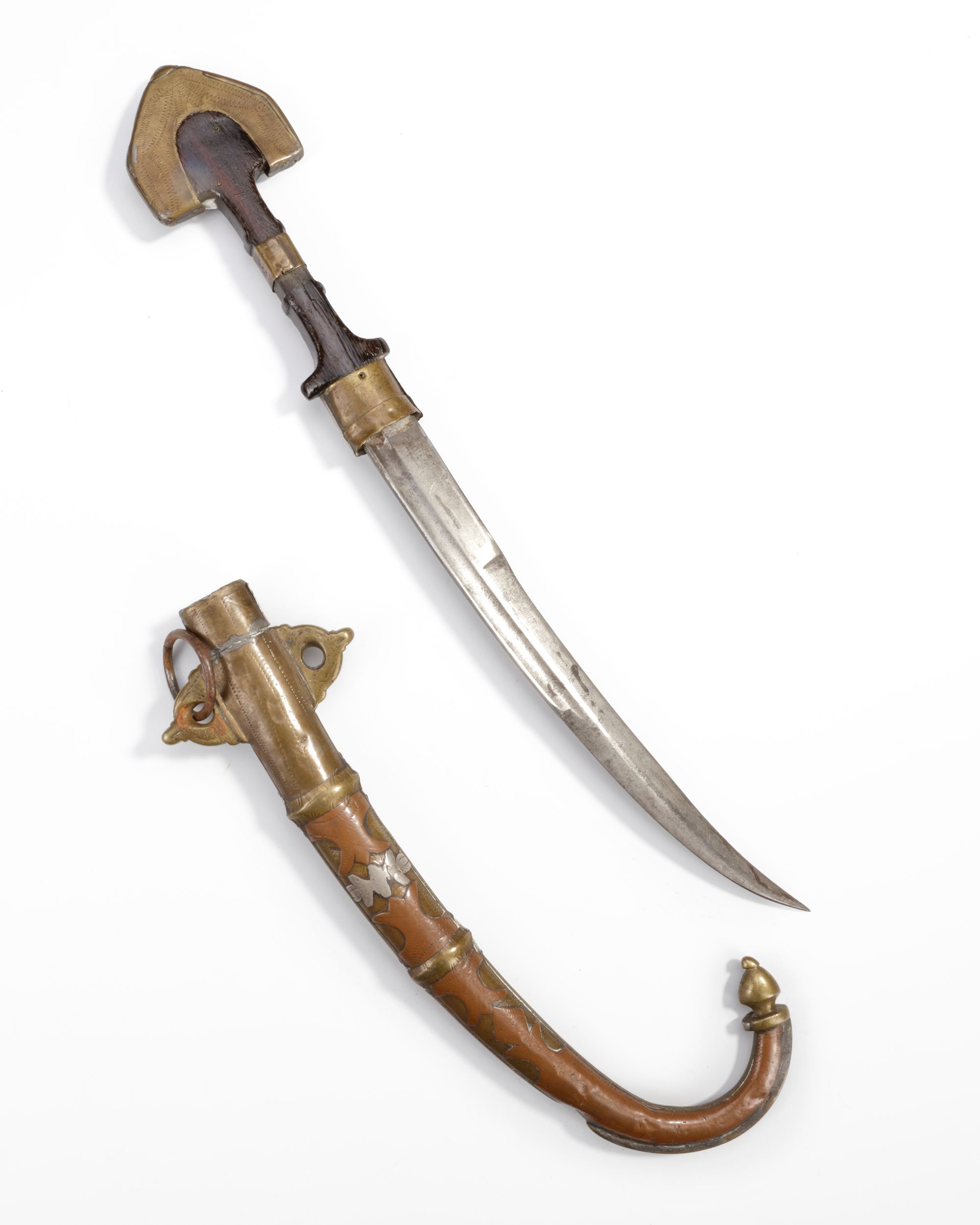 With a wooden hilt and silver mounts, richly engraved with geometric and floral motifs. The curved scabbard, decorated in fine silverwork.