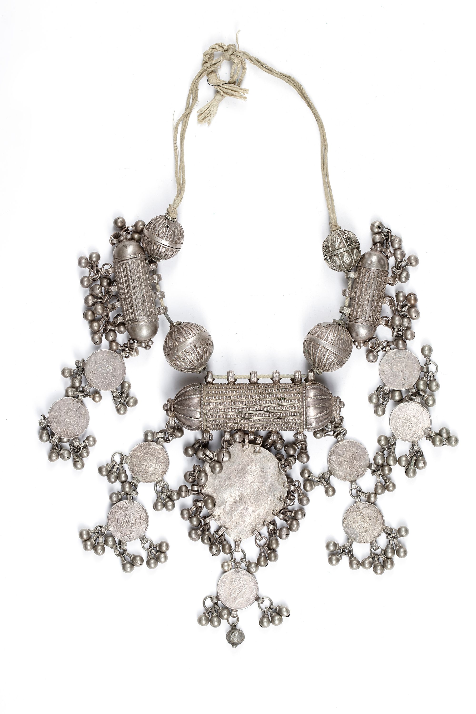Richly decorated with ornate filigree beads, engraved amulet boxes, and dangling coin pendants with small bells.