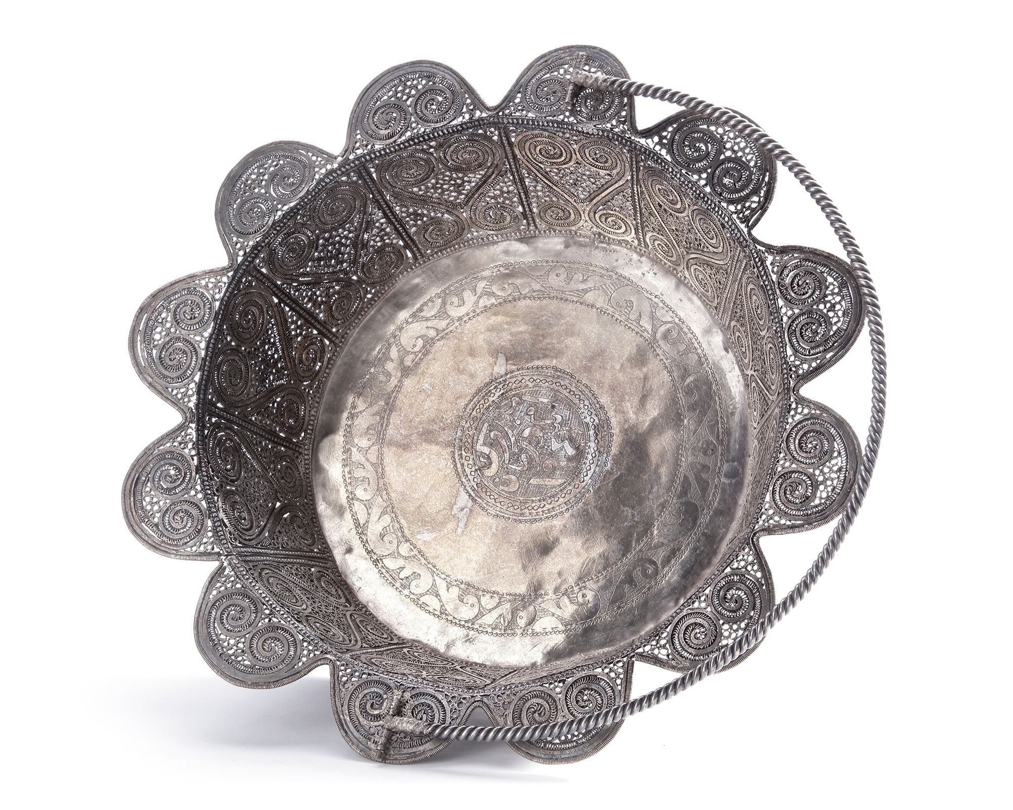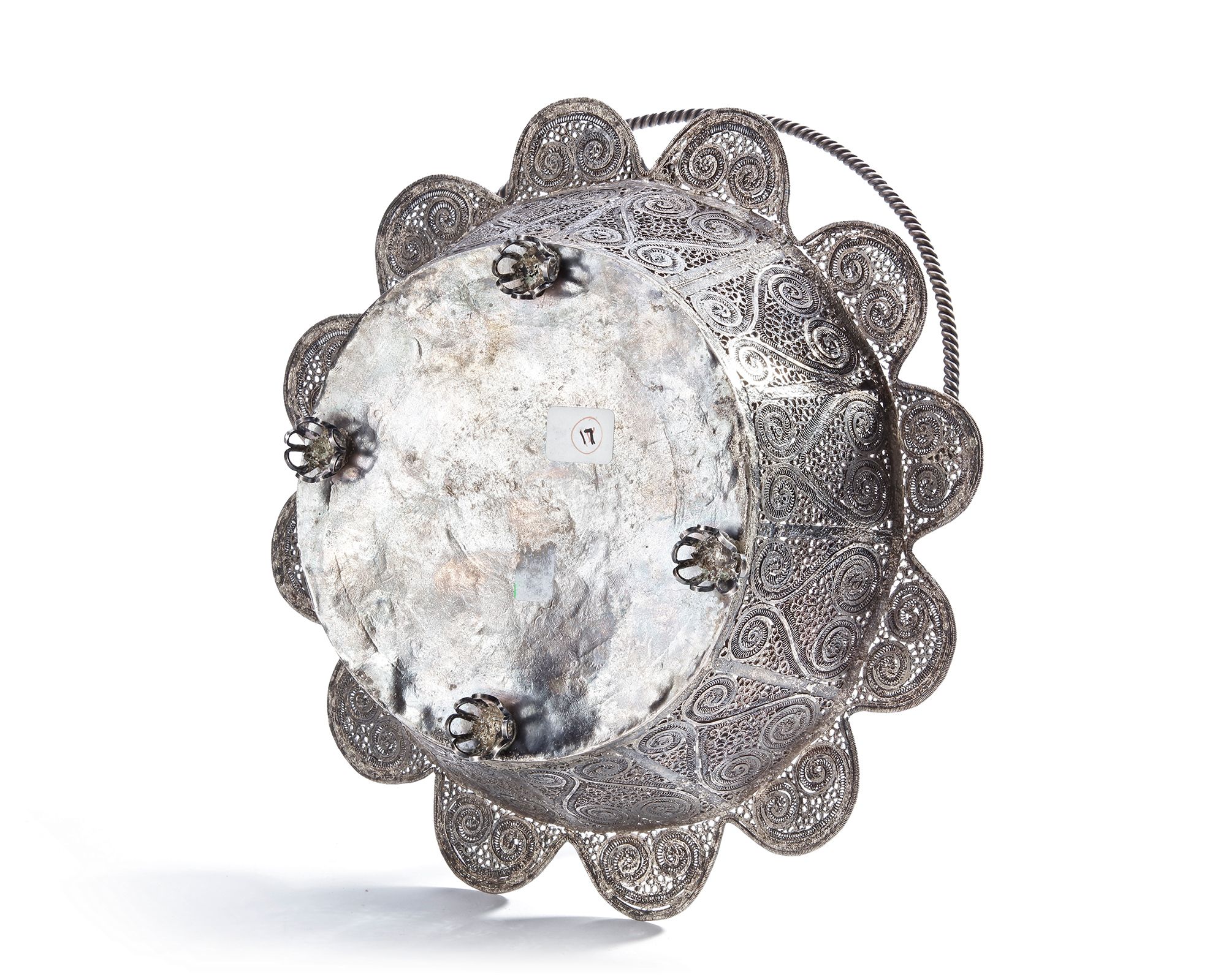 Finely crafted with intricate wirework and delicate openwork scrolls. The body is decorated with symmetrical spiral and lattice patterns, framed by scalloped edges forming a floral-like rim. Resting on four claw-form feet, the basket is fitted with a twisted silver handle.