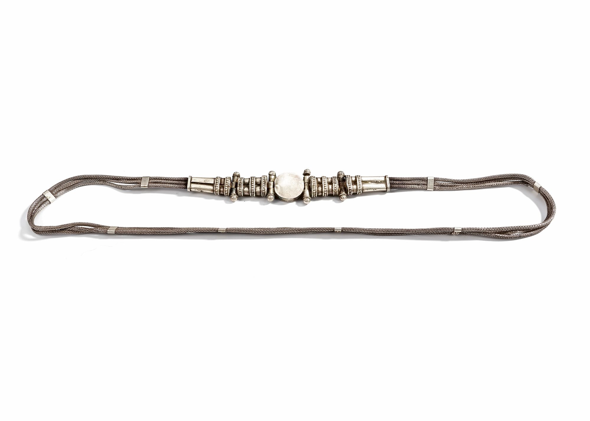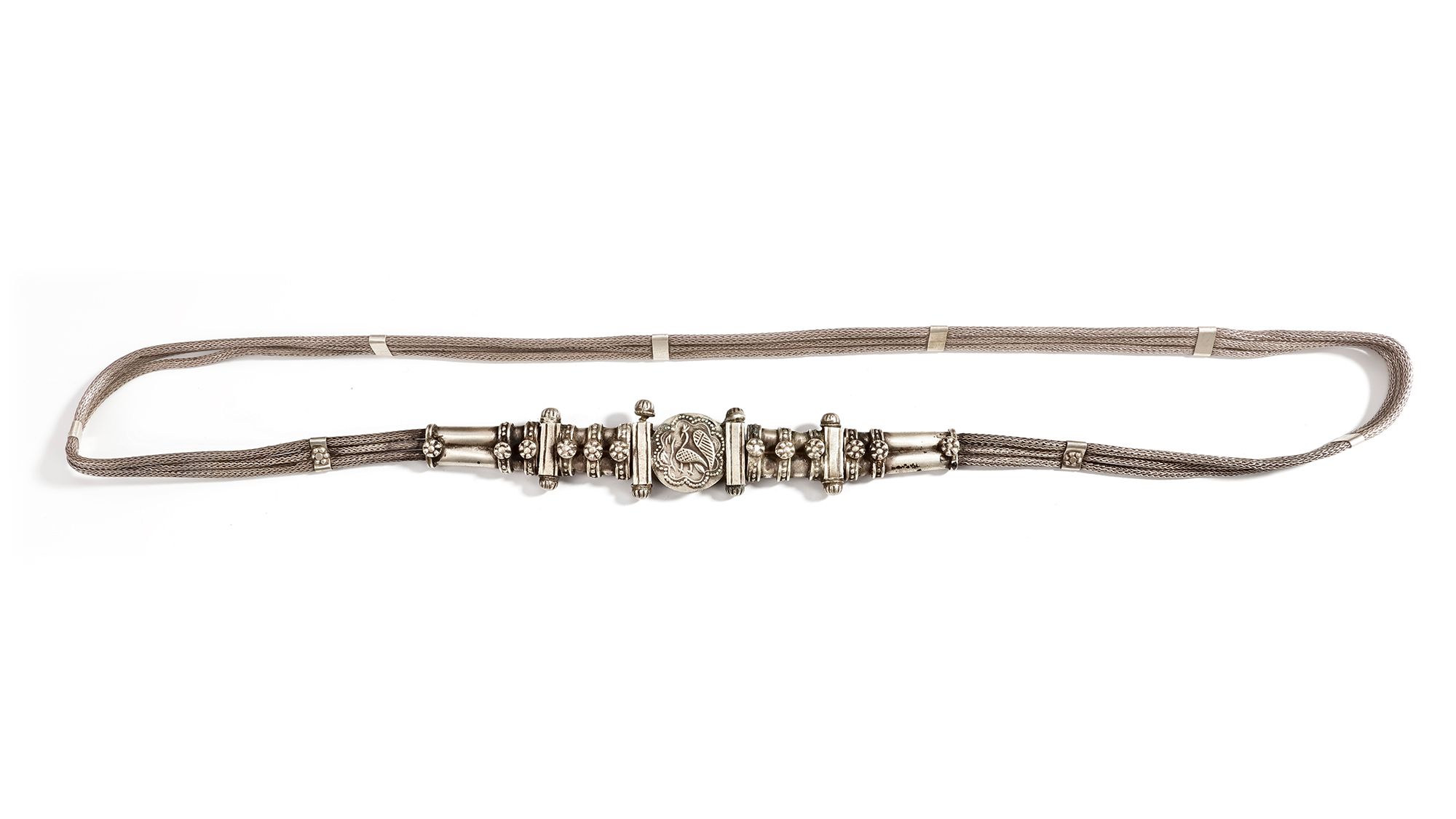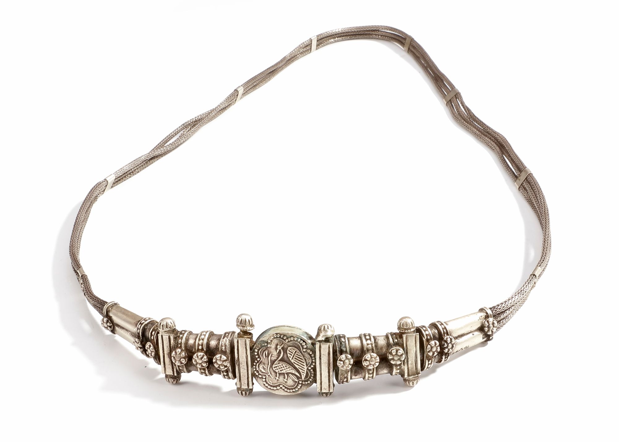Featuring multiple woven silver strands joined by a richly decorated central clasp with floral and bird motifs.