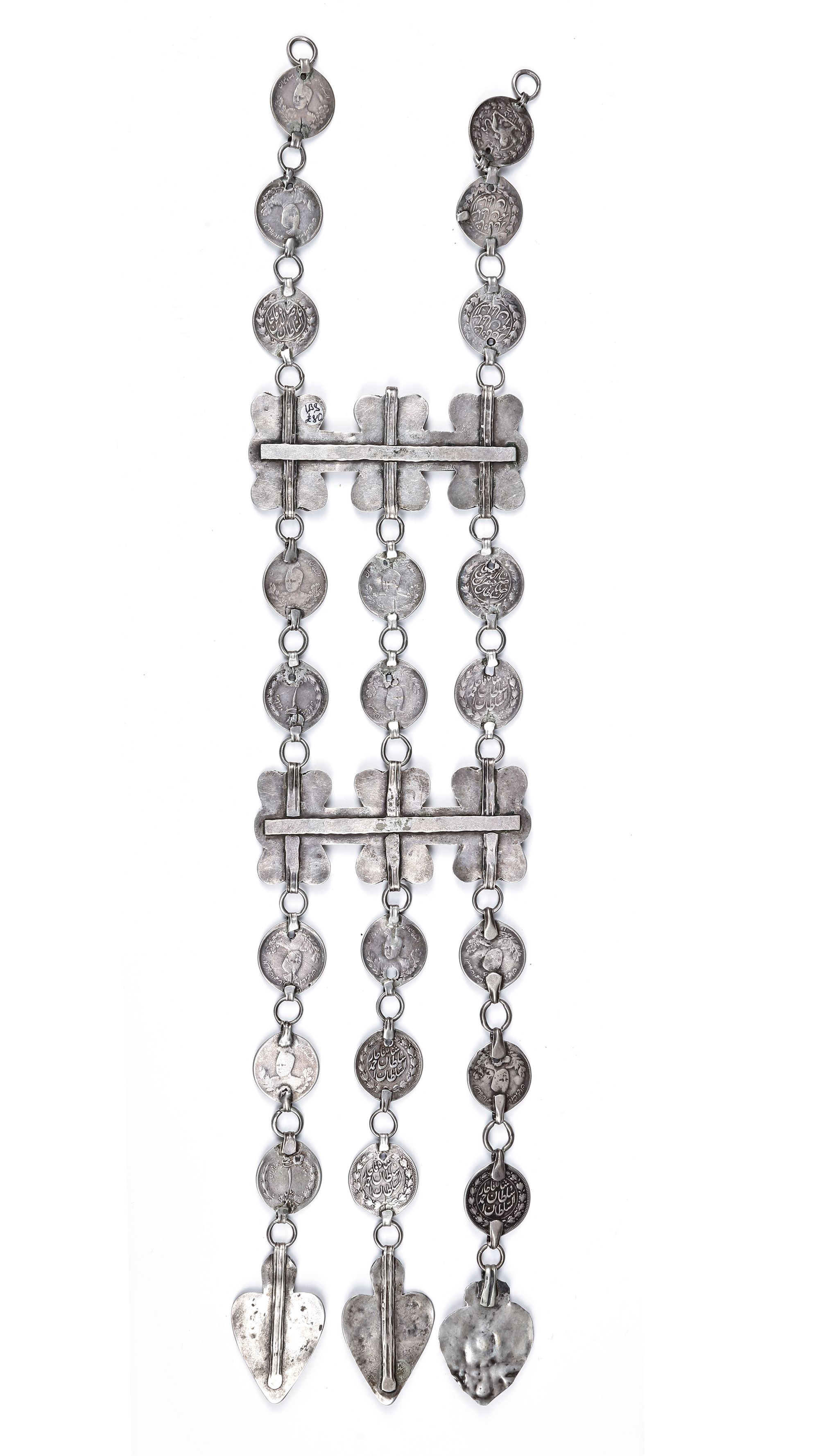 An impressive Turkmen silver adornment composed of linked coins, gilded plaques, and set gemstones. The chains feature Islamic silver coins with Arabic inscriptions and emblems, joined together with finely crafted connectors. Gilded rectangular plaques, decorated with filigree patterns and cabochon stones in red and green, form striking focal points. The lower section ends in heart-shaped pendants enriched with engraved and gilded details. 45 by 9,5 cm. 189 gr. THE DR. SAAD AL-JADIR COLLECTION