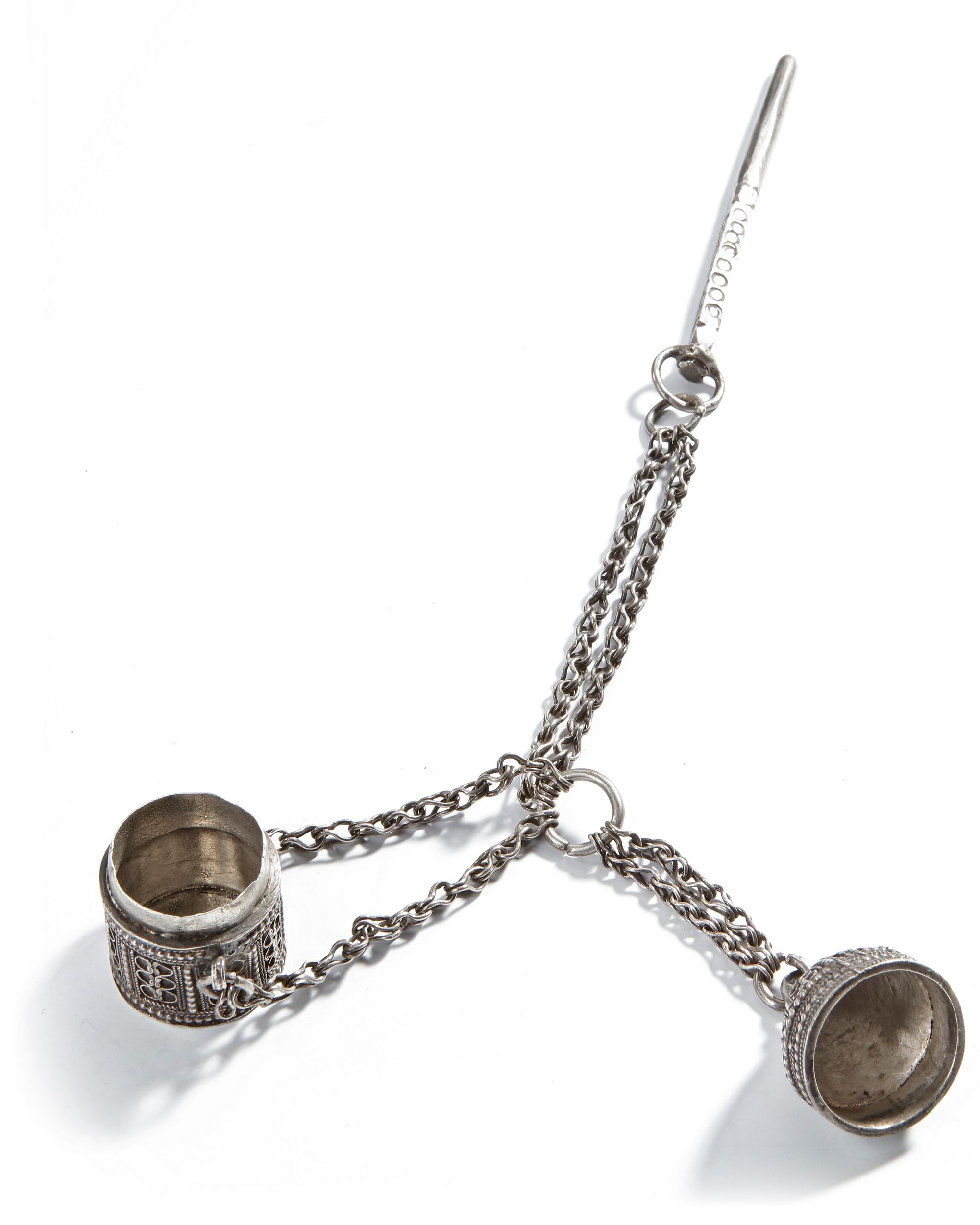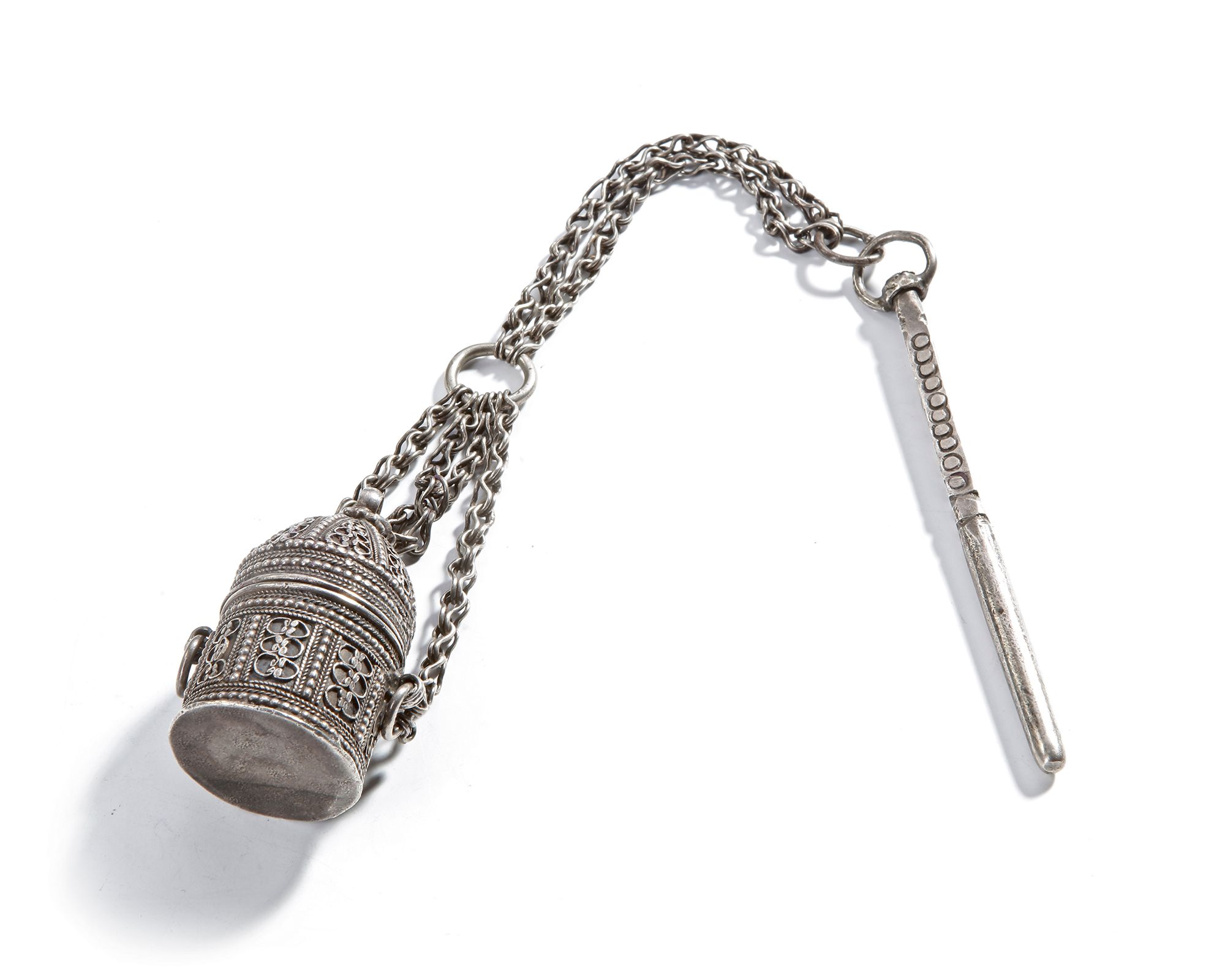 A 19th-century Omani silver kohl container, beautifully crafted with filigree decoration, suspension chains, and applicator, used for traditional eye cosmetic storage.