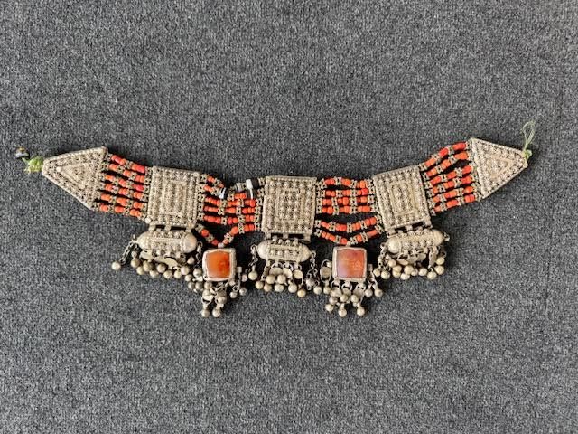 Richly decorated with intricate filigree panels, coral bead strands, and inset carnelian stones. The piece features hanging silver dangles and amulet-like elements.