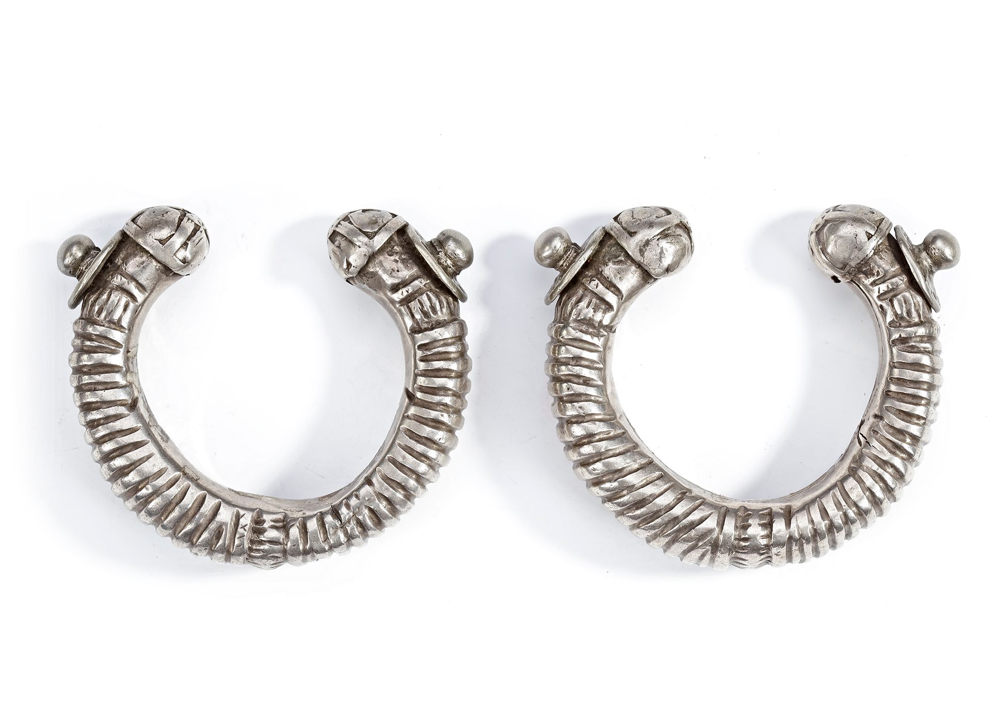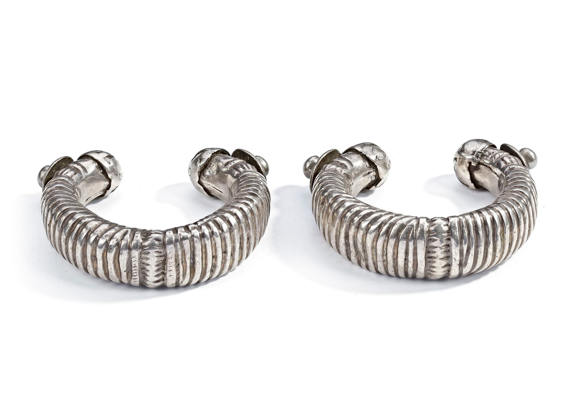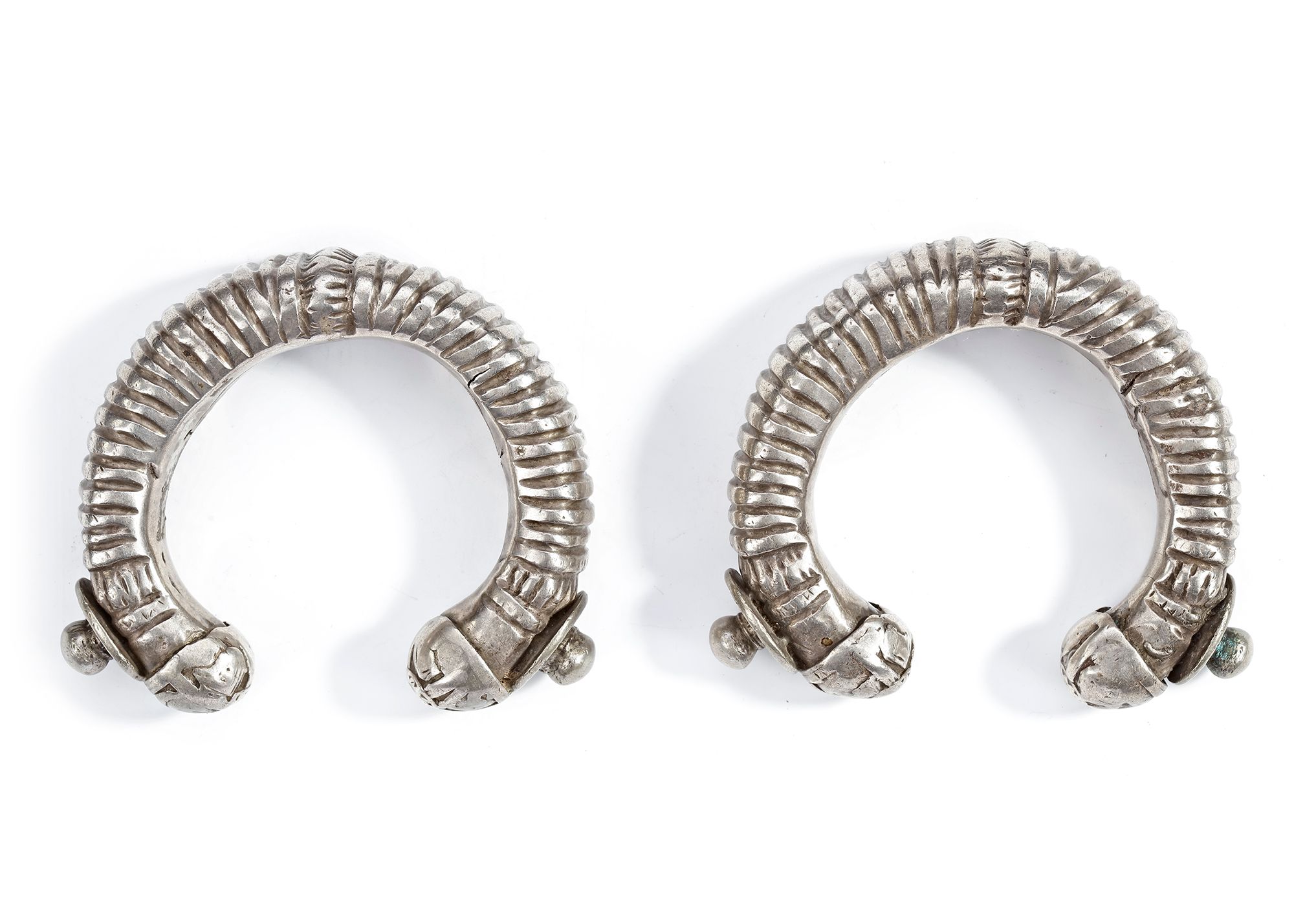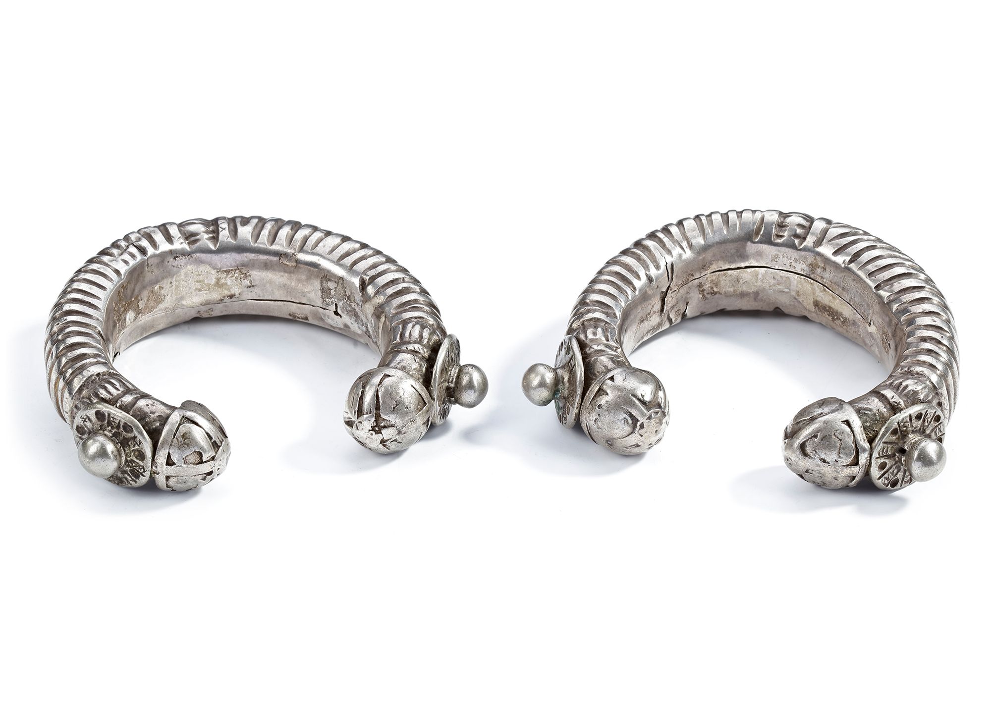 Afghan silver bracelets with bold ribbed designs along the body and prominent finial ends. ca. 9 cm. 185 gr. THE DR. SAAD AL-JADIR COLLECTION